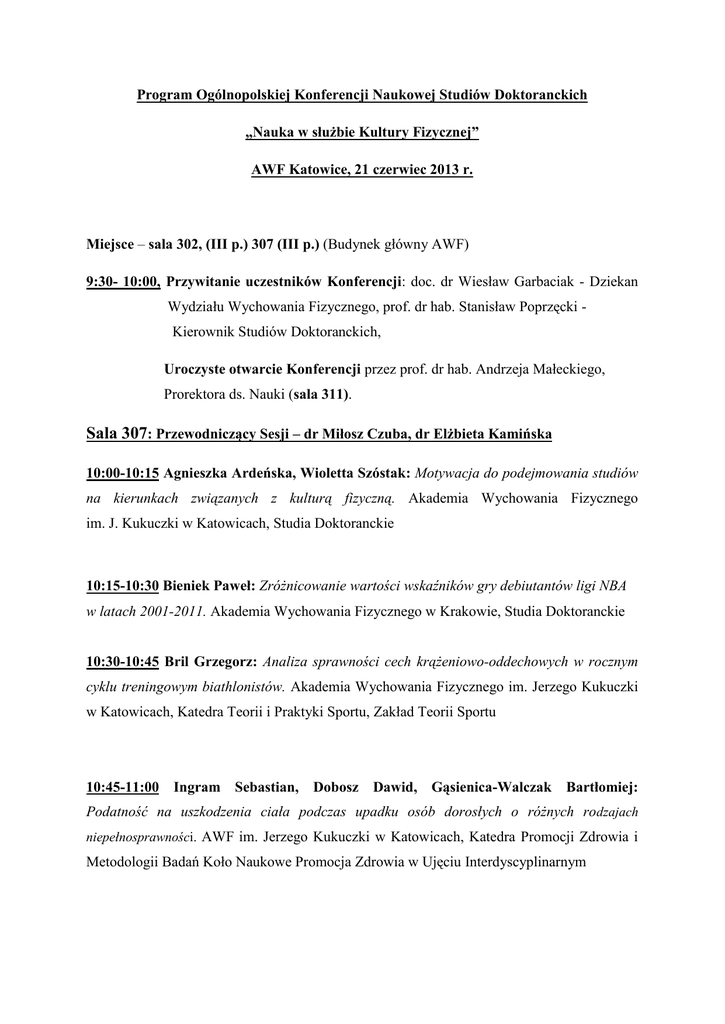 Program Ogólnopolskiej Konferencji Naukowej Studiów Doktoranckich „Nauka w służbie Kultury Fizycznej” AWF Katowice, 21 czerwiec 2013 r. Miejsce – sala 302, (III p.) 307 (III p.) (Budynek główny AWF) 9:30- 10:00, Przywitanie uczestników Konferencji: doc. dr Wiesław Garbaciak - Dziekan Wydziału Wychowania Fizycznego, prof. dr hab. Stanisław Poprzęcki Kierownik Studiów Doktoranckich, Uroczyste otwarcie Konferencji przez prof. dr hab. Andrzeja Małeckiego, Prorektora ds. Nauki (sala 311). Sala 307: Przewodniczący Sesji – dr Miłosz Czuba, dr Elżbieta Kamińska 10:00-10:15 Agnieszka Ardeńska, Wioletta Szóstak: Motywacja do podejmowania studiów na kierunkach związanych z kulturą fizyczną. Akademia Wychowania Fizycznego im. J. Kukuczki w Katowicach, Studia Doktoranckie 10:15-10:30 Bieniek Paweł: Zróżnicowanie wartości wskaźników gry debiutantów ligi NBA w latach 2001-2011. Akademia Wychowania Fizycznego w Krakowie, Studia Doktoranckie 10:30-10:45 Bril Grzegorz: Analiza sprawności cech krążeniowo-oddechowych w rocznym cyklu treningowym biathlonistów. Akademia Wychowania Fizycznego im. Jerzego Kukuczki w Katowicach, Katedra Teorii i Praktyki Sportu, Zakład Teorii Sportu 10:45-11:00 Ingram Sebastian, Dobosz Dawid, Gąsienica-Walczak Bartłomiej: Podatność na uszkodzenia ciała podczas upadku osób dorosłych o różnych rodzajach niepełnosprawności. AWF im. Jerzego Kukuczki w Katowicach, Katedra Promocji Zdrowia i Metodologii Badań Koło Naukowe Promocja Zdrowia w Ujęciu Interdyscyplinarnym 11:00-11:15 Drużbicka Anna, Sobota Grzegorz, Nowak Karina, Bacik Bogdan: Wpływ czasowej zmiany ustawienia ciała w kombinezonie „Adeli” na kontrolę postawy stojącej Akademia Wychowania Fizycznego im. J. Kukuczki w Katowicach, Katedra Motoryczności Człowieka, Zakład Biomechaniki 11:15-11:30. Gloc Dagmara1, Mikołajczyk Rafał2: Ocena wybranych parametrów wydolnościowych oraz biochemicznych pacjentów po przebytym zawale serca leczonych operacyjnie 1. Akademia Wychowania Fizycznego w Katowicach, Katedra Podstaw Fizjoterapii Klinicznej, Zakład Fizjoterapii w Chorobach Narządów Wewnętrznych2. Akademia Wychowania Fizycznego w Katowicach, Katedra Nauk FizjologicznoMedycznych, Zakład Fizjologii 11:30-11:45 Głuchowska Barbara: Ocena wpływu treningu wytrzymałościowego na ryzyko występowania astmy oskrzelowej u kobiet trenujących biegi narciarskie. Akademia Wychowania Fizycznego im. Jerzego Kukuczki, Katedra Nauk Fizjologiczno-Medycznych, Zakład Fizjologii 11:45-12:00 Kasolik Dawid, Filipczyk Przemysław: Skuteczność technik neurodynamicznych w usprawnianiu pacjentów z zespołem cieśni nadgarstka. Akademia Wychowania Fizycznego im. J. Kukuczki w Katowicach 12:00 -12:30 Przerwa 30 min (Coffee Time) sala 210 12:30-12:45 Klyszcz-Morciniec Król Małgorzata, Henryk, Sobota Grzegorz: Analiza porównawcza wolnego przewrotu w tył z miejsca w pozycji zgrupowanej (studium przypadku) Akademia Wychowania Fizycznego im. J. Kukuczki w Katowicach, Katedra Motoryczności Człowieka, Zakład Biomechaniki 12:45-13:00 Klyszcz-Morciniec Małgorzata, Smelcerz Małgorzata: Rys historyczny gimnastyki w Radlinie. Studia im. J. Kukuczki w Katowicach doktoranckie, Akademia Wychowania Fizycznego 13:00-13:15 Kowalczyk Agnieszka: Postawy młodzieży w wieku 12 - 16 lat wobec kultury fizycznej Studia Doktoranckie, AWF Katowice, Katedra Humanistycznych Podstaw Kultury Fizycznej, Zakład Pedagogiki i Psychologii 13:15-13:30 Mustafa Kamil, Furmanek Mariusz, Knapik Aleksandra, Bacik Bogdan: Wpływ masażu klasycznego na zdolność różnicowania siły mięśniowej. Akademia Wychowania Fizycznego im. Jerzego Kukuczki w Katowicach, Katedra Motoryczności Człowieka 13:30-13:45 1Zubik Mateusz, 1Pach Jakub, 1Augustyn Krzysztof, 2Kaźmierska Urszula: Zależność pomiędzy poziomem cech somatycznych i zdolności motorycznych a poziomem umiejętności techniczno-taktycznych u 13-letnich piłkarzy ręcznych MOSIR Bochnia. Akademia Wychowania Fizycznego w Krakowie, Zakład Gier Sportowych i Rekreacyjnych 1, Polski Uniwersytet na Obczyźnie w Londynie, Seminarium Doktoranckie2 13:45-14:00 Żak Agata: Analiza wydolności aerobowej instruktorek fitness-specjalizacja spinning na tle zawodniczek uprawiających kolarstwo szosowe. Akademia Wychowania Fizycznego im. J. Kukuczki w Katowicach, Zakład Fizjologii, Zakład Teorii Sportu 14:00 -14:15 Mikołowicz Damian, Betina Bursy, Tomik Rajmund: Program i warunki realizacji szkolnego wychowania fizycznego we wszystkich typach szkół województwa śląskiego. Akademia Wychowania Fizycznego im. Jerzego Kukuczki w Katowicach Katedra Turystyki Zakład Turystyki Aktywnej i Przygodowej Sala 302, IIIp Przewodniczący Sesji – dr Małgorzata Michalczyk, dr Sławomir Jagsz 10:00-10:15. Niestrój Maria: Aktywność fizyczna pracowników służby zdrowia aglomeracji górnośląskiej w świetle zaleceń prozdrowotnych. Katedra Rekreacji Akademii Wychowania Fizycznego im Jerzego Kukuczki w Katowicach 10:15-10:30 Orczyk Aneta1,2, Orczyk Marek2, Pieszczek Justyna, Pieszczek Łukasz: Skuteczność terapii aparatem vertetrac w aspekcie powracających dolegliwości bólowych kręgosłup” 1 Wyższa Szkoła Biznesu w Dąbrowie Górniczej, Wydział Zarządzania, Informatyki i Nauk Społecznych, Katedra Pedagogiki, Zakład Fizjoterapii. 2 Akademia Wychowania Fizycznego im. Jerzego Kukuczki w Katowicach, Wydział Fizjoterapii, Katedra Fizjoterapii w Chorobach Narządów Wewnętrznych, Zakład Fizjoterapii w Chorobach Narządów 10:30-10:45 Orczyk Marek1,3, Orczyk Aneta1,2 : Ocena skuteczności intensywnego treningu marszowego u pacjentów z ozw, leczonych angioplastyką naczyń wieńcowych w i etapie rehabilitacji kardiologicznej 1 Akademia Wychowania Fizycznego im. Jerzego Kukuczki w Katowicach, Wydział Fizjoterapii, Katedra Fizjoterapii w Chorobach Narządów Wewnętrznych, Zakład Fizjoterapii w Chorobach Narządów Wewnętrznych (studia doktoranckie,) 2Wyższa