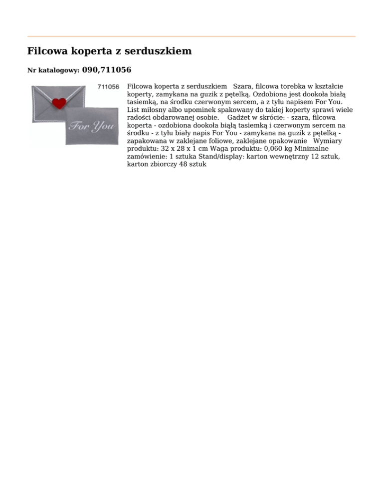 Filcowa koperta z serduszkiem Nr katalogowy: 090,711056 Filcowa koperta z serduszkiem Szara, filcowa torebka w kształcie koperty, zamykana na guzik z pętelką. Ozdobiona jest dookoła białą tasiemką, na środku czerwonym sercem, a z tyłu napisem For You. List miłosny albo upominek spakowany do takiej koperty sprawi wiele radości obdarowanej osobie. Gadżet w skrócie: - szara, filcowa koperta - ozdobiona dookoła biąłą tasiemką i czerwonym sercem na środku - z tyłu biały napis For You - zamykana na guzik z pętelką zapakowana w zaklejane foliowe, zaklejane opakowanie Wymiary produktu: 32 x 28 x 1 cm Waga produktu: 0,060 kg Minimalne zamówienie: 1 sztuka Stand/display: karton wewnętrzny 12 sztuk, karton zbiorczy 48 sztuk