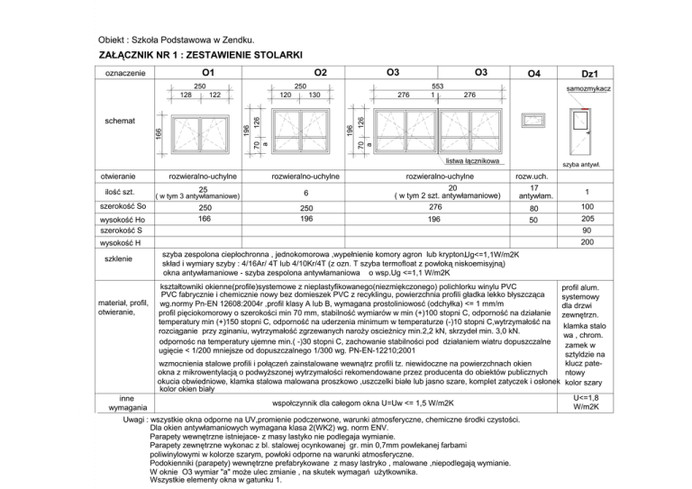Obiekt : Szkoła Podstawowa w Zendku. ZAŁĄCZNIK NR 1 : ZESTAWIENIE STOLARKI O1 250 O3 250 122 120 130 553 1 O4 samozmykacz 276 listwa łącznikowa otwieranie ilość szt. szerokość So wysokość Ho szerokość S rozwieralno-uchylne rozwieralno-uchylne 25 6 250 166 250 196 ( w tym 3 antywłamaniowe) rozwieralno-uchylne 20 ( w tym 2 szt. antywłamaniowe) szyba antywł. rozw.uch. 17 antywłam. 276 196 80 50 materiał, profil, otwieranie, inne wymagania 1 100 205 90 200 wysokość H szklenie Dz1 70 a 166 schemat 276 196 196 70 126 a 128 O3 O2 126 oznaczenie szyba zespolona ciepłochronna , jednokomorowa ,wypełnienie komory agron lub krypton,Ug<=1,1W/m2K skład i wymiary szyby : 4/16Ar/ 4T lub 4/10Kr/4T (z ozn. T szyba termofloat z powłoką niskoemisyjną) okna antywłamaniowe - szyba zespolona antywłamaniowa o wsp.Ug <=1,1 W/m2K kształtowniki okienne(profile)systemowe z nieplastyfikowanego(niezmiękczonego) polichlorku winylu PVC PVC fabrycznie i chemicznie nowy bez domieszek PVC z recyklingu, powierzchnia profili gładka lekko błyszcząca wg.normy Pn-EN 12608:2004r ,profil klasy A lub B, wymagana prostoliniowosć (odchyłka) <= 1 mm/m profil pięciokomorowy o szerokości min 70 mm, stabilność wymiarów w min (+)100 stopni C, odporność na działanie temperatury min (+)150 stopni C, odporność na uderzenia minimum w temperaturze (-)10 stopni C,wytrzymałość na rozciąganie przy zginaniu, wytrzymałość zgrzewanych naroży oscieżnicy min.2,2 kN, skrzydeł min. 3,0 kN. odpornośc na temperatury ujemne min.( -)30 stopni C, zachowanie stabilności pod działaniem wiatru dopuszczalne ugięcie < 1/200 mniejsze od dopuszczalnego 1/300 wg. PN-EN-12210;2001 profil alum. systemowy dla drzwi zewnętrzn. klamka stalo wa , chrom. zamek w sztyldzie na klucz patewzmocnienia stalowe profili i połączeń zainstalowane wewnątrz profili tz. niewidoczne na powierzchnach okien okna z mikrowentylacją o podwyższonej wytrzymałości rekomendowane przez producenta do obiektów publicznych ntowy okucia obwiedniowe, klamka stalowa malowana proszkowo ,uszczelki białe lub jasno szare, komplet zatyczek i osłonek kolor szary kolor okien biały U<=1,8 wspołczynnik dla całegom okna U=Uw <= 1,5 W/m2K W/m2K Uwagi : wszystkie okna odporne na UV,promienie podczerwone, warunki atmosferyczne, chemiczne środki czystości. Dla okien antywłamaniowych wymagana klasa 2(WK2) wg. norm ENV. Parapety wewnętrzne istniejace- z masy lastyko nie podlegaja wymianie. Parapety zewnętrzne wykonac z bl. stalowej ocynkowanej gr. min 0,7mm powlekanej farbami poliwinylowymi w kolorze szarym, powłoki odporne na warunki atmosferyczne. Podokienniki (parapety) wewnętrzne prefabrykowane z masy lastryko , malowane ,niepodlegają wymianie. W oknie O3 wymiar "a" może ulec zmianie , na skutek wymagań użytkownika. Wszystkie elementy okna w gatunku 1.