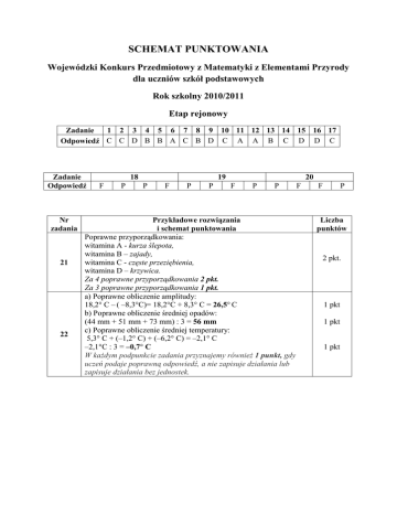 SCHEMAT PUNKTOWANIA Wojewódzki Konkurs Przedmiotowy z Matematyki z Elementami Przyrody dla uczniów szkół podstawowych Rok szkolny 2010/2011 Etap rejonowy Zadanie 1 2 3 4 5 6 7 8 9 10 11 12 13 14 15 16 17 Odpowiedź C C D B B A C B D C A A B C D D C Zadanie Odpowiedź Nr zadania 21 22 18 F P 19 P F P P 20 F P P Przykładowe rozwiązania i schemat punktowania Poprawne przyporządkowania: witamina A - kurza ślepota, witamina B – zajady, witamina C - częste przeziębienia, witamina D – krzywica. Za 4 poprawne przyporządkowania 2 pkt. Za 3 poprawne przyporządkowania 1 pkt. a) Poprawne obliczenie amplitudy: 18,2° C – ( –8,3°C)= 18,2°C + 8,3° C = 26,5° C b) Poprawne obliczenie średniej opadów: (44 mm + 51 mm + 73 mm) : 3 = 56 mm c) Poprawne obliczenie średniej temperatury: 5,3° C + (–1,2° C) + (–6,2° C) = –2,1° C –2,1°C : 3 = –0,7° C W kaŜdym podpunkcie zadania przyznajemy równieŜ 1 punkt, gdy uczeń podaje poprawną odpowiedź, a nie zapisuje działania lub zapisuje działania bez jednostek. F F P Liczba punktów 2 pkt. 1 pkt 1 pkt 1 pkt 23 24 Przykładowe rozwiązania: 1. sposób Odliczanie po jednym roku do momentu, aŜ zauwaŜona będzie wskazana zaleŜność między wiekiem ojca i dzieci: Obliczenie wieku Michała 12 + 6 = 18 12 + 1 + 18 + 1 = 32 48 + 1 = 49 12 + 2 + 18 + 2 = 34 48 + 2 = 50 …… 12 + 18 + 18 + 18 = 66 48 + 18 = 66 12 + 18 = 30 wiek Kasi za 18 lat 2. sposób Obliczenie sumy lat rodzeństwa 12 + 12 + 6 = 30 48 – 30 = 18 – róŜnica między wiekiem ojca i dzieci łącznie, x – liczba lat, które upłyną zanim wiek ojca będzie taki, jak suma lat dzieci 18 + x = 2x x = 18 (rozwiązanie równania moŜe być intuicyjne, wynikające z własności dodawania) 3. sposób 48 + x = 30 + 2x x = 18 12 + 18 = 30 wiek Kasi za 18 lat Punktowanie: Obliczenie wieku Michała lub wykorzystanie zapisu prowadzącego do tego. Obliczenie lub uzasadnienie, Ŝe tak się stanie za 18 lat, w tym: zastosowanie metody prowadzącej do obliczenia liczby lat – 1 pkt poprawne obliczenie liczby lat, które muszą upłynąć (18 lat) – 1 pkt. Obliczenie wieku Kasi za 18 lat (30 lat). Uwaga: Za kaŜde inne poprawne rozwiązanie zadania z uzasadnieniem uczeń otrzymuje 4 pkt. Przykładowe rozwiązania: 1. sposób 120 : 3 = 40 jabłek w kaŜdym koszyku po zmianach I koszyk: 40 + 8 = 48 II koszyk: 40 + 24 – 8 = 56 III koszyk: 40 – 24 = 16 Spr. 48 + 56 + 16 = 120 2. sposób 120 : 3 = 40 jabłek w kaŜdym koszu po zmianach x – liczba jabłek w koszu na początku I kosz: x – 8 = 40 x = 48 II kosz: x + 8 – 24 = 40 x = 56 1 pkt 2 pkt. 1 pkt 25 III kosz: x + 24 = 40 x = 16 Punktowanie: Obliczenie liczby jabłek (40) w kaŜdym koszyku po zakończeniu przekładania. Obliczenie liczby jabłek w poszczególnych koszykach (po 1 punkcie za poprawną liczbę jabłek w kaŜdym koszu). Uwaga: Za kaŜde inne poprawne rozwiązanie zadania z uzasadnieniem uczeń otrzymuje 4 pkt. Przykładowe rozwiązanie: Obliczenie pola powierzchni bocznej: 2 ⋅ 35m ⋅ 8m + 2 ⋅ 20 m ⋅ 8m = 880 m 2 Obliczenie pola powierzchni sufitu: 35m ⋅ 20 m = 700 m 2 2 Obliczenie pola powierzchni okien i drzwi: ⋅ 880m 2 = 352m 2 5 Obliczenie pola powierzchni do malowania: 880 m 2 − 352 m 2 + 700 m 2 = 1228 m 2 Obliczenie liczby litrów farby: 1228 : 8 = 153,5 Obliczenie liczby puszek 5-ciolitrowych 153,5 : 5 = 30,7 ≈ 31 Punktowanie: I. Poprawne obliczenie powierzchni do pomalowania (1228 m2) W tym: – obliczenie pola powierzchni ścian i sufitu – 2pkt., – obliczenie powierzchni okien i drzwi – 1 pkt, – obliczenie powierzchni do pomalowania – 1 pkt. II. Poprawne obliczenie liczby puszek farby (podana liczba puszek musi być całkowita). W tym: – obliczenie liczby litrów farby – 1 pkt, – obliczenie liczby puszek 5-ciolitrowych – 1 pkt. Uwaga: W przypadku, gdy uczeń popełni błąd rachunkowy w danym kryterium, to traci punkt w tym etapie rozwiązania. Kolejne etapy punktujemy z uwzględnieniem tego błędu. 1 pkt 3 pkt. 4 pkt. 2 pkt.