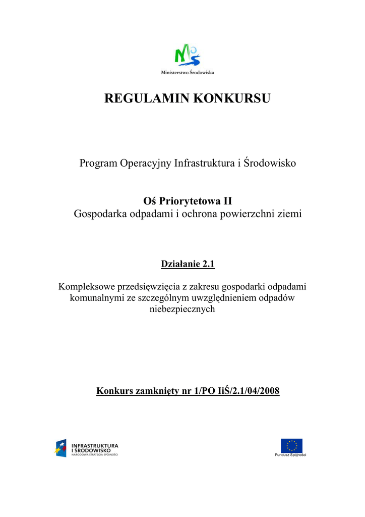 REGULAMIN KONKURSU Program Operacyjny Infrastruktura i Środowisko Oś Priorytetowa II Gospodarka odpadami i ochrona powierzchni ziemi Działanie 2.1 Kompleksowe przedsięwzięcia z zakresu gospodarki odpadami komunalnymi ze szczególnym uwzględnieniem odpadów niebezpiecznych Konkurs zamknięty nr 1/PO IiŚ/2.1/04/2008 Fundusz Spójności POSTANOWIENIA OGÓLNE 1) Niniejszy regulamin określa warunki na jakich odbywa się nabór wniosków o dofinansowanie projektów w trybie konkursowym w ramach Programu Operacyjnego Infrastruktura i Środowisko, dla Osi priorytetowej II – gospodarka odpadami i ochrona powierzchni ziemi, działanie 2.1 Kompleksowe przedsięwzięcia z zakresu gospodarki odpadami komunalnymi ze szczególnym uwzględnieniem odpadów niebezpiecznych. 2) Ministerstwo Środowiska, pełniące rolę Instytucji Pośredniczącej dla osi priorytetowych I – V w ramach Programu Operacyjnego Infrastruktura i Środowisko, ogłasza nabór wniosków o dofinansowanie projektów na podstawie art. 29 ust 1 ustawy z dnia 6 grudnia 2006 r. o zasadach prowadzenia polityki rozwoju (Dz.U. Nr 227, poz. 1658 z późn.zm.). 3) Kwota środków przeznaczonych na dofinansowanie w ramach niniejszego konkursu wynosi 100 000 000 euro (środki Funduszu Spójności). Jednocześnie ustanawia się rezerwę zabezpieczającą (dla projektów, które pozytywnie przejdą procedurę odwoławczą) w wysokości 25 000 000 euro. 4) Celem konkursu jest wyłonienie projektów, które w największym stopniu przyczynią się do osiągnięcia celów określonych w II osi priorytetowej PO IiŚ. 5) Poziom współfinansowania projektu ze środków Funduszu Spójności wynosi maksymalnie 85% wartości wydatków kwalifikowanych projektu. Poziom dofinansowania właściwy dla danego projektu zostanie określony zgodnie z Wytycznymi Ministra Rozwoju Regionalnego w zakresie wybranych zagadnień związanych z przygotowaniem projektów inwestycyjnych, w tym projektów generujących dochód. 6) Konkurs jest realizowany na terytorium Rzeczpospolitej Polskiej. 7) Konkurs przeprowadzany jest jawnie z zapewnieniem publicznego dostępu do informacji o zasadach jego przeprowadzania oraz do listy projektów wyłonionych do dofinansowania. 2 8) Ocena wniosków o dofinansowanie dokonywana jest w oparciu o Kryteria wyboru projektów, będące załącznikiem do Szczegółowego opisu priorytetów PO IiŚ. 9) Funkcję Instytucji Pośredniczącej II – ego stopnia (IP II) pełnią: Narodowy Fundusz Ochrony Środowiska i Gospodarki Wodnej (NFOŚiGW) – w przypadku projektów o koszcie całkowitym powyżej 25 mln euro; właściwy Wojewódzki Fundusz Ochrony Środowiska i Gospodarki Wodnej (WFOŚiGW) – w przypadku projektów o koszcie całkowitym poniżej 25 mln euro. Przeliczenia kosztu projektu z PLN na EUR dokonuje się w oparciu o kurs Europejskiego Banku Centralnego z przedostatniego dnia roboczego miesiąca poprzedzającego rozpoczęcie naboru wniosków. 10) Jeżeli porozumienie pomiędzy NFOŚiGW a WFOŚiGW stanowi o podziale projektów wg innych zasad, Wnioskodawca składa wniosek zgodnie z podziałem wskazanym w pkt. 9 a NFOŚiGW lub WFOŚiGW dokonują przekazania wniosku do właściwej instytucji. Informacja nt. podziału projektów zamieszczana jest na stronie internetowej www.ekoportal.gov.pl. UCZESTNICY KONKURSU 11) Do konkursu w ramach Działania 2.1 mogą przystąpić następujące podmioty: jednostki samorządu terytorialnego lub ich związki; podmioty świadczące usługi z zakresu zadań własnych jednostek samorządu terytorialnego. RODZAJE PROJEKTÓW 12) Celem działania 2.1 jest redukcja ilości składowanych odpadów komunalnych i zwiększenie udziału odpadów komunalnych poddawanych odzyskowi i unieszkodliwianiu innymi metodami niż składowanie oraz likwidacja zagrożeń wynikających ze składowania 3 odpadów zgodnie z krajowym i wojewódzkimi planami gospodarki odpadami. Rodzaje projektów podlegających dofinansowaniu wskazano w Szczegółowym opisie priorytetów PO IiŚ. PROCEDURA WYBORU PROJEKTÓW 13) Proces wyboru projektów w trybie konkursowym składa się z następujących etapów: Ogłoszenie o naborze wniosków; Nabór wniosków; Ocena formalna i merytoryczna I stopnia wniosków na poziomie IP II; Ocena merytoryczna I i II stopnia wniosków przez grupę roboczą na poziomie krajowym; Utworzenie listy rankingowej; Wydanie potwierdzenia przyznania dofinansowania dla projektów o wartości poniżej 25 mln euro przez IP, lub Przekazanie projektów o wartości powyżej 25 mln euro wraz z rekomendacją do Ministerstwa Rozwoju Regionalnego w celu przekazania do Komisji Europejskiej; Wydanie przez Komisję Europejską potwierdzenia decyzji o dofinansowaniu projektu; Ogłoszenie wyników konkursu; Podpisanie umów o dofinansowanie przez właściwe IP II. Ogłoszenie o naborze wniosków 14) Ogłoszenie o naborze wniosków ukazuje się na stronie internetowej Ministerstwa Środowiska oraz w dzienniku ogólnopolskim przynajmniej na 30 dni przed rozpoczęciem terminu składania wniosków. Nabór wniosków 15) Nabór wniosków o dofinansowanie rozpoczyna się i kończy w terminie wskazanym w ogłoszeniu o naborze wniosków. Wnioski należy składać do właściwej IP II, o której mowa w pkt. 9, w godzinach 9.00 – 15.00. 16) Wnioskodawca zobligowany jest do złożenia wniosku aplikacyjnego według wzoru umieszczonego na stronie internetowej www.ekoportal.gov.pl wraz z załącznikami w wersji elektronicznej oraz wersji papierowej w trzech egzemplarzach. 17) Przy sporządzaniu wniosku o dofinansowanie Wnioskodawca zobowiązany jest do korzystania z Generatora Wniosków oraz instrukcji do wypełniania formularza 4 wniosku o dofinansowanie w ramach PO IiŚ (dla osi priorytetowych I – III), która znajduje się na stronie internetowej www.ekoportal.gov.pl. 18) Aplikacja Generator Wniosków dostępna jest na stronie www.ekoportal.gov.pl i nie wymaga instalowana na komputerze wnioskodawcy. Poprawnie wypełniony wniosek o