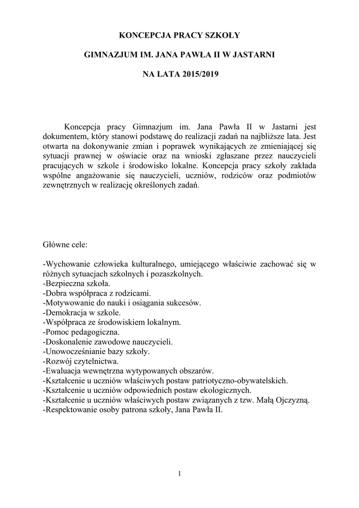 KONCEPCJA PRACY SZKOŁY GIMNAZJUM IM. JANA PAWŁA II W JASTARNI NA LATA 2015/2019 Koncepcja pracy Gimnazjum im. Jana Pawła II w Jastarni jest dokumentem, który stanowi podstawę do realizacji zadań na najbliższe lata. Jest otwarta na dokonywanie zmian i poprawek wynikających ze zmieniającej się sytuacji prawnej w oświacie oraz na wnioski zgłaszane przez nauczycieli pracujących w szkole i środowisko lokalne. Koncepcja pracy szkoły zakłada wspólne angażowanie się nauczycieli, uczniów, rodziców oraz podmiotów zewnętrznych w realizację określonych zadań. Główne cele: -Wychowanie człowieka kulturalnego, umiejącego właściwie zachować się w różnych sytuacjach szkolnych i pozaszkolnych. -Bezpieczna szkoła. -Dobra współpraca z rodzicami. -Motywowanie do nauki i osiągania sukcesów. -Demokracja w szkole. -Współpraca ze środowiskiem lokalnym. -Pomoc pedagogiczna. -Doskonalenie zawodowe nauczycieli. -Unowocześnianie bazy szkoły. -Rozwój czytelnictwa. -Ewaluacja wewnętrzna wytypowanych obszarów. -Kształcenie u uczniów właściwych postaw patriotyczno-obywatelskich. -Kształcenie u uczniów odpowiednich postaw ekologicznych. -Kształcenie u uczniów właściwych postaw związanych z tzw. Małą Ojczyzną. -Respektowanie osoby patrona szkoły, Jana Pawła II. 1 I Działalność dydaktyczna, wychowawcza i opiekuńcza szkoły oraz inna działalność statutowa szkoły. 1. Działalność dydaktyczna szkoły: a) Oferta edukacyjna szkoły opiera się na podstawie programowej i jest wzbogacana dla potrzeb uczniów. b) Postępy uczniów oceniane są zgodnie z WSO. c) Osiągnięcia uczniów monitoruje się i prezentuje na forum szkoły ( apele z wręczeniem nagród, strona internetowa, gablota ścienna). d) Szkoła zwiększa szanse edukacyjne uczniów poprzez koła zainteresowań, zajęcia przygotowujące uczniów klas trzecich do egzaminu gimnazjalnego, zajęcia wyrównawcze, terapeutyczne i sportowe( w miarę możliwości finansowych szkoły). e) Wyniki egzaminów gimnazjalnych są analizowane, a ich wnioski wdrażane( co roku). f) W ramach ewaluacji wewnątrzszkolnej placówka analizuje wyniki egzaminów zewnętrznych z zastosowaniem EWD- Edukacyjnej Wartości Dodanej ( termin do uzgodnienia po otrzymaniu wyników). g) Szkoła organizuje sprawdziany i egzaminy próbne. h) Gimnazjum organizuje spotkania z rodzicami uczniów, w przypadku trzecioklasistów- w celu omówienia ocen po próbnym egzaminie gimnazjalnym- omówienia wyników egzaminów próbnych. i) Szkoła wspiera działania Samorządu Uczniowskiego. j) Szkoła motywuje uczniów w procesie uczenia się. k) Placówka organizuje wyjazdy młodzieży na ponadgimnazjalnych. 2 tzw. Dni Otwarte do szkól l) Zadaniem nauczycieli przedmiotów jest stworzenie listy wymagań edukacyjnych na poszczególne oceny, Przedmiotowego Systemu Oceniania ( każdy wrzesień). ł) Jedną ze strategii jest promowanie szkoły i jej osiągnięć w lokalnych mediach, na stronie WWW szkoły., na spotkaniach z rodzicami, a także w czasie uroczystości szkolnych. m) Nauczyciele współpracują w zespołach przedmiotowych i wychowawczych. n) W szkole przeprowadza się ewaluację wewnętrzną na podstawie wniosków z nadzoru pedagogicznego i priorytetów MEN i Kuratorium; typowane obszary: ewaluacja Koncepcji Pracy Szkoły (październik 2015), ewaluacja wyników egzaminów gimnazjalnych pod kątem EWD ( corocznie). o) Prowadzi się działania wzbogacające warunki lokalowe i wyposażenie szkoły w celu osiągnięcia jeszcze lepszej jakości pracy szkoły. o 1) Dbanie o sprzęt szkolny i pomoce dydaktyczne. o2) Wzbogacanie bazy dydaktycznej szkoły (w miarę możliwości finansowych szkoły). o3) Zakup lektur i książek do biblioteki (w miarę możliwości finansowych szkoły). o4 ) Pozyskiwanie i wypożyczanie uczniom podręczników szkolnych finansowanych przez MEN. Udostępnianie ćwiczeń. p) Dydaktyczna praca bibliotekarza szkolnego. r) Dydaktyczna praca pedagoga szkolnego. s) Dydaktyczna praca w zakresie terapii pedagogicznej, socjoterapii. t) Udział nauczycieli w różnych formach doskonalenia zawodowego ( stopnie awansu zawodowego, szkolenie wewnętrzne i zewnętrzne). 2. Działalność wychowawcza i opiekuńcza szkoły. a) Podejmowane są działania wychowawcze, opiekuńcze i profilaktyczne, mające eliminować zagrożenia i wzmacniać asertywność uczniów i kształtować ich właściwe zachowania. b) Realizowane są programy: wychowawczy i profilaktyczny oraz promocji zdrowia c) W szkole przeprowadza się ewaluację wewnętrzną na podstawie wniosków z nadzoru pedagogicznego i priorytetów MEN i Kuratorium; typowany obszar dydaktycznoopiekuńczy: „Badanie poczucia bezpieczeństwa uczniów w szkole, postaw 3 prozdrowotnych ( szczególnie uzależnień) i klimatu panującego w szkole”( rok szkolny 2015/2016) d) Promowany jest zdrowy tryb życia w czasie corocznych Dni Profilaktyki- -„Dziękuję, nie piję, nie palę, nie biorę...” poprzez spotkania z terapeutami, pogadanki wychowawcze, projekcję filmów profilaktycznych, konkursy ( listopad lub inny miesiąc wskazany przed dyrektora szkoły). e) Szkoła sprawuje opiekę nad dziećmi z orzeczeniami PPP. f) Pedagog szkolny realizuje swój roczny plan pracy. g) Praca socjoterapeutyczna. h) Szkoła współpracuje z instytucjami i organizacjami, które wspierają pracę wychowawczą szkoły ; są to: 1. Urząd Miasta w Jastarni, 2. Zrzeszenie Kaszubsko-Pomorskie, 3. MOKSiR w Jastarni, 4. Komisja ds. Rozwiązywania Problemów Alkoholowych, 5. Kościół Parafialny, 6. Poradnia Psychologiczno-Pedagogiczna w Pucku, 7. Komenda Powiatowa Policji w Pucku, 8. Przychodnia „Jasmed” w Jastarni, 9. UKS „Delfin”, 10. UKS „Jastarnia”, 11. Powiatowy Ośrodek Sportu Młodzieżowego w Pucku. 12. MOPS w Jastarni 13. Ochotnicza Straż Pożarna w Jastarni 14. ewentualne inne i )Szkoła pielęgnuje u uczniów uczucia patriotyczne w stosunku do Ojczyzny. i1) Szerzy wiedzę nt. 