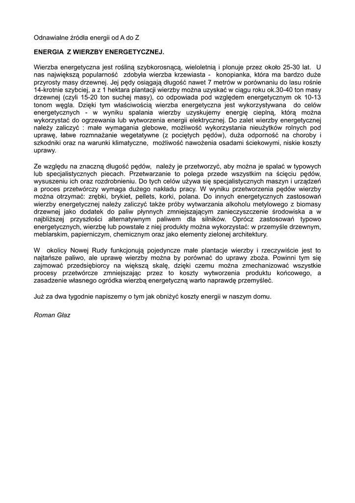 Odnawialne źródła energii od A do Z ENERGIA Z WIERZBY ENERGETYCZNEJ. Wierzba energetyczna jest rośliną szybkorosnącą, wieloletnią i plonuje przez około 25-30 lat. U nas największą popularność zdobyła wierzba krzewiasta - konopianka, która ma bardzo duże przyrosty masy drzewnej. Jej pędy osiągają długość nawet 7 metrów w porównaniu do lasu rośnie 14-krotnie szybciej, a z 1 hektara plantacji wierzby można uzyskać w ciągu roku ok.30-40 ton masy drzewnej (czyli 15-20 ton suchej masy), co odpowiada pod względem energetycznym ok 10-13 tonom węgla. Dzięki tym właściwością wierzba energetyczna jest wykorzystywana do celów energetycznych - w wyniku spalania wierzby uzyskujemy energię cieplną, którą można wykorzystać do ogrzewania lub wytworzenia energii elektrycznej. Do zalet wierzby energetycznej należy zaliczyć : małe wymagania glebowe, możliwość wykorzystania nieużytków rolnych pod uprawę, łatwe rozmnażanie wegetatywne (z pociętych pędów), duża odporność na choroby i szkodniki oraz na warunki klimatyczne, możliwość nawożenia osadami ściekowymi, niskie koszty uprawy. Ze względu na znaczną długość pędów, należy je przetworzyć, aby można je spalać w typowych lub specjalistycznych piecach. Przetwarzanie to polega przede wszystkim na ścięciu pędów, wysuszeniu ich oraz rozdrobnieniu. Do tych celów używa się specjalistycznych maszyn i urządzeń a proces przetwórczy wymaga dużego nakładu pracy. W wyniku przetworzenia pędów wierzby można otrzymać: zrębki, brykiet, pellets, korki, polana. Do innych energetycznych zastosowań wierzby energetycznej należy zaliczyć także próby wytwarzania alkoholu metylowego z biomasy drzewnej jako dodatek do paliw płynnych zmniejszającym zanieczyszczenie środowiska a w najbliższej przyszłości alternatywnym paliwem dla silników. Oprócz zastosowań typowo energetycznych, wierzbę lub powstałe z niej produkty można wykorzystać: w przemyśle drzewnym, meblarskim, papierniczym, chemicznym oraz jako elementy zielonej architektury. W okolicy Nowej Rudy funkcjonują pojedyncze małe plantacje wierzby i rzeczywiście jest to najtańsze paliwo, ale uprawę wierzby można by porównać do uprawy zboża. Powinni tym się zajmować przedsiębiorcy na większą skalę, dzięki czemu można zmechanizować wszystkie procesy przetwórcze zmniejszając przez to koszty wytworzenia produktu końcowego, a zasadzenie własnego ogródka wierzbą energetyczną warto naprawdę przemyśleć. Już za dwa tygodnie napiszemy o tym jak obniżyć koszty energii w naszym domu. Roman Głaz