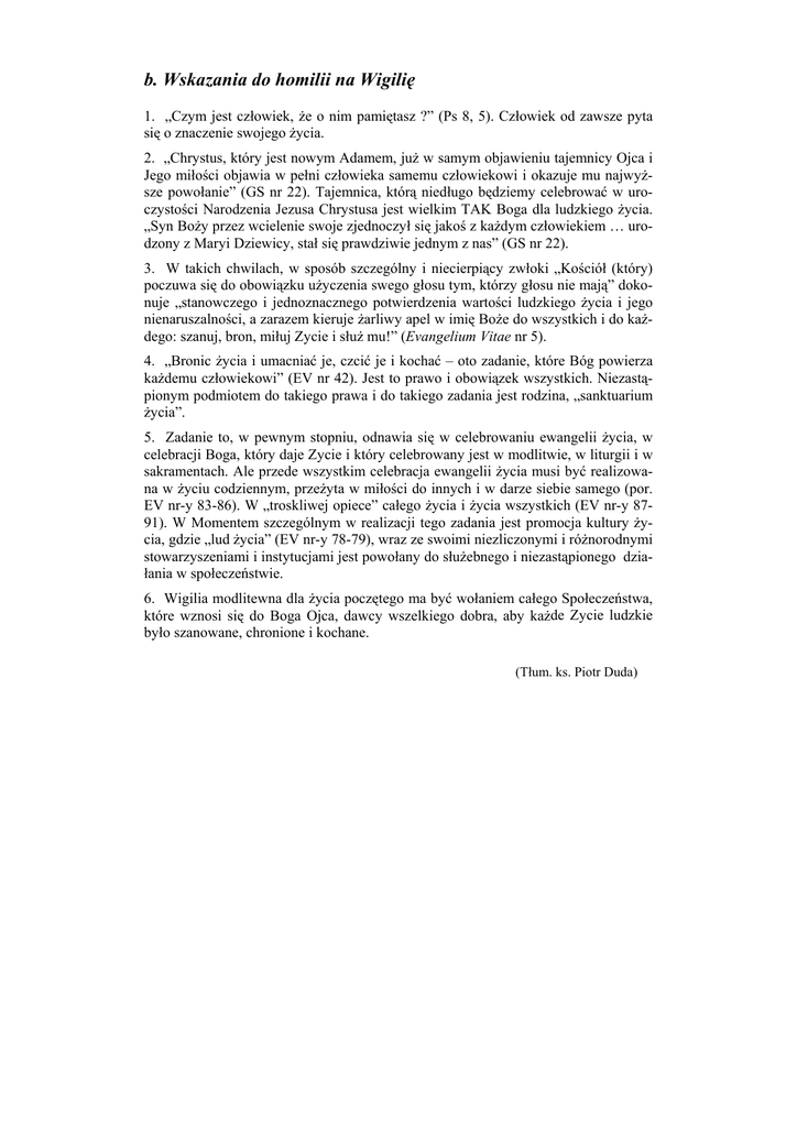 b. Wskazania do homilii na Wigilię 1. „Czym jest człowiek, że o nim pamiętasz ?” (Ps 8, 5). Człowiek od zawsze pyta się o znaczenie swojego życia. 2. „Chrystus, który jest nowym Adamem, już w samym objawieniu tajemnicy Ojca i Jego miłości objawia w pełni człowieka samemu człowiekowi i okazuje mu najwyższe powołanie” (GS nr 22). Tajemnica, którą niedługo będziemy celebrować w uroczystości Narodzenia Jezusa Chrystusa jest wielkim TAK Boga dla ludzkiego życia. „Syn Boży przez wcielenie swoje zjednoczył się jakoś z każdym człowiekiem … urodzony z Maryi Dziewicy, stał się prawdziwie jednym z nas” (GS nr 22). 3. W takich chwilach, w sposób szczególny i niecierpiący zwłoki „Kościół (który) poczuwa się do obowiązku użyczenia swego głosu tym, którzy głosu nie mają” dokonuje „stanowczego i jednoznacznego potwierdzenia wartości ludzkiego życia i jego nienaruszalności, a zarazem kieruje żarliwy apel w imię Boże do wszystkich i do każdego: szanuj, bron, miłuj Zycie i służ mu!” (Evangelium Vitae nr 5). 4. „Bronic życia i umacniać je, czcić je i kochać – oto zadanie, które Bóg powierza każdemu człowiekowi” (EV nr 42). Jest to prawo i obowiązek wszystkich. Niezastąpionym podmiotem do takiego prawa i do takiego zadania jest rodzina, „sanktuarium życia”. 5. Zadanie to, w pewnym stopniu, odnawia się w celebrowaniu ewangelii życia, w celebracji Boga, który daje Zycie i który celebrowany jest w modlitwie, w liturgii i w sakramentach. Ale przede wszystkim celebracja ewangelii życia musi być realizowana w życiu codziennym, przeżyta w miłości do innych i w darze siebie samego (por. EV nr-y 83-86). W „troskliwej opiece” całego życia i życia wszystkich (EV nr-y 8791). W Momentem szczególnym w realizacji tego zadania jest promocja kultury życia, gdzie „lud życia” (EV nr-y 78-79), wraz ze swoimi niezliczonymi i różnorodnymi stowarzyszeniami i instytucjami jest powołany do służebnego i niezastąpionego działania w społeczeństwie. 6. Wigilia modlitewna dla życia poczętego ma być wołaniem całego Społeczeństwa, które wznosi się do Boga Ojca, dawcy wszelkiego dobra, aby każde Zycie ludzkie było szanowane, chronione i kochane. (Tłum. ks. Piotr Duda)
