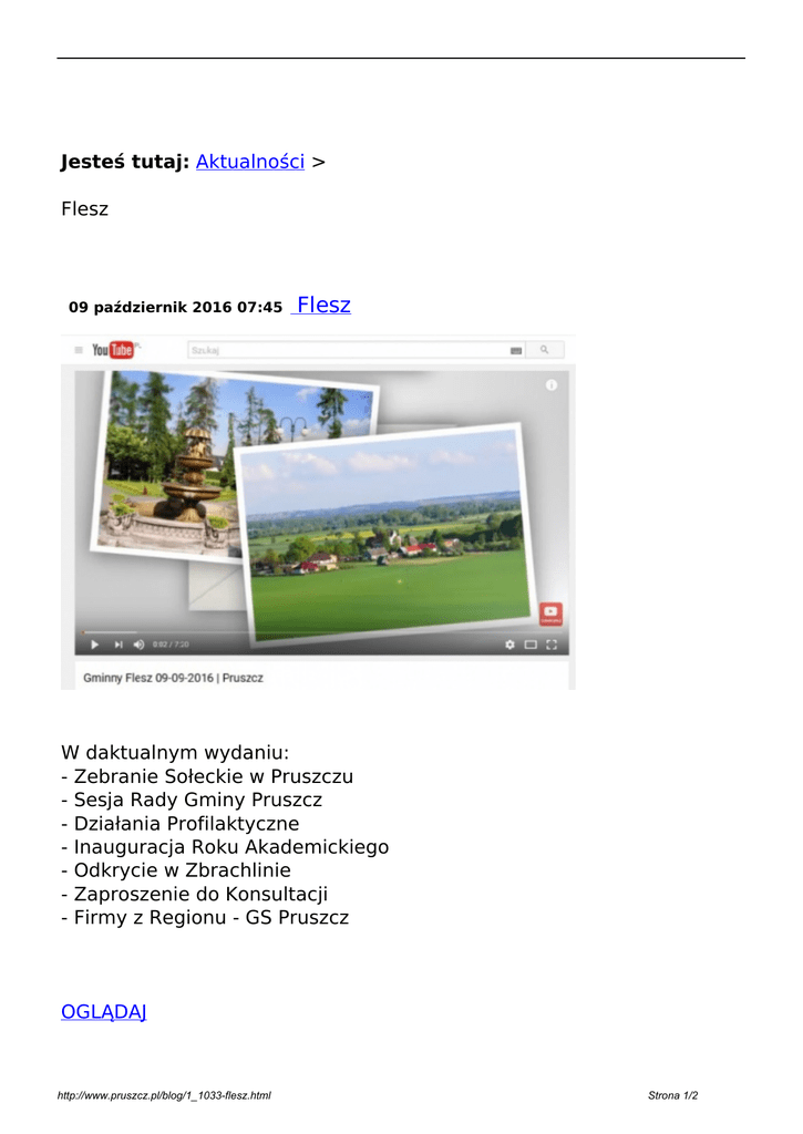 Jesteś tutaj: Aktualności > Flesz 09 październik 2016 07:45 Flesz W daktualnym wydaniu: - Zebranie Sołeckie w Pruszczu - Sesja Rady Gminy Pruszcz - Działania Profilaktyczne - Inauguracja Roku Akademickiego - Odkrycie w Zbrachlinie - Zaproszenie do Konsultacji - Firmy z Regionu - GS Pruszcz OGLĄDAJ http://www.pruszcz.pl/blog/1_1033-flesz.html Strona 1/2 drukuj Wróć http://www.pruszcz.pl/blog/1_1033-flesz.html Powered by TCPDF (www.tcpdf.org) Strona 2/2