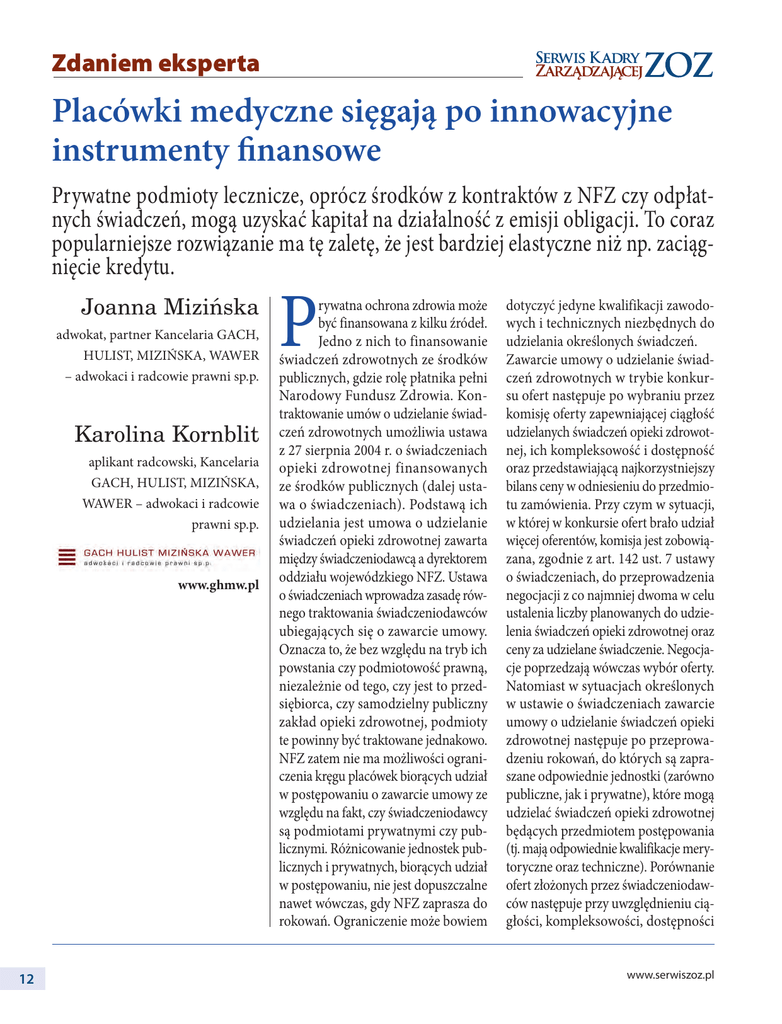Zdaniem eksperta Placówki medyczne sięgają po innowacyjne instrumenty finansowe Prywatne podmioty lecznicze, oprócz środków z kontraktów z NFZ czy odpłatnych świadczeń, mogą uzyskać kapitał na działalność z emisji obligacji. To coraz popularniejsze rozwiązanie ma tę zaletę, że jest bardziej elastyczne niż np. zaciągnięcie kredytu. Joanna Mizińska adwokat, partner Kancelaria GACH, HULIST, MIZIŃSKA, WAWER – adwokaci i radcowie prawni sp.p. Karolina Kornblit aplikant radcowski, Kancelaria GACH, HULIST, MIZIŃSKA, WAWER – adwokaci i radcowie prawni sp.p. www.ghmw.pl 12 P rywatna ochrona zdrowia może być finansowana z kilku źródeł. Jedno z nich to finansowanie świadczeń zdrowotnych ze środków publicznych, gdzie rolę płatnika pełni Narodowy Fundusz Zdrowia. Kontraktowanie umów o udzielanie świadczeń zdrowotnych umożliwia ustawa z 27 sierpnia 2004 r. o świadczeniach opieki zdrowotnej finansowanych ze środków publicznych (dalej ustawa o świadczeniach). Podstawą ich udzielania jest umowa o udzielanie świadczeń opieki zdrowotnej zawarta między świadczeniodawcą a dyrektorem oddziału wojewódzkiego NFZ. Ustawa o świadczeniach wprowadza zasadę równego traktowania świadczeniodawców ubiegających się o zawarcie umowy. Oznacza to, że bez względu na tryb ich powstania czy podmiotowość prawną, niezależnie od tego, czy jest to przedsiębiorca, czy samodzielny publiczny zakład opieki zdrowotnej, podmioty te powinny być traktowane jednakowo. NFZ zatem nie ma możliwości ograniczenia kręgu placówek biorących udział w postępowaniu o zawarcie umowy ze względu na fakt, czy świadczeniodawcy są podmiotami prywatnymi czy publicznymi. Różnicowanie jednostek publicznych i prywatnych, biorących udział w postępowaniu, nie jest dopuszczalne nawet wówczas, gdy NFZ zaprasza do rokowań. Ograniczenie może bowiem dotyczyć jedyne kwalifikacji zawodowych i technicznych niezbędnych do udzielania określonych świadczeń. Zawarcie umowy o udzielanie świadczeń zdrowotnych w trybie konkursu ofert następuje po wybraniu przez komisję oferty zapewniającej ciągłość udzielanych świadczeń opieki zdrowotnej, ich kompleksowość i dostępność oraz przedstawiającą najkorzystniejszy bilans ceny w odniesieniu do przedmiotu zamówienia. Przy czym w sytuacji, w której w konkursie ofert brało udział więcej oferentów, komisja jest zobowiązana, zgodnie z art. 142 ust. 7 ustawy o świadczeniach, do przeprowadzenia negocjacji z co najmniej dwoma w celu ustalenia liczby planowanych do udzielenia świadczeń opieki zdrowotnej oraz ceny za udzielane świadczenie. Negocjacje poprzedzają wówczas wybór oferty. Natomiast w sytuacjach określonych w ustawie o świadczeniach zawarcie umowy o udzielanie świadczeń opieki zdrowotnej następuje po przeprowadzeniu rokowań, do których są zapraszane odpowiednie jednostki (zarówno publiczne, jak i prywatne), które mogą udzielać świadczeń opieki zdrowotnej będących przedmiotem postępowania (tj. mają odpowiednie kwalifikacje merytoryczne oraz techniczne). Porównanie ofert złożonych przez świadczeniodawców następuje przy uwzględnieniu ciągłości, kompleksowości, dostępności www.serwiszoz.pl Finanse oraz jakości udzielanych świadczeń. Brane są pod uwagę również kwalifikacje personelu, wyposażenie w sprzęt, aparaturę medyczną, oraz cena i liczba oferowanych świadczeń opieki zdrowotnej przy uwzględnieniu kalkulacji kosztów. A zatem podstawą zawierania umów o udzielanie świadczeń opieki zdrowotnej są możliwości jednostek, zarówno publicznych, jak i prywatnych, związane z posiadanymi kwalifikacjami zawodowymi i technicznymi (dysponowanie odpowiednim sprzętem medycznym), a nie podstawa ich funkcjonowania. Jednak ze względu na fakt, że NFZ jest jedynym, funkcjonującym na rynku, płatnikiem świadczeń opieki zdrowotnej ze środków budżetu państwa, ryzyko prowadzenia prywatnej działalności jedynie na podstawie tych środków jest dosyć spore. Szczególnie istotne problemy pojawiają się z tzw. nadwykonaniami, czyli liczbą świadczeń udzielonych przez podmioty medyczne ponad limit wynikający z umowy, za które NFZ z reguły odmawia płatności (wyjątek stanowią tutaj świadczenia udzielone w stanach nagłych, gdy zagrożone jest życie lub zdrowie). Istnieje jednak możliwość wystąpienia przeciwko NFZ na drogę sądową o zapłatę za tak udzielone świadczenia. Nie jest to oczywiście łatwe, przepisy nie sprzyjają bowiem świadczeniodawcom. Jednak nie jest też niemożliwe. Obligacje – elastyczna forma pozyskania finansowania Podmioty udzielające świadczeń medycznych mogą finansować swoją działalność ze źródeł zewnętrznych. Jedną z możliwości jest pozyskanie kredytu czy zaciągnięcia pożyczki. Podmioty te, jeśli mają osobowość prawną, mogą również emitować obligacje. Jest to dużo bardziej elastyczna forma pozyskania kapitału niż zaciągnięcie sierpień 2013 kredytu bankowego. Dodatkowo emitent takich obligacji (spółka prowadząca np. prywatny szpital) ma możliwość ich zabezpieczenia np. na wierzytelnościach wynikających z kontraktu z NFZ. Emisja obligacji wymaga przygotowania dokumentacji prawnej, zgodnie z zapisami ustawy 29 czerwca 1995 r. o obligacjach. Nie jest to jednak procedura na tyle skomplikowana, aby z założenia rezygnować z takiego sposobu finansowania prowadzonej działalności. W celu emisji obligacji emitent musi podjąć stosowną uchwałę. Będzie nią uchwała zarządu (w przypadku standardowych obligacji), uchwała walnego zgromadzenia lub zgromadzenia wspólników (w przypadku gdy statut lub umowa spółki tak stanowi). Następnie konieczne staje się przygotowanie propozycji nabycia takich obligacji oraz wydanie obligatariuszom (czyli zainteresowanym nabyciem takich obligacji) dokumentu obligacji. Obecność na giełdzie Ostatnio kilka podmiotów świadczących usługi medyczne wy