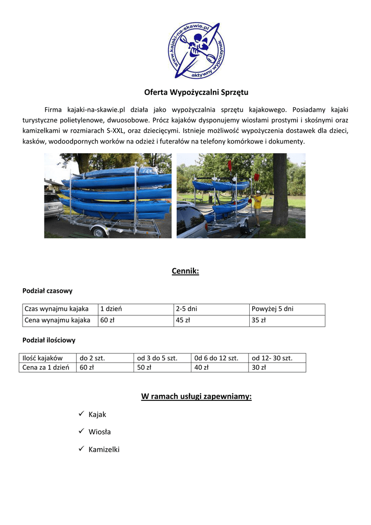 Oferta Wypożyczalni Sprzętu Firma kajaki-na-skawie.pl działa jako wypożyczalnia sprzętu kajakowego. Posiadamy kajaki turystyczne polietylenowe, dwuosobowe. Prócz kajaków dysponujemy wiosłami prostymi i skośnymi oraz kamizelkami w rozmiarach S-XXL, oraz dziecięcymi. Istnieje możliwość wypożyczenia dostawek dla dzieci, kasków, wodoodpornych worków na odzież i futerałów na telefony komórkowe i dokumenty. Cennik: Podział czasowy Czas wynajmu kajaka 1 dzień 2-5 dni Powyżej 5 dni Cena wynajmu kajaka 60 zł 45 zł 35 zł Podział ilościowy Ilość kajaków Cena za 1 dzień do 2 szt. 60 zł od 3 do 5 szt. 50 zł 0d 6 do 12 szt. 40 zł W ramach usługi zapewniamy: Kajak Wiosła Kamizelki od 12- 30 szt. 30 zł Dodatkowo proponujemy: Dostawka dziecięca - 10zł/sztuka Wodoodporne worki na odzież - 10zł/sztuka Wodoodporne futerały na komórki – 5zł/ sztuka Kask – 10zł/ sztuka Transport sprzętu – 1,5 zł/ km