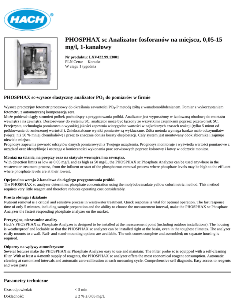 PHOSPHAX sc Analizator fosforanów na miejscu, 0,05-15 mg/l, 1-kanałowy Nr produktu: LXV422.99.13001 PLN Cena: Kontakt W ciągu 1 tygodnia PHOSPHAX sc-wysoce elastyczny analizator PO4 do pomiarów w firmie Wysoce precyzyjny fotometr procesowy do określania zawartości PO4-P metodą żółtą z wanadomolibdenianem. Pomiar z wykorzystaniem fotometru z automatyczną kompensacją zera. Może pobierać ciągły strumień próbek pochodzący z przygotowania próbki. Analizator jest wyposażony w izolowaną obudowę do montażu wewnątrz i na zewnątrz. Dostosowany do systemu SC, analizator może być łączony ze wszystkimi czujnikami poprzez przetwornik SC. Przejrzysta, technologia pomiarowa o wysokiej jakości zapewnia wiarygodne wartości w najkrótszych czasach reakcji (tylko 5 minut od próbkowania do zmierzonej wartości!). Zniekształcone wyniki pomiarów są wykluczane. Żółta metoda wymaga bardzo mało odczynników (więcej niż 50 % mniej chemikaliów) i przez to znacznie obniża koszty eksploatacji. Cały system jest montowany obok zbiornika i zajmuje niewiele miejsca. Prognosys zapewnia pewność odczytów danych pomiarowych z Twojego urządzenia. Prognosys monitoruje i wyświetla wartości pomiarowe z urządzeń oraz identyfikuje i ostrzega o konieczności wykonania prac serwisowych poprzez kolorowy i łatwy w odczycie monitor. Montaż na ścianie, na poręczy oraz na statywie wewnątrz i na zewnątrz. With detection limits as low as 0.05 mg/L and as high as 50 mg/L, the PHOSPHAX sc Phosphate Analyzer can be used anywhere in the wastewater treatment process, from the influent or start of the phosphorous removal process where phosphate levels may be high to the effluent where phosphate levels are at their lowest. Opcjonalna wersja 2-kanałowa do ciągłego przygotowania próbki. The PHOSPHAX sc analyzer determines phosphate concentration using the molybdovanadate yellow colorimetric method. This method requires very little reagent and therefore reduces operating cost considerably. Prosta obsługa i działanie Nutrient removal is a critical and sensitive process in wastewater treatment. Quick response is vital for optimal operation. The fast response time of only 5 minutes, including sample preparation and the ability to choose the measurement interval, make the PHOSPHAX sc Phosphate Analyzer the fastest responding phosphate analyzer on the market. Precyzyjne, niezawodne analizy Hach's PHOSPHAX sc Phosphate Analyzer is designed to be installed at the measurement point (including outdoor installations). The housing is weatherproof and lockable so that the PHOSPHAX sc analyzer can be installed right at the basin, even in the toughest climates. The analyzer easily mounts to a wall. Rail- and stand-mounting options are available. The unit comes complete and assembled; no separate housing is required. Odporny na wpływy atmosferyczne Several features make the PHOSPHAX sc Phosphate Analyzer easy to use and maintain: The Filter probe sc is equipped with a self-cleaning filter. With at least a 4-month supply of reagents, the PHOSPHAX sc analyzer offers the most economical reagent consumption. Automatic cleaning at customized intervals and automatic zero-calibration at each measuring cycle. Comprehensive self diagnosis. Easy access to reagents and wear parts Parametry techniczne Czas odpowiedzi: < 5 min Dokładność: ± 2 % ± 0.05 mg/L Długość kabla: 2 m stały kabel danych przy analizatorze Interwał pomiarowy: 5 - 120 min (wybieralne stałe wartości) Jakość próbki: Wysoko filtrowany lub porównywalny Liczna kanałów: 1 Limit detekcji: 0.05 mg/L PO4-P Materiał: ASA/PC UV-odporna Metoda pomiarowa: 2-promieniowy fotometr, metoda wanadanowo- molibdenianowa (metoda żółta) Ochrona bezpiecznika: Poprzez przetwornik SC 1000 lub szafkę elektryczną, maksymalnie 2 przyrządy do analizy na każdy przetwornik SC 1000 lub szafkę elektryczną Odtwarzalność: 2 % + 0.05 mg/L Opcje poboru próby: jednokanałowa ciągła próbka z jednostki filtrującej, np. FILTRAX Poziom próbki: Poziom płynu w zbiorniku z sondą filtracyjną musi znajdować się poniżej analizatora Przepływ: 1 - 20 L/h Próbka Stopień ochrony: IP55 Temperatura próbki: 4 – 45°C (39 – 113°F) Tolerancja na chlorki: Max. Cl- concentration: 1000 mg/L Transfer danych: wyjście prądowe, komunikacja z przekaźnikami i szyną poprzez przetwornik SC Waga: Without sample preparation system and without chemicals: 31 kg Warunki przechowywania: -20 °C - 60 °C Wyjście prądowe: Przekaźnik, wyjścia prądowe, interfejs szyny poprzez przetwornik SC 1000 lub przetwornik SC100 Wymiary (wys. x szer. x głęb.): 720 mm x 540 mm x 390 mm Wymogi energetyczne (Hz): 50 Hz Wymogi energetyczne (napięcie): 230 VAC, zasilany ze skrzynki zasilającej lub z SC1000 Zakres ciśnienia: -30 - 50 mbar Z ciągłym przygotowaniem próbki; w naczyniu przelewowym Zakres pH: 5 - 9 pH Zakres pomiarowy: 0.05 - 15.0 mg/L PO4-P Zakres temperatury pracy: -20 - 45 °C Wymagane akcesoria • • Moduł wyświetlacza SC1000 z ekranem dotykowym (Item LXV402.99.00001) SC 200 Digital Controller, 2x Digital, 2x mA OUT, EU cord (Item LXV404.99.20551) Product details pdf footer