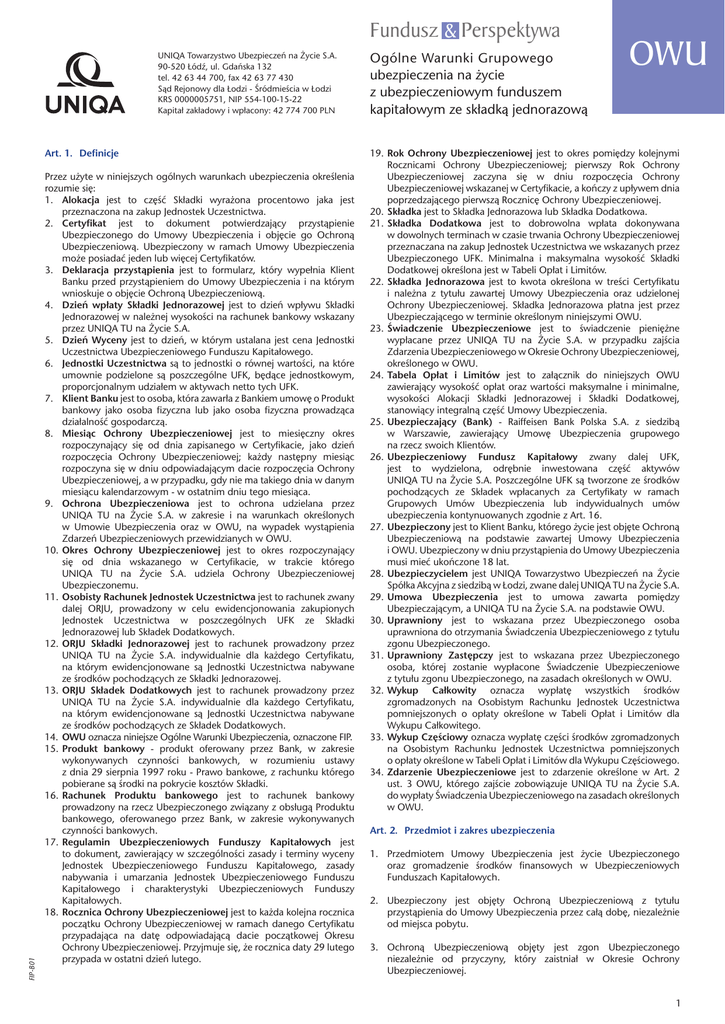 Fundusz & Perspektywa UNIQA Towarzystwo Ubezpieczeñ na ¯ycie S.A. 90-520 £ódŸ, ul. Gdañska 132 tel. 42 63 44 700, fax 42 63 77 430 S¹d Rejonowy dla £odzi - Œródmieœcia w £odzi KRS 0000005751, NIP 554-100-15-22 Kapita³ zak³adowy i wp³acony: 42 774 700 PLN FIP-B01 Art. 1. Definicje Przez użyte w niniejszych ogólnych warunkach ubezpieczenia określenia rozumie się: 1. Alokacja jest to część Składki wyrażona procentowo jaka jest przeznaczona na zakup Jednostek Uczestnictwa. 2. Certyfikat jest to dokument potwierdzający przystąpienie Ubezpieczonego do Umowy Ubezpieczenia i objęcie go Ochroną Ubezpieczeniową. Ubezpieczony w ramach Umowy Ubezpieczenia może posiadać jeden lub więcej Certyfikatów. 3. Deklaracja przystąpienia jest to formularz, który wypełnia Klient Banku przed przystąpieniem do Umowy Ubezpieczenia i na którym wnioskuje o objęcie Ochroną Ubezpieczeniową. 4. Dzień wpłaty Składki Jednorazowej jest to dzień wpływu Składki Jednorazowej w należnej wysokości na rachunek bankowy wskazany przez UNIQA TU na Życie S.A. 5. Dzień Wyceny jest to dzień, w którym ustalana jest cena Jednostki Uczestnictwa Ubezpieczeniowego Funduszu Kapitałowego. 6. Jednostki Uczestnictwa są to jednostki o równej wartości, na które umownie podzielone są poszczególne UFK, będące jednostkowym, proporcjonalnym udziałem w aktywach netto tych UFK. 7. Klient Banku jest to osoba, która zawarła z Bankiem umowę o Produkt bankowy jako osoba fizyczna lub jako osoba fizyczna prowadząca działalność gospodarczą. 8. Miesiąc Ochrony Ubezpieczeniowej jest to miesięczny okres rozpoczynający się od dnia zapisanego w Certyfikacie, jako dzień rozpoczęcia Ochrony Ubezpieczeniowej; każdy następny miesiąc rozpoczyna się w dniu odpowiadającym dacie rozpoczęcia Ochrony Ubezpieczeniowej, a w przypadku, gdy nie ma takiego dnia w danym miesiącu kalendarzowym - w ostatnim dniu tego miesiąca. 9. Ochrona Ubezpieczeniowa jest to ochrona udzielana przez UNIQA TU na Życie S.A. w zakresie i na warunkach określonych w Umowie Ubezpieczenia oraz w OWU, na wypadek wystąpienia Zdarzeń Ubezpieczeniowych przewidzianych w OWU. 10.Okres Ochrony Ubezpieczeniowej jest to okres rozpoczynający się od dnia wskazanego w Certyfikacie, w trakcie którego UNIQA TU na Życie S.A. udziela Ochrony Ubezpieczeniowej Ubezpieczonemu. 11.Osobisty Rachunek Jednostek Uczestnictwa jest to rachunek zwany dalej ORJU, prowadzony w celu ewidencjonowania zakupionych Jednostek Uczestnictwa w poszczególnych UFK ze Składki Jednorazowej lub Składek Dodatkowych. 12.ORJU Składki Jednorazowej jest to rachunek prowadzony przez UNIQA TU na Życie S.A. indywidualnie dla każdego Certyfikatu, na którym ewidencjonowane są Jednostki Uczestnictwa nabywane ze środków pochodzących ze Składki Jednorazowej. 13.ORJU Składek Dodatkowych jest to rachunek prowadzony przez UNIQA TU na Życie S.A. indywidualnie dla każdego Certyfikatu, na którym ewidencjonowane są Jednostki Uczestnictwa nabywane ze środków pochodzących ze Składek Dodatkowych. 14.OWU oznacza niniejsze Ogólne Warunki Ubezpieczenia, oznaczone FIP. 15.Produkt bankowy - produkt oferowany przez Bank, w zakresie wykonywanych czynności bankowych, w rozumieniu ustawy z dnia 29 sierpnia 1997 roku - Prawo bankowe, z rachunku którego pobierane są środki na pokrycie kosztów Składki. 16.Rachunek Produktu bankowego jest to rachunek bankowy prowadzony na rzecz Ubezpieczonego związany z obsługą Produktu bankowego, oferowanego przez Bank, w zakresie wykonywanych czynności bankowych. 17.Regulamin Ubezpieczeniowych Funduszy Kapitałowych jest to dokument, zawierający w szczególności zasady i terminy wyceny Jednostek Ubezpieczeniowego Funduszu Kapitałowego, zasady nabywania i umarzania Jednostek Ubezpieczeniowego Funduszu Kapitałowego i charakterystyki Ubezpieczeniowych Funduszy Kapitałowych. 18.Rocznica Ochrony Ubezpieczeniowej jest to każda kolejna rocznica początku Ochrony Ubezpieczeniowej w ramach danego Certyfikatu przypadająca na datę odpowiadającą dacie początkowej Okresu Ochrony Ubezpieczeniowej. Przyjmuje się, że rocznica daty 29 lutego przypada w ostatni dzień lutego. Ogólne Warunki Grupowego ubezpieczenia na życie z ubezpieczeniowym funduszem kapitałowym ze składką jednorazową OWU 19.Rok Ochrony Ubezpieczeniowej jest to okres pomiędzy kolejnymi Rocznicami Ochrony Ubezpieczeniowej; pierwszy Rok Ochrony Ubezpieczeniowej zaczyna się w dniu rozpoczęcia Ochrony Ubezpieczeniowej wskazanej w Certyfikacie, a kończy z upływem dnia poprzedzającego pierwszą Rocznicę Ochrony Ubezpieczeniowej. 20.Składka jest to Składka Jednorazowa lub Składka Dodatkowa. 21.Składka Dodatkowa jest to dobrowolna wpłata dokonywana w dowolnych terminach w czasie trwania Ochrony Ubezpieczeniowej przeznaczana na zakup Jednostek Uczestnictwa we wskazanych przez Ubezpieczonego UFK. Minimalna i maksymalna wysokość Składki Dodatkowej określona jest w Tabeli Opłat i Limitów. 22.Składka Jednorazowa jest to kwota określona w treści Certyfikatu i należna z tytułu zawartej Umowy Ubezpieczenia oraz udzielonej Ochrony Ubezpieczeniowej. Składka Jednorazowa płatna jest przez Ubezpieczającego w terminie określonym niniejszymi OWU. 23.Świadczenie Ubezpieczeniowe jest to świadczenie pieniężne wypłacane przez UNIQA TU na Życie S.A. w przypadku zajścia Zdarzenia Ubezpieczeniowego w Okresie Ochrony Ubezpieczeniowej, określonego w OWU. 24.Tabela Opłat i Limitów jest to załącznik do niniejszych OWU zawierający wysokość opłat oraz wartości maksymalne i minimalne, wysokości Alokacji Składki Jednorazowej i Składki Dodatkowej, stanowiący integralną część Umowy Ubezpieczenia. 25.Ubezpieczający (Bank) ‑ Raiffeisen Bank Polska S.A. z siedzibą w Warszawie, zawierający Umowę Ubezpieczenia grupowego na rzecz swoich Klientów. 26.Ubezpieczeniowy Fundusz Kapitałowy zwany dalej UFK, jest to wydzielona, odrębnie inwestow
