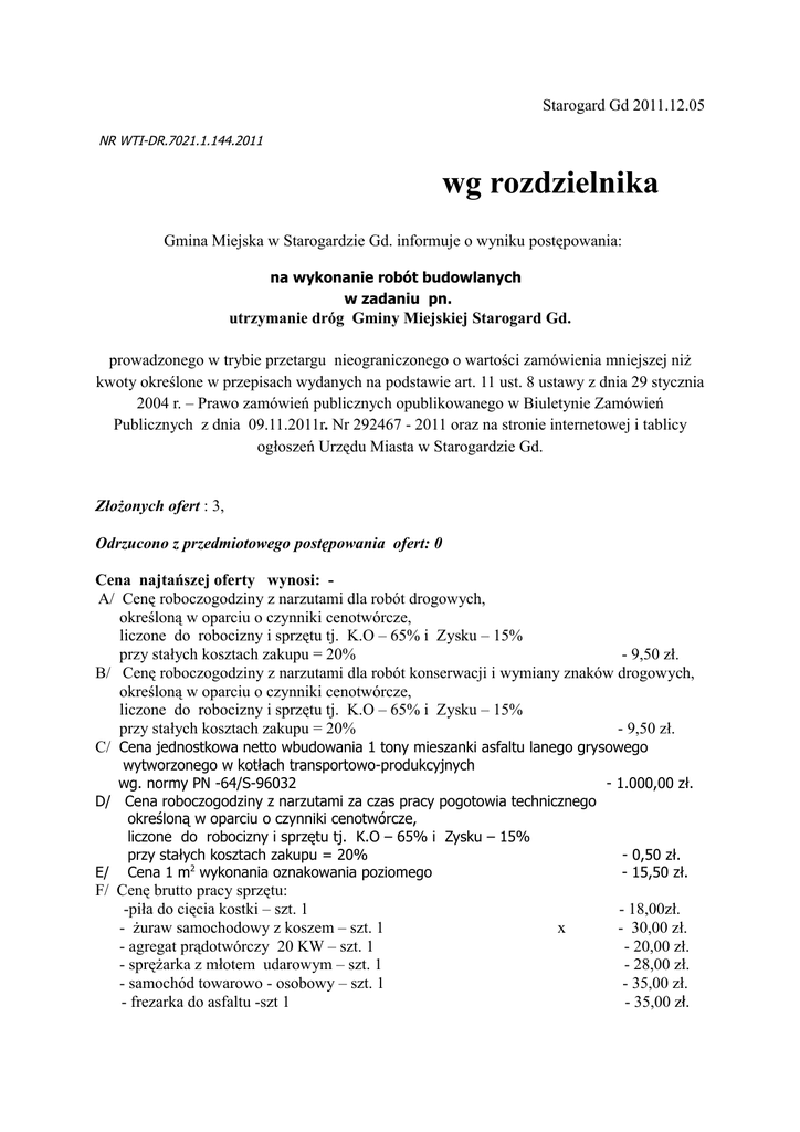 Starogard Gd 2011.12.05 NR WTI-DR.7021.1.144.2011 wg rozdzielnika Gmina Miejska w Starogardzie Gd. informuje o wyniku postępowania: na wykonanie robót budowlanych w zadaniu pn. utrzymanie dróg Gminy Miejskiej Starogard Gd. prowadzonego w trybie przetargu nieograniczonego o wartości zamówienia mniejszej niż kwoty określone w przepisach wydanych na podstawie art. 11 ust. 8 ustawy z dnia 29 stycznia 2004 r. – Prawo zamówień publicznych opublikowanego w Biuletynie Zamówień Publicznych z dnia 09.11.2011r. Nr 292467 - 2011 oraz na stronie internetowej i tablicy ogłoszeń Urzędu Miasta w Starogardzie Gd. Złożonych ofert : 3, Odrzucono z przedmiotowego postępowania ofert: 0 Cena najtańszej oferty wynosi: A/ Cenę roboczogodziny z narzutami dla robót drogowych, określoną w oparciu o czynniki cenotwórcze, liczone do robocizny i sprzętu tj. K.O – 65% i Zysku – 15% przy stałych kosztach zakupu = 20% - 9,50 zł. B/ Cenę roboczogodziny z narzutami dla robót konserwacji i wymiany znaków drogowych, określoną w oparciu o czynniki cenotwórcze, liczone do robocizny i sprzętu tj. K.O – 65% i Zysku – 15% przy stałych kosztach zakupu = 20% - 9,50 zł. C/ Cena jednostkowa netto wbudowania 1 tony mieszanki asfaltu lanego grysowego wytworzonego w kotłach transportowo-produkcyjnych wg. normy PN -64/S-96032 - 1.000,00 zł. D/ Cena roboczogodziny z narzutami za czas pracy pogotowia technicznego określoną w oparciu o czynniki cenotwórcze, liczone do robocizny i sprzętu tj. K.O – 65% i Zysku – 15% przy stałych kosztach zakupu = 20% - 0,50 zł. 2 E/ Cena 1 m wykonania oznakowania poziomego - 15,50 zł. F/ Cenę brutto pracy sprzętu: -piła do cięcia kostki – szt. 1 - żuraw samochodowy z koszem – szt. 1 - agregat prądotwórczy 20 KW – szt. 1 - sprężarka z młotem udarowym – szt. 1 - samochód towarowo - osobowy – szt. 1 - frezarka do asfaltu -szt 1 x - 18,00zł. - 30,00 zł. - 20,00 zł. - 28,00 zł. - 35,00 zł. - 35,00 zł. Wybrano na roboty ofertę złożoną przez: Przedsiębiorstwo Usług Komunalnych „Starkom” 83-200 Starogard Gd. ul. Tczewska 22 Uzasadnienie: Oferta nie podlegająca odrzuceniu, najtańsza. Umowa w sprawie zamówienia publicznego może zostać zawarta przed upływem 5 dni od przekazania niniejszego zawiadomienia faxem, stosownie do przepisów art. 94, ust. 2, pkt. 3 lit.a ustawy Prawo Zamówień Publicznych. Otrzymują: 1 egz „PROFIT” Przedsiębiorstwo Produkcyjno-Handlowo-Usługowe Wojciech Kusa 83-110 Tczew ul. Rejtana 1 liczba otrzymanych punktów – 70,04 Zestawienie punktacji A/ Cenę roboczogodziny z narzutami dla robót drogowych, określoną w oparciu o czynniki cenotwórcze, liczone do robocizny i sprzętu tj. K.O – 65% i Zysku – 15% przy stałych kosztach zakupu = 20% - 17,09 B/ Cenę roboczogodziny z narzutami dla robót konserwacji i wymiany znaków drogowych, określoną w oparciu o czynniki cenotwórcze, liczone do robocizny i sprzętu tj. K.O – 65% i Zysku – 15% przy stałych kosztach zakupu = 20% - 11,97 C/ Cena jednostkowa netto wbudowania 1 tony mieszanki asfaltu lanego grysowego wytworzonego w kotłach transportowo-produkcyjnych wg. normy PN -64/S-96032 - 15,00 D/ Cena roboczogodziny z narzutami za czas pracy pogotowia technicznego określoną w oparciu o czynniki cenotwórcze, liczone do robocizny i sprzętu tj. K.O – 65% i Zysku – 15% przy stałych kosztach zakupu = 20% - 0,63 E/ Cena 1 m2 wykonania oznakowania poziomego - 8,00 F/ Cenę brutto pracy sprzętu: -piła do cięcia kostki – szt. 1 - żuraw samochodowy z koszem – szt. 1 - agregat prądotwórczy 20 KW – szt. 1 - sprężarka z młotem udarowym – szt. 1 - samochód towarowo - osobowy – szt. 1 - frezarka do asfaltu -szt 1 Razem punktów 1 egz - 5,00 3,00 2,00 2,00 3,57 1,78 70,04 Przedsiębiorstwo Usług Komunalnych „Starkom” 83-200 Starogard Gd. ul. Tczewska 22 liczba otrzymanych punktów - 88,63 Zestawienie punktacji A/ Cenę roboczogodziny z narzutami dla robót drogowych, określoną w oparciu o czynniki cenotwórcze, liczone do robocizny i sprzętu tj. K.O – 65% i Zysku – 15% przy stałych kosztach zakupu = 20% - 25,00 B/ Cenę roboczogodziny z narzutami dla robót konserwacji i wymiany znaków drogowych, określoną w oparciu o czynniki cenotwórcze, liczone do robocizny i sprzętu tj. K.O – 65% i Zysku – 15% przy stałych kosztach zakupu = 20% - 15,00 C/ Cena jednostkowa netto wbudowania 1 tony mieszanki asfaltu lanego grysowego wytworzonego w kotłach transportowo-produkcyjnych wg. normy PN -64/S-96032 - 10,35 D/ Cena roboczogodziny z narzutami za czas pracy pogotowia technicznego określoną w oparciu o czynniki cenotwórcze, liczone do robocizny i sprzętu tj. K.O – 65% i Zysku – 15% przy stałych kosztach zakupu = 20% - 15,00 E/ Cena 1 m2 wykonania oznakowania poziomego - 5,68 F/ Cenę brutto pracy sprzętu: -piła do cięcia kostki – szt. 1 - żuraw samochodowy z koszem – szt. 1 - agregat prądotwórczy 20 KW – szt. 1 sprężarka z młotem udarowym – szt. 1 - samochód towarowo - osobowy – szt. 1 - frezarka do asfaltu -szt 1 Razem punktów 1 egz - 1,39 - 5,00 - 0,50 - 0,71 - 5,00 - 5,00 88,63 Usługowy Zakład Robót Ziemnych Leszek Warczak 83-200 Starogard Gd. ul. Wiosenna14 liczba otrzymanych punktów - 71,08 Zestawienie punktacji A/ Cenę roboczogodziny z narzutami dla robót drogowych, określoną w oparciu o czynniki cenotwórcze, liczone do robocizny i sprzętu tj. K.O – 65% i Zysku – 15% przy stałych kosztach zakupu = 20% - 20,85 B/ Cenę roboczogodziny z narzutami dla robót konserwacji i wymiany znaków drogowych, określoną w oparciu o czynniki cenotwórcze, liczone do robocizny i sprzętu tj. K.O – 65% i Zysku – 15% przy stałych kosztach zakupu = 20% - 12,51 C/ Cena jednostkowa netto wbudowania 1 tony mieszanki asfaltu lanego grysowego wytworzonego w kotłach transportowo-produkcyjnych wg. normy PN -64/S-96032 - 8,63 D/ Cena roboczogodziny z narzutami za czas pracy