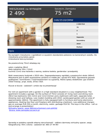 MIESZKANIE na WYNAJEM 2 490 Szczecin, Zamojska 75 m2 168/3518/OMW 2 490 PLN 75 3 1 Separate Secondary 2010 Perfect Opis Na wynajem mieszkanie z ogródkiem w wysokim standardzie położone na kameralnym osiedlu. Do mieszkania przynależy garaż. (mieszkanie bezczynszowe) Na powierzchnię 75m2 składają się: salon z jadalnią 28m2 dwie sypialnie 10m i 12m2 kuchnia 11m2 oraz łazienka z wanną, osobna toaleta, garderoba i przedpokój. Niski nowoczesny budynek z 2010 roku. Zagospodarowany ogródek o powierzchni około 160m2. Mieszkanie jest w pełni wyposażone zarówno w meble jak i sprzęt RTV AGD. Ogrzewanie gazowe podłogowe i kominkowe z rozprowadzeniem na sypialnię. Niskie opłaty dodatkowe: gaz średnio 250zł miesiąc, prąd, woda, śmieci 50zł. Klucze w biurze - zadzwoń i umów się na prezentację! For rent an apartment with a garden in a high standard situated in a cozy neighborhood. The apartment includes a garage. On the surface of 75m2 consists of: living room and dining room 28m2 two bedrooms 10m 12m2 and 11m2 kitchen and a bathroom with bath, separate toilet, dressing room and hallway. Low modern building with 2010. Landscaped garden with an area of approximately 160m2. The apartment is fully equipped both in furniture and home electronics appliances. Heating Gas floor and fireplace with distributing a bedroom. Low additional charges: gas on average PLN 250 a month, electricity, water, garbage PLN 50. The keys in the office - call us and arrange a presentation! Wirtualny spacer: www.360nieruchomosci.com.pl/416/ Strona: www.zamojska.szczecin.pl Sprzedaj w podobny sposób własną nieruchomość - odbierz darmowy wirtualny spacer, sesję fotograficzną i film z drona - zadzwoń tel. 693 27 44 95! 360 Nieruchomości Daniel Tokarz tel. 693274495 email: [email protected] 360 Nieruchomości Powered by TCPDF (www.tcpdf.org)
