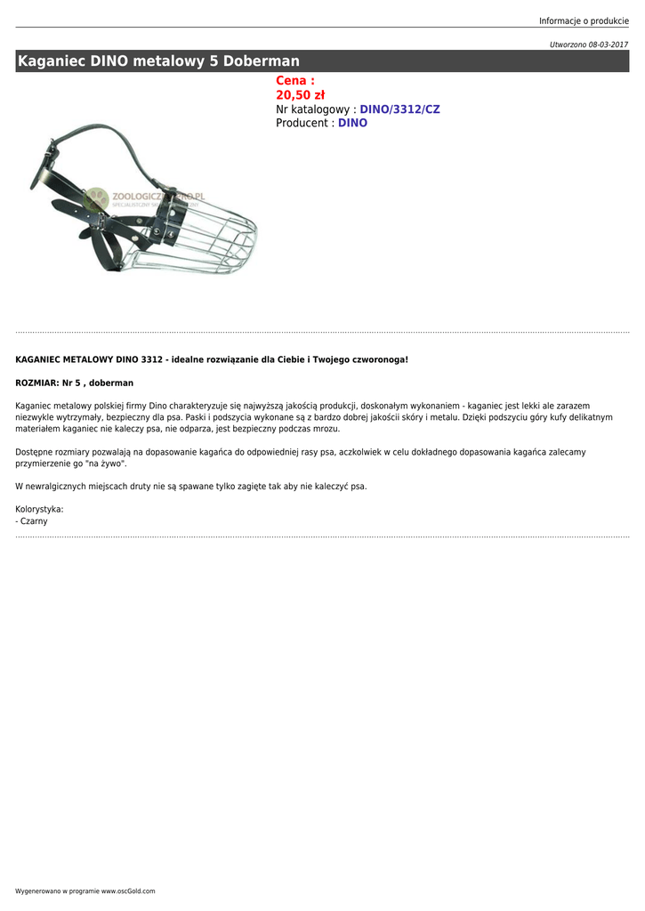 Informacje o produkcie Utworzono 08-03-2017 Kaganiec DINO metalowy 5 Doberman Cena : 20,50 zł Nr katalogowy : DINO/3312/CZ Producent : DINO KAGANIEC METALOWY DINO 3312 - idealne rozwiązanie dla Ciebie i Twojego czworonoga! ROZMIAR: Nr 5 , doberman Kaganiec metalowy polskiej firmy Dino charakteryzuje się najwyższą jakością produkcji, doskonałym wykonaniem - kaganiec jest lekki ale zarazem niezwykle wytrzymały, bezpieczny dla psa. Paski i podszycia wykonane są z bardzo dobrej jakościi skóry i metalu. Dzięki podszyciu góry kufy delikatnym materiałem kaganiec nie kaleczy psa, nie odparza, jest bezpieczny podczas mrozu. Dostępne rozmiary pozwalają na dopasowanie kagańca do odpowiedniej rasy psa, aczkolwiek w celu dokładnego dopasowania kagańca zalecamy przymierzenie go "na żywo". W newralgicznych miejscach druty nie są spawane tylko zagięte tak aby nie kaleczyć psa. Kolorystyka: - Czarny Wygenerowano w programie www.oscGold.com