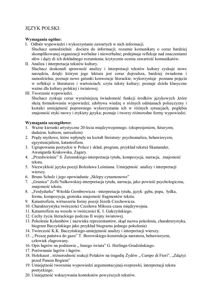 JĘZYK POLSKI: Wymagania ogólne: I. Odbiór wypowiedzi i wykorzystanie zawartych w nich informacji. Słuchacz samodzielnie dociera do informacji; rozumie komunikaty o coraz bardziej skomplikowanej organizacji werbalne i niewerbalne; podejmuje refleksje nad znaczeniami słów i dąży di ich dokładnego rozumienia; krytycznie ocenia zawartość komunikatów. II. Analiza i interpretacja tekstów kultury. Słuchacz doskonali sprawność analizy i interpretacji tekstów kultury zyskuje nowe narzędzia, dzięki którym jego lektura jest coraz dojrzalsza, bardziej świadoma i samodzielna; poznaje nowe gatunki konwencje literackie; wykorzystuje poznane pojęcia w refleksji o literaturze i wartościach; czyta teksty kultury; poznaje dzieła klasyczne ważne dla kultury polskiej i światowej. III. Tworzenie wypowiedzi. Słuchacz zyskuje coraz wyraźniejszą świadomość funkcji środków językowych ,które służą formułowaniu wypowiedzi; zdobywa wiedzę o różnych odmianach polszczyzny i kształci umiejętność poprawnego wykorzystania ich w różnych sytuacjach, pogłębia znajomość etyki mowy i etykiety języka; poznaje i tworzy różnorodne formy wypowiedzi. Wymagania szczegółowe: 1. Ważne kierunki artystyczne 20-lecia międzywojennego. (ekspresjonizm, futuryzm, dadaizm. kubizm, surrealizm) 2. Prądy myślowe, które wpłynęły na kształt literatury: psychoanaliza, behawioryzm, egzystencjalizm, katastrofizm. 3. Ugrupowania poetyckie w Polsce ( skład, program, przykład tekstu) Skamander, Awangarda Krakowska, Żagary. 4. „Przedwiośnie” S. Żeromskiego-interpretacja tytułu, kompozycja, narracja, znajomość tekstu. 5. Niezwykłość języka poezji Bolesława Leśmiana. Umiejętność analizy i interpretacji wierszy. 6. Bruno Schulz i jego opowiadanie „Sklepy cynamonowe” 7. „Granica” Zofii Nałkowskiej-interpretacja tytułu, narracja, jako powieść psychologiczna, znajomość tekstu. 8. „Ferdydurke” Witolda Gombrowicza –interpretacja tytułu, język: gęba, pupa, łydka, forma, kompozycja, groteska znajomość fragmentów tekstu. 9. Katastrofizm, wirtuozeria formy poezji Józefa Czechowicza. 10. Charakterystyka twórczości Czesława Miłosza czasu międzywojnia. 11. Katastrofizm na wesoło w twórczości K. I. Gałczyńskiego. 12. Cechy życia literackiego podczas II wojny światowej. 13. Pokolenie Kolumbów ( nazwiska reprezentantów, skąd nazwa pokolenia, charakterystyka, biogram Baczyńskiego jako przykład biogramu jednego pokolenia) 14. Twórczość K.K. Baczyńskiego-umiejętność analizy i interpretacji wierszy. 15. „ Proszę państwa do gazu” T. Borowskiego-konstrukcja narratora, behawioryzm, człowiek zlagrowany. 16. Opis łagrów na podstawie „ Innego świata” G. Herlinga-Grudzińskiego. 17. Porównanie lagrów i łagrów. 18. Holokaust , różnorodność reakcji Polaków na tragedię Żydów „ Campo di Fiori”, „Zdążyć przed Panem Bogiem” 19. Umiejętność tworzenia wypowiedzi argumentacyjnej-rozprawki, interpretacji tekstu poetyckiego. 20. Umiejętność wskazywania kontekstów powyższych tekstów.