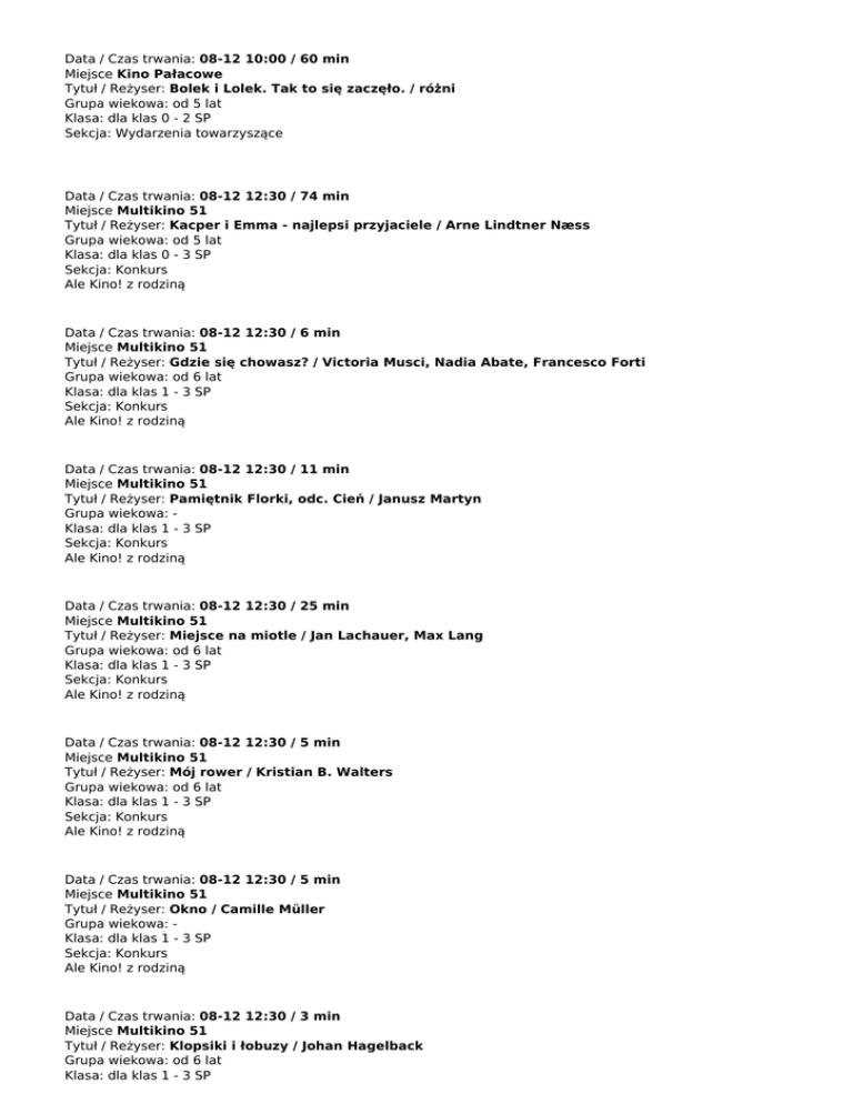 Data / Czas trwania: 08-12 10:00 / 60 min Miejsce Kino Pałacowe Tytuł / Reżyser: Bolek i Lolek. Tak to się zaczęło. / różni Grupa wiekowa: od 5 lat Klasa: dla klas 0 - 2 SP Sekcja: Wydarzenia towarzyszące Data / Czas trwania: 08-12 12:30 / 74 min Miejsce Multikino 51 Tytuł / Reżyser: Kacper i Emma - najlepsi przyjaciele / Arne Lindtner Næss Grupa wiekowa: od 5 lat Klasa: dla klas 0 - 3 SP Sekcja: Konkurs Ale Kino! z rodziną Data / Czas trwania: 08-12 12:30 / 6 min Miejsce Multikino 51 Tytuł / Reżyser: Gdzie się chowasz? / Victoria Musci, Nadia Abate, Francesco Forti Grupa wiekowa: od 6 lat Klasa: dla klas 1 - 3 SP Sekcja: Konkurs Ale Kino! z rodziną Data / Czas trwania: 08-12 12:30 / 11 min Miejsce Multikino 51 Tytuł / Reżyser: Pamiętnik Florki, odc. Cień / Janusz Martyn Grupa wiekowa: Klasa: dla klas 1 - 3 SP Sekcja: Konkurs Ale Kino! z rodziną Data / Czas trwania: 08-12 12:30 / 25 min Miejsce Multikino 51 Tytuł / Reżyser: Miejsce na miotle / Jan Lachauer, Max Lang Grupa wiekowa: od 6 lat Klasa: dla klas 1 - 3 SP Sekcja: Konkurs Ale Kino! z rodziną Data / Czas trwania: 08-12 12:30 / 5 min Miejsce Multikino 51 Tytuł / Reżyser: Mój rower / Kristian B. Walters Grupa wiekowa: od 6 lat Klasa: dla klas 1 - 3 SP Sekcja: Konkurs Ale Kino! z rodziną Data / Czas trwania: 08-12 12:30 / 5 min Miejsce Multikino 51 Tytuł / Reżyser: Okno / Camille Müller Grupa wiekowa: Klasa: dla klas 1 - 3 SP Sekcja: Konkurs Ale Kino! z rodziną Data / Czas trwania: 08-12 12:30 / 3 min Miejsce Multikino 51 Tytuł / Reżyser: Klopsiki i łobuzy / Johan Hagelback Grupa wiekowa: od 6 lat Klasa: dla klas 1 - 3 SP Sekcja: Konkurs Ale Kino! z rodziną Data / Czas trwania: 08-12 15:00 / 94 min Miejsce Multikino 51 Tytuł / Reżyser: Uwierz / David Scheinmann Grupa wiekowa: Klasa: dla klas 4 - 6 SP Sekcja: Ale Kino! z piłką Ale Kino! z rodziną Data / Czas trwania: 08-12 15:00 / 98 min Miejsce Multikino 51 Tytuł / Reżyser: Eskil i Trynidad / Stephan Apelgren Grupa wiekowa: od 10 lat Klasa: dla klas 4 -6 SP i Gimn Sekcja: Panorama Ale Kino! z rodziną Data / Czas trwania: 08-12 17:30 / 117 min Miejsce Multikino 51 Tytuł / Reżyser: Wilcze dzieci / Mamoru Hosoda Grupa wiekowa: od 11 lat Klasa: Sekcja: Konkurs Data / Czas trwania: 08-12 17:30 / 103 min Miejsce Multikino 51 Tytuł / Reżyser: Kumple / Marcelo Galvão Grupa wiekowa: od 16 lat Klasa: Sekcja: Panorama Powered by TCPDF (www.tcpdf.org)