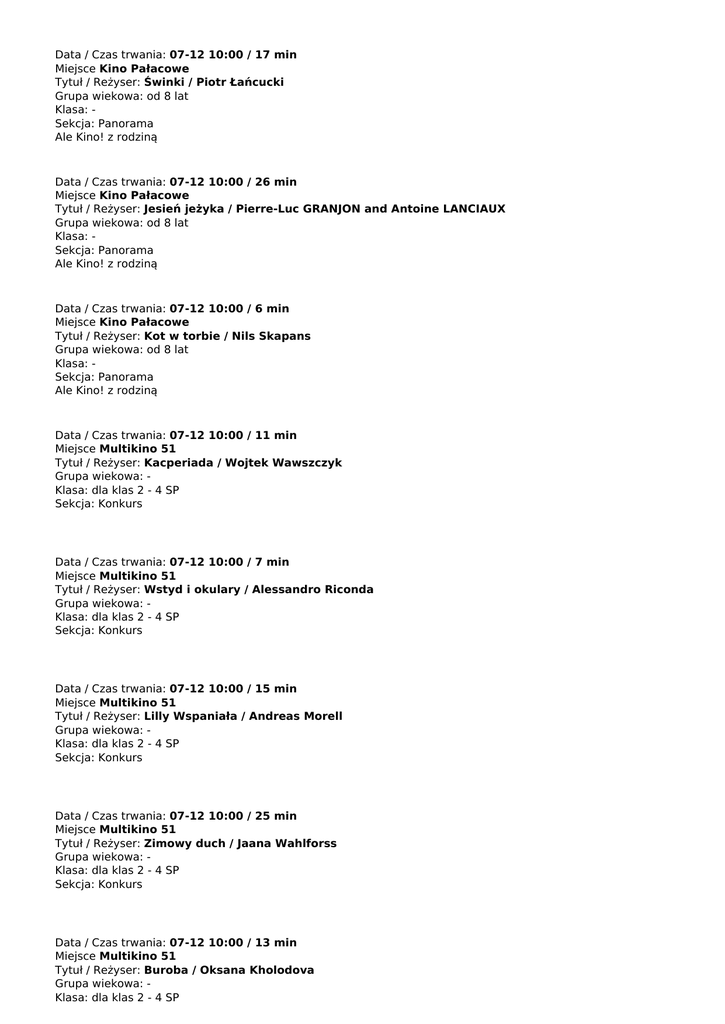 Data / Czas trwania: 07-12 10:00 / 17 min Miejsce Kino Pałacowe Tytuł / Reżyser: Świnki / Piotr Łańcucki Grupa wiekowa: od 8 lat Klasa: Sekcja: Panorama Ale Kino! z rodziną Data / Czas trwania: 07-12 10:00 / 26 min Miejsce Kino Pałacowe Tytuł / Reżyser: Jesień jeżyka / Pierre-Luc GRANJON and Antoine LANCIAUX Grupa wiekowa: od 8 lat Klasa: Sekcja: Panorama Ale Kino! z rodziną Data / Czas trwania: 07-12 10:00 / 6 min Miejsce Kino Pałacowe Tytuł / Reżyser: Kot w torbie / Nils Skapans Grupa wiekowa: od 8 lat Klasa: Sekcja: Panorama Ale Kino! z rodziną Data / Czas trwania: 07-12 10:00 / 11 min Miejsce Multikino 51 Tytuł / Reżyser: Kacperiada / Wojtek Wawszczyk Grupa wiekowa: Klasa: dla klas 2 - 4 SP Sekcja: Konkurs Data / Czas trwania: 07-12 10:00 / 7 min Miejsce Multikino 51 Tytuł / Reżyser: Wstyd i okulary / Alessandro Riconda Grupa wiekowa: Klasa: dla klas 2 - 4 SP Sekcja: Konkurs Data / Czas trwania: 07-12 10:00 / 15 min Miejsce Multikino 51 Tytuł / Reżyser: Lilly Wspaniała / Andreas Morell Grupa wiekowa: Klasa: dla klas 2 - 4 SP Sekcja: Konkurs Data / Czas trwania: 07-12 10:00 / 25 min Miejsce Multikino 51 Tytuł / Reżyser: Zimowy duch / Jaana Wahlforss Grupa wiekowa: Klasa: dla klas 2 - 4 SP Sekcja: Konkurs Data / Czas trwania: 07-12 10:00 / 13 min Miejsce Multikino 51 Tytuł / Reżyser: Buroba / Oksana Kholodova Grupa wiekowa: Klasa: dla klas 2 - 4 SP Sekcja: Konkurs Data / Czas trwania: 07-12 10:30 / 40 min Miejsce Scena Wspólna Tytuł / Reżyser: Przygody klopsików / Johan Hagelback Grupa wiekowa: od 4 lat Klasa: Sekcja: Ale Kino! najmłodszego widza Data / Czas trwania: 07-12 11:30 / 40 min Miejsce Scena Wspólna Tytuł / Reżyser: Przygody klopsików / Johan Hagelback Grupa wiekowa: od 4 lat Klasa: Sekcja: Ale Kino! najmłodszego widza Data / Czas trwania: 07-12 12:00 / 74 min Miejsce Kino Pałacowe Tytuł / Reżyser: Twardziele / Christian Lo Grupa wiekowa: Klasa: dla klas 4 - 6 SP Sekcja: Panorama Data / Czas trwania: 07-12 12:30 / 80 min Miejsce Multikino 51 Tytuł / Reżyser: AninA / Alfredo Soderguit Grupa wiekowa: Klasa: dla klas 1 - 4 SP Sekcja: Konkurs Ale Kino! z rodziną Data / Czas trwania: 07-12 15:30 / 40 min Miejsce Scena Wspólna Tytuł / Reżyser: Przygody klopsików / Johan Hagelback Grupa wiekowa: od 4 lat Klasa: Sekcja: Ale Kino! najmłodszego widza Data / Czas trwania: 07-12 16:30 / 40 min Miejsce Scena Wspólna Tytuł / Reżyser: Przygody klopsików / Johan Hagelback Grupa wiekowa: od 4 lat Klasa: Sekcja: Ale Kino! najmłodszego widza Data / Czas trwania: 07-12 17:00 / 98 min Miejsce Multikino 51 Tytuł / Reżyser: Utrata niewinności Ewy van End / Michiel ten Horn Grupa wiekowa: od 16 lat Klasa: Sekcja: Panorama Data / Czas trwania: 07-12 19:30 / 100 min Miejsce Multikino 51 Tytuł / Reżyser: Spike Island / Mat Whitecross Grupa wiekowa: od 16 lat Klasa: Sekcja: Panorama Powered by TCPDF (www.tcpdf.org)