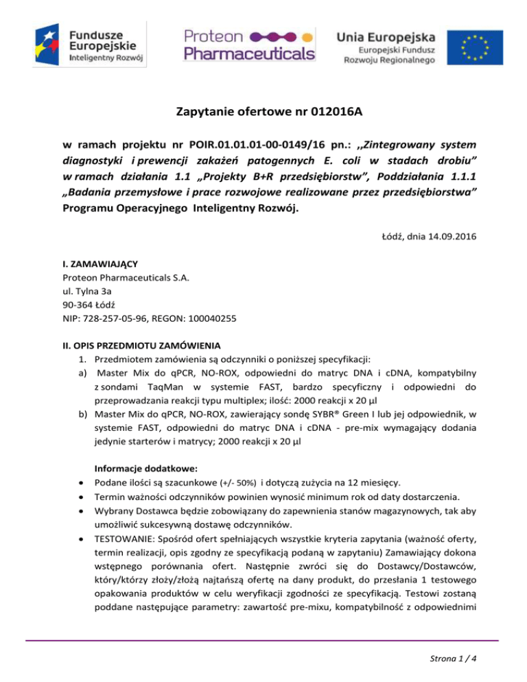 Zapytanie ofertowe nr 012016A w ramach projektu nr POIR.01.01.01-00-0149/16 pn.: ,,Zintegrowany system diagnostyki i prewencji zakażeń patogennych E. coli w stadach drobiu” w ramach działania 1.1 „Projekty B+R przedsiębiorstw”, Poddziałania 1.1.1 „Badania przemysłowe i prace rozwojowe realizowane przez przedsiębiorstwa” Programu Operacyjnego Inteligentny Rozwój. Łódź, dnia 14.09.2016 I. ZAMAWIAJĄCY Proteon Pharmaceuticals S.A. ul. Tylna 3a 90-364 Łódź NIP: 728-257-05-96, REGON: 100040255 II. OPIS PRZEDMIOTU ZAMÓWIENIA 1. Przedmiotem zamówienia są odczynniki o poniższej specyfikacji: a) Master Mix do qPCR, NO-ROX, odpowiedni do matryc DNA i cDNA, kompatybilny z sondami TaqMan w systemie FAST, bardzo specyficzny i odpowiedni do przeprowadzania reakcji typu multiplex; ilość: 2000 reakcji x 20 µl b) Master Mix do qPCR, NO-ROX, zawierający sondę SYBR® Green I lub jej odpowiednik, w systemie FAST, odpowiedni do matryc DNA i cDNA - pre-mix wymagający dodania jedynie starterów i matrycy; 2000 reakcji x 20 µl Informacje dodatkowe: Podane ilości są szacunkowe (+/- 50%) i dotyczą zużycia na 12 miesięcy. Termin ważności odczynników powinien wynosić minimum rok od daty dostarczenia. Wybrany Dostawca będzie zobowiązany do zapewnienia stanów magazynowych, tak aby umożliwić sukcesywną dostawę odczynników. TESTOWANIE: Spośród ofert spełniających wszystkie kryteria zapytania (ważność oferty, termin realizacji, opis zgodny ze specyfikacją podaną w zapytaniu) Zamawiający dokona wstępnego porównania ofert. Następnie zwróci się do Dostawcy/Dostawców, który/którzy złoży/złożą najtańszą ofertę na dany produkt, do przesłania 1 testowego opakowania produktów w celu weryfikacji zgodności ze specyfikacją. Testowi zostaną poddane następujące parametry: zawartość pre-mixu, kompatybilność z odpowiednimi Strona 1 / 4 sondami, działanie w systemie FAST, jakość amplifikacji. Po przeprowadzeniu testów Zamawiający dokona ostatecznej oceny produktu. W przypadku, kiedy testowany produkt nie przejdzie pozytywnie testów Zamawiający zwróci się do następnego z kolei Dostawcy, który złożył najtańszą ofertę, o przesłanie produktu do weryfikacji. Kod CPV: 38951000-6 Termin dostawy przedmiotu zamówienia - nieprzekraczający wskazanego w zapytaniu terminu - 14 dni kalendarzowych od dnia zamówienia, w przypadku podania przedziału czasowego pod uwagę będzie brany maks. czas dostawy; Termin płatności - min. 30 dni od daty wystawienia faktury. Koszty dostawy - po stronie Dostawcy. Zamawiający dopuszcza/nie dopuszcza możliwości składania ofert częściowych. Zamawiający dopuszcza/nie dopuszcza możliwości składania ofert wariantowych. III. WARUNKI UDZIAŁU W POSTĘPOWANIU 1. Wykluczeniu z postępowania podlegają Wykonawcy, którzy są powiązani osobowo lub kapitałowo z Zamawiającym. Przez powiązania kapitałowe lub osobowe rozumie się wzajemne powiązania między zamawiającym lub osobami upoważnionymi do zaciągania zobowiązań w mieniu zamawiającego lub osobami wykonującymi w imieniu zamawiającego czynności związane z przygotowaniem i przeprowadzaniem procedury wyboru wykonawcy, a wykonawcą, polegające w szczególności na: uczestniczeniu w spółce, jako wspólnik spółki cywilnej lub spółki osobowej, posiadaniu co najmniej 10 % udziałów lub akcji, pełnieniu funkcji członka organu nadzorczego lub zarządzającego, prokurenta, pełnomocnika, pozostawaniu w związku małżeńskim, w stosunku pokrewieństwa lub powinowactwa w linii prostej, pokrewieństwa drugiego stopnia lub powinowactwa drugiego stopnia w linii bocznej lub w stosunku przysposobienia, opieki lub kurateli. IV. OPIS SPOSOBU PRZYGOTOWANIA OFERTY 1. Oferta powinna być sporządzona w języku polskim na papierze firmowym lub opatrzona pieczątką firmową. 2. Oferta powinna: zawierać pełną nazwę Oferenta, adres lub siedzibę Oferenta, numer telefonu, adres e-mail; posiadać datę wystawienia; posiadać termin ważności oferty - minimum 60 dni; Strona 2 / 4 zawierać termin realizacji zamówienia - w przypadku podania przedziału czasowego przy ocenie oferty pod uwagę będzie brany maks. czas dostawy; zawierać cenę netto (w przypadku cen podanych w walutach obcych zostaną one przeliczone na PLN po kursie średnim NBP obowiązującym w dniu oceny ofert); Zawierać krótki opis produktu oraz informację o pozostałych wymaganiach zgodnie z informacjami dodatkowymi zawartymi w Opisie przedmiotu zamówienia. zawierać czytelny podpis osoby upoważnionej do wystawiania ofert (dotyczy ofert dostarczonych pocztą, kurierem lub osobiście); powoływać się na numer zapytania ofertowego tj. 012016 A V. TERMIN WYKONANIA ZAMÓWIENIA 1. Termin wykonania przedmiotu zamówienia: max. 14 dni kalendarzowych od dnia zamówienia. VI. MIEJSCE ORAZ TERMIN SKŁADANIA OFERT 1. Oferta powinna być złożona do dnia 21.09.2016 do godz. 23.59 CET r. za pośrednictwem: poczty elektronicznej na adres: [email protected], faksem na nr 042 209 33 96, poczty, kuriera lub też dostarczona osobiście na adres: ul. Tylna 3a, 90-364 Łódź. 2. Oferty złożone po terminie nie będą rozpatrywane. Decyduje data wpłynięcia oferty do Zamawiającego. 3. Oferent może przed upływem terminu składania ofert zmienić lub wycofać swoją ofertę. 4. W toku badania i oceny ofert Zamawiający może żądać od oferentów wyjaśnień dotyczących treści złożonych ofert. 5. Zapytanie ofertowe zamieszczono na stronie: www.proteonpharma.com VII. KRYTERIA OCENY OFERT Zamawiający dokona oceny ważnych ofert na podstawie następujących kryteriów: 1. Kryterium dopuszczające do dalszej oceny: • złożenie oferty w wymaganym terminie; • zgodność oferty z opisem zawartym w pkt IV ; • zakres funkcjonalności oferowanego produktu musi być zgodny z wymogami określonymi w części II. 2. Kryterium oceny ofert: • Cena: 100% porównana zostanie cena netto za 1 r