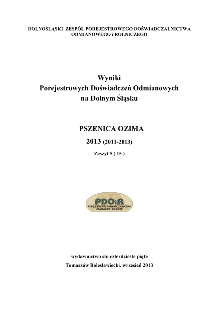 DOLNOŚLĄSKI ZESPÓŁ POREJESTROWEGO DOŚWIADCZALNICTWA ODMIANOWEGO i ROLNICZEGO Wyniki Porejestrowych Doświadczeń Odmianowych na Dolnym Śląsku PSZENICA OZIMA 2013 (2011-2013) Zeszyt 5 ( 15 ) wydawnictwo sto czterdzieste piąte Tomaszów Bolesławiecki. wrzesień 2013 Dolnośląski Zespół Porejestrowego Doświadczalnictwa Odmianowego i Rolniczego Przewodniczący: mgr inż. Anna Kamińska Dyrektor SDOO Zybiszów Z-ca: prof. dr hab. Jan Kaczmarek Z-ca: prof. dr hab. Henryk Bujak Sekretarz: mgr inż. Ewa Śmiałek Stacja Koordynująca PDOiR na Dolnym Śląsku Centralny Ośrodek Badania Odmian Roślin Uprawnych Stacja Doświadczalna Oceny Odmian w Zybiszowie Dyrektor: mgr inż. Anna Kamińska Email [email protected] www.sdootomaszow.wroclaw.pl tel. 71-334-20-1031 Opracowali: Jolanta Kotowicz mgr inż. Ludwik Kotowicz Publikacja chroniona prawem wydawcy; każda reprodukcja całości lub jej części wymaga zgody wydawcy Wydawca: ZDOO Tomaszów Bolesławiecki I. WSTĘP W syntezie wykorzystano wyniki 21 doświadczeń z odmianami pszenicy ozimej przeprowadzonych na Dolnym Śląsku w latach 2011 – 2013. Liczba i lokalizacja doświadczeń jest wystarczająca do uzyskania reprezentatywnych wyników. Jesienią 2012 roku założono na Dolnym Śląsku 9 doświadczeń. Przy ocenie wylegania oraz porażenia chorobami zestawiono wyniki jedynie z tych doświadczeń w których dane zjawisko wystąpiło, natomiast średnie dla wysokości roślin i masy 1000 ziaren pochodzą z tych punktów doświadczalnych, w których dokonano pomiaru. Obecnie w Krajowym Rejestrze znajduje się 80 odmian pszenicy ozimej. Spośród tych odmian Zespół Wojewódzki PDOiR, jesienią ubiegłego roku, wybrał do doświadczeń na Dolnym Śląsku 23 odmiany, które w poprzednich latach wypadły stosunkowo najlepiej w naszym województwie. Doświadczenia prowadzono jako dwupowtórzeniowe, na dwóch poziomach agrotechnicznych: a1 – podstawowym a2 – wysokim (zwiększone o 40 kg nawożenie azotowe, zwalczanie chorób grzybowych, stosowanie antywylegacza i dolistne dokarmianie mikronawozami). W opracowaniu, poza ogólnymi charakterystykami wszystkich odmian badanych w doświadczeniach PDO w roku 2012 podano również charakterystykę odmian najnowszych, wpisanych do krajowego rejestru wiosną bieżącego roku. II. ANALIZA WYNIKÓW DOŚWIADCZEŃ Średni plon pszenicy ozimej w doświadczeniach na Dolnym Śląsku wynosił w 2013 roku 69,5 dt/ha na poziomie podstawowym (a1) i 80,8 dt/ha na poziomie wysokim (a2). Był niższy od uzyskanych w 2011 roku. Poziom plonowania bardzo zróżnicowany w poszczególnych miejscowościach od 46,5 dt/ha w Laskowicach do 89,1 dt/ha w Krościnie Małej ,na podstawowym poziomie agrotechnicznym oraz od 59,4 dt/ha w Laskowicach do 107.4 dt/ha w Krościnie Małej. Plony dwulecia i trzylecia należy interpretować uwzględniając charakter wyników z 2012 roku spowodowany wymarzaniem. Porażenie roślin chorobami było bardziej zróżnicowane w porównaniu z poprzednim sezonem lecz wystąpiło w większej liczbie doświadczeń. Zastosowana chemiczna ochrona roślin na wysokim poziomie agrotechniki ograniczyła występowanie patogenów. Mączniak prawdziwy wystąpił w 5 z 9 analizowanych pod tym względem doświadczeń w mniejszym nasileniu. Największą odpornością na mączniaka prawdziwego wyróżniły się odmiany Muszelka i Banderola, zaś najwrażliwsze okazały się: Mulan i Platin. Rdza brunatna wystąpiła w 6 analizowanych doświadczeniach w bardzo dużym nasileniu. Wrażliwsze okazały się odmiany: Linus i Oxal, bardziej odporną natomiast: Ostroga. Septorioza liści i septorioza plew ocenione zostały odpowiednio w 7 doświadczeniach w większym niż w poprzednim roku nasileniu. Fuzarioza kłosów wystąpiła w większym nasileniu w 7 doświadczeniach. Wyleganie w fazie dojrzałości mlecznej było w porównaniu z poprzednimi latami duże a przed zbiorem wystąpiło we wszystkich doświadczeniach. III. CHARAKTERYSTYKA ODMIAN (Sporządzona na podstawie wieloletnich wyników doświadczeń przeprowadzonych na terenie całego kraju). Kolejność odmian według lat rejestracji. Odmiany jakościowe FIGURA. Odmiana jakościowa (grupa A). Mrozoodporność średnia. Odporność na mączniaka – duża, na brunatną plamistość liści, septoriozę liści i plew oraz fuzariozę kłosów – przeciętna, na rdzę brunatną i choroby podstawy źdźbła – dość mała. Rośliny dość wysokie, o przeciętnej odporności na wyleganie. Termin kłoszenia dość wczesny, dojrzewania średni. Masa 1000 ziaren, wyrównanie i gęstość w stanie zsypnym średnie. Odporność na porastanie w kłosie średnia, liczba opadania dość duża. Zawartość białka i ilość glutenu średnie. Wskaźnik sedymentacji SDS duży. Plenność dobra. ASKALON. Odmiana jakościowa (grupa A). Plenność dobra. Mrozoodporność mała. Odporność na mączniaka prawdziwego, rdzę brunatną i septoriozę liści – dość duża, na septoriozę plew, fuzariozę kłosów i choroby podstawy źdźbła – średnia, na brunatną plamistość liści – dość mała. Rośliny niskie, o dość dużej odporności na wyleganie. Termin kłoszenia i dojrzewania średni. Masa 1000 ziaren dość mała, wyrównanie słabe, gęstość w stanie zsypnym dość mała. Odporność na porastanie w kłosie średnia, liczba opadania duża do bardzo dużej. Zawartość białka średnia, ilość glutenu dość mała. Wskaźnik sedymentacyjny SDS duży do bardzo dużego. Wydajność ogólna mąki średnia. BAMBERKA. Odmiana jakościowa (grupa A). Plenność nieco powyżej średniej. Mrozoodporność mała do średniej. Odporność na mączniaka prawdziwego, rdzę brunatną, brunatną plamistość liści, septoriozę liści i plew oraz choroby podstawy źdźbła – średnia, na fuzariozę kłosów – dość mała. Rośliny średniej wysokości, o przeciętnej odporności na wyleganie. Termin kłoszenia i dojrzewania średni. Masa 1000 ziaren duż