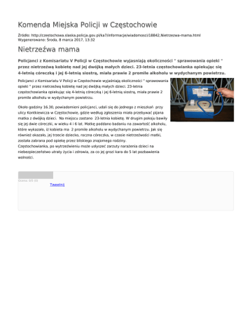 Komenda Miejska Policji w Częstochowie Źródło: http://czestochowa.slaska.policja.gov.pl/ka7/informacje/wiadomosci/18842,Nietrzezwa-mama.html Wygenerowano: Środa, 8 marca 2017, 13:32 Nietrzeźwa mama Policjanci z Komisariatu V Policji w Częstochowie wyjasniają okoliczności " sprawowania opieki " przez nietrzeźwą kobietę nad jej dwójką małych dzieci. 23-letnia częstochowianka opiekując się 4-letnią córeczką i jej 6-letnią siostrą, miała prawie 2 promile alkoholu w wydychanym powietrzu. Policjanci z Komisariatu V Policji w Częstochowie wyjaśniają okoliczności " sprawowania opieki " przez nietrzeźwą kobietę nad jej dwójką małych dzieci. 23-letnia częstochowianka opiekując się 4-letnią córeczką i jej 6-letnią siostrą, miała prawie 2 promile alkoholu w wydychanym powietrzu. Około godziny 16.30, powiadomieni policjanci, udali się do jednego z mieszkań przy ulicy Kontkiewicza w Częstochowie, gdzie według zgłoszenia miała przebywać pijana matka z dwójką dzieci. Na miejscu zastano 23-letnia kobietę. W drugim pokoju bawiły się jej dwie córeczki, w wieku 4 i 6 lat. Matkę poddano badaniu na zawartość alkoholu, które wykazało, iż kobieta ma 2 promile alkoholu w wydychanym powietrzu. Jak się również okazało, jej trzecie dziecko, roczna córeczka, w czasie nietrzeźwości matki, została zabrana pod opiekę przez bliskiego znajomego rodziny. Częstochowianka, po wytrzeźwieniu może usłyszeć zarzuty narażenia dzieci na niebezpieczeństwo utraty życia i zdrowia, za co jej grozi kara do 5 lat pozbawienia wolności. Ocena: 0/5 (0) Tweetnij