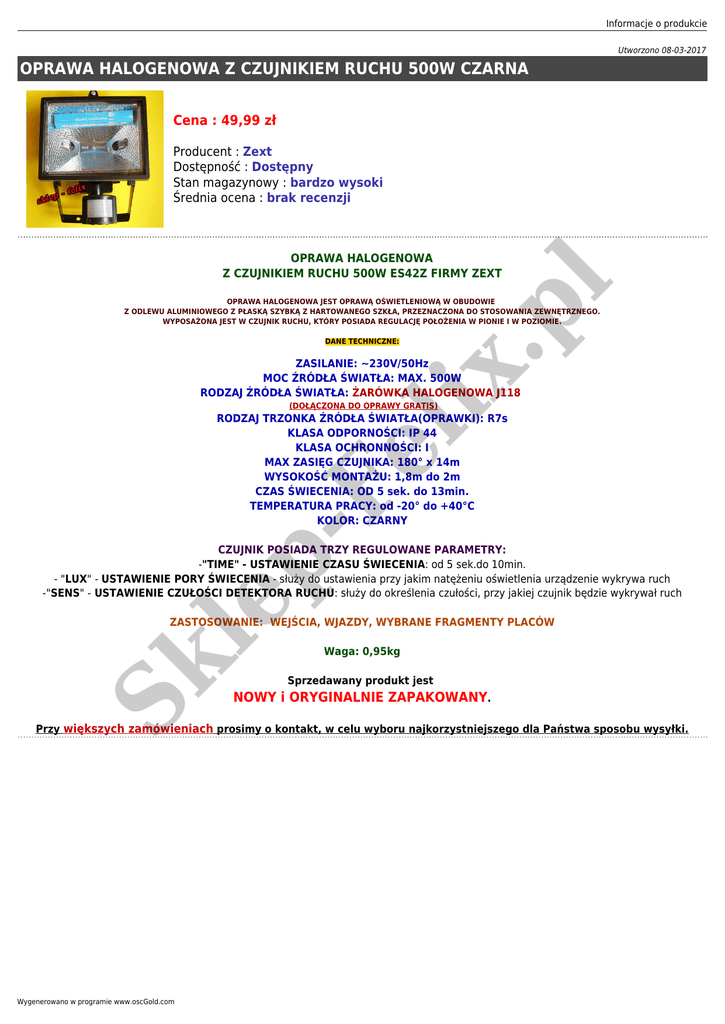 Informacje o produkcie Utworzono 08-03-2017 OPRAWA HALOGENOWA Z CZUJNIKIEM RUCHU 500W CZARNA Cena : 49,99 zł Producent : Zext Dostępność : Dostępny Stan magazynowy : bardzo wysoki Średnia ocena : brak recenzji .p l OPRAWA HALOGENOWA Z CZUJNIKIEM RUCHU 500W ES42Z FIRMY ZEXT OPRAWA HALOGENOWA JEST OPRAWĄ OŚWIETLENIOWĄ W OBUDOWIE Z ODLEWU ALUMINIOWEGO Z PŁASKĄ SZYBKĄ Z HARTOWANEGO SZKŁA, PRZEZNACZONA DO STOSOWANIA ZEWNĘTRZNEGO. WYPOSAŻONA JEST W CZUJNIK RUCHU, KTÓRY POSIADA REGULACJĘ POŁOŻENIA W PIONIE I W POZIOMIE. DANE TECHNICZNE: Fe lix ZASILANIE: ~230V/50Hz MOC ŹRÓDŁA ŚWIATŁA: MAX. 500W RODZAJ ŹRÓDŁA ŚWIATŁA: ŻARÓWKA HALOGENOWA J118 (DOŁĄCZONA DO OPRAWY GRATIS) Sk le p- RODZAJ TRZONKA ŹRÓDŁA ŚWIATŁA(OPRAWKI): R7s KLASA ODPORNOŚCI: IP 44 KLASA OCHRONNOŚCI: I MAX ZASIĘG CZUJNIKA: 180° x 14m WYSOKOŚĆ MONTAŻU: 1,8m do 2m CZAS ŚWIECENIA: OD 5 sek. do 13min. TEMPERATURA PRACY: od -20° do +40°C KOLOR: CZARNY CZUJNIK POSIADA TRZY REGULOWANE PARAMETRY: -"TIME" - USTAWIENIE CZASU ŚWIECENIA: od 5 sek.do 10min. - "LUX" - USTAWIENIE PORY ŚWIECENIA - służy do ustawienia przy jakim natężeniu oświetlenia urządzenie wykrywa ruch -"SENS" - USTAWIENIE CZUŁOŚCI DETEKTORA RUCHU: służy do określenia czułości, przy jakiej czujnik będzie wykrywał ruch ZASTOSOWANIE: WEJŚCIA, WJAZDY, WYBRANE FRAGMENTY PLACÓW Waga: 0,95kg Sprzedawany produkt jest NOWY i ORYGINALNIE ZAPAKOWANY. Przy większych zamówieniach prosimy o kontakt, w celu wyboru najkorzystniejszego dla Państwa sposobu wysyłki. Wygenerowano w programie www.oscGold.com