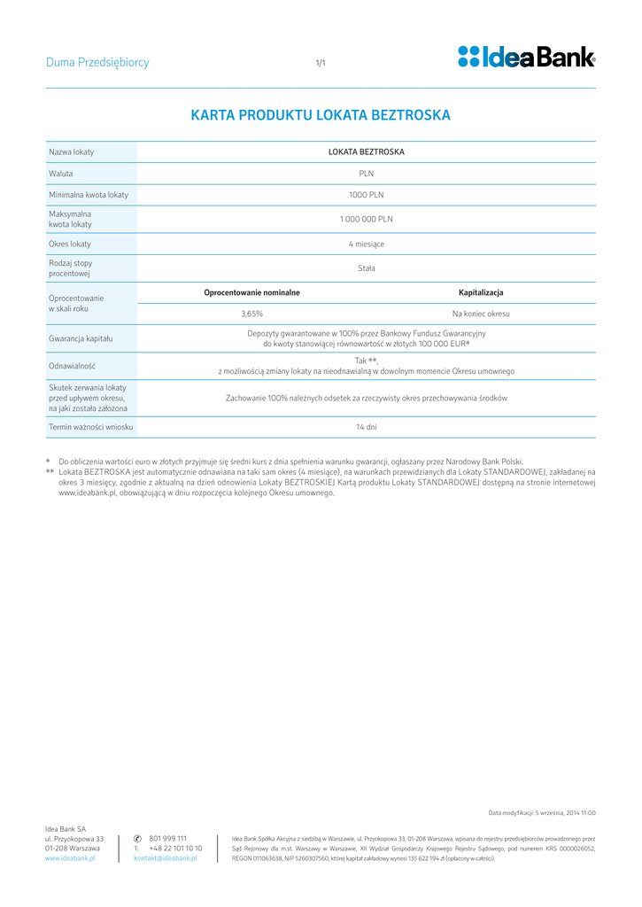 Duma Przedsiębiorcy 1/1 KARTA PRODUKTU LOKATA BEZTROSKA Nazwa lokaty LOKATA BEZTROSKA Waluta PLN Minimalna kwota lokaty 1000 PLN Maksymalna kwota lokaty 1 000 000 PLN Okres lokaty 4 miesiące Rodzaj stopy procentowej Stała Oprocentowanie w skali roku Oprocentowanie nominalne Kapitalizacja 3,65% Na koniec okresu Depozyty gwarantowane w 100% przez Bankowy Fundusz Gwarancyjny do kwoty stanowiącej równowartość w złotych 100 000 EUR* Gwarancja kapitału Tak **, z możliwością zmiany lokaty na nieodnawialną w dowolnym momencie Okresu umownego Odnawialność Skutek zerwania lokaty przed upływem okresu, na jaki została założona Zachowanie 100% należnych odsetek za rzeczywisty okres przechowywania środków Termin ważności wniosku 14 dni * Do obliczenia wartości euro w złotych przyjmuje się średni kurs z dnia spełnienia warunku gwarancji, ogłaszany przez Narodowy Bank Polski. ** Lokata BEZTROSKA jest automatycznie odnawiana na taki sam okres (4 miesiące), na warunkach przewidzianych dla Lokaty STANDARDOWEJ, zakładanej na okres 3 miesięcy, zgodnie z aktualną na dzień odnowienia Lokaty BEZTROSKIEJ Kartą produktu Lokaty STANDARDOWEJ dostępną na stronie internetowej www.ideabank.pl, obowiązującą w dniu rozpoczęcia kolejnego Okresu umownego. Data modyfikacji: 5 września, 2014 11:00 Idea Bank SA ul. Przyokopowa 33 01-208 Warszawa www.ideabank.pl 801 999 111 +48 22 101 10 10 [email protected] T: Idea Bank Spółka Akcyjna z siedzibą w Warszawie, ul. Przyokopowa 33, 01-208 Warszawa, wpisana do rejestru przedsiębiorców prowadzonego przez Sąd Rejonowy dla m.st. Warszawy w Warszawie, XII Wydział Gospodarczy Krajowego Rejestru Sądowego, pod numerem KRS 0000026052, REGON 011063638, NIP 5260307560, której kapitał zakładowy wynosi 135 622 194 zł (opłacony w całości).