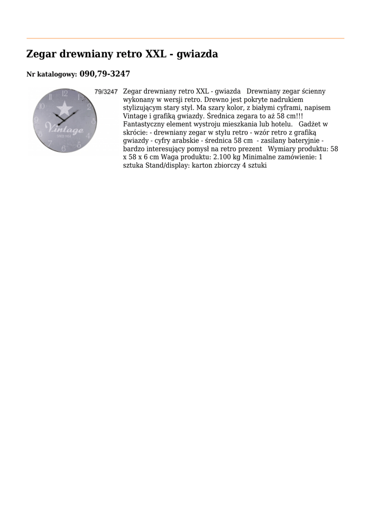 Zegar drewniany retro XXL - gwiazda Nr katalogowy: 090,79-3247 Zegar drewniany retro XXL - gwiazda Drewniany zegar ścienny wykonany w wersji retro. Drewno jest pokryte nadrukiem stylizującym stary styl. Ma szary kolor, z białymi cyframi, napisem Vintage i grafiką gwiazdy. Średnica zegara to aż 58 cm!!! Fantastyczny element wystroju mieszkania lub hotelu. Gadżet w skrócie: - drewniany zegar w stylu retro - wzór retro z grafiką gwiazdy - cyfry arabskie - średnica 58 cm - zasilany bateryjnie bardzo interesujący pomysł na retro prezent Wymiary produktu: 58 x 58 x 6 cm Waga produktu: 2.100 kg Minimalne zamówienie: 1 sztuka Stand/display: karton zbiorczy 4 sztuki