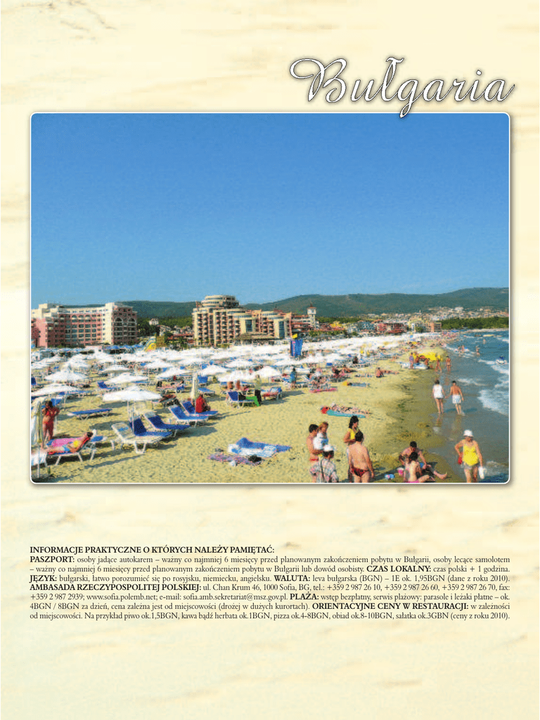 Bułgaria INFORMACJE PRAKTYCZNE O KTÓRYCH NALEŻY PAMIĘTAĆ: PASZPORT: osoby jadące autokarem – ważny co najmniej 6 miesięcy przed planowanym zakończeniem pobytu w Bułgarii, osoby lecące samolotem – ważny co najmniej 6 miesięcy przed planowanym zakończeniem pobytu w Bułgarii lub dowód osobisty. CZAS LOKALNY: czas polski + 1 godzina. JĘZYK: bułgarski, łatwo porozumieć się po rosyjsku, niemiecku, angielsku. WALUTA: leva bułgarska (BGN) – 1E ok. 1,95BGN (dane z roku 2010). AMBASADA RZECZYPOSPOLITEJ POLSKIEJ: ul. Chan Krum 46, 1000 Sofia, BG, tel.: +359 2 987 26 10, +359 2 987 26 60, +359 2 987 26 70, fax: +359 2 987 2939; www.sofia.polemb.net; e-mail: [email protected]. PLAŻA: wstęp bezpłatny, serwis plażowy: parasole i leżaki płatne – ok. 4BGN / 8BGN za dzień, cena zależna jest od miejscowości (drożej w dużych kurortach). ORIENTACYJNE CENY W RESTAURACJI: w zależności od miejscowości. Na przykład piwo ok.1,5BGN, kawa bądź herbata ok.1BGN, pizza ok.4-8BGN, obiad ok.8-10BGN, sałatka ok.3GBN (ceny z roku 2010).