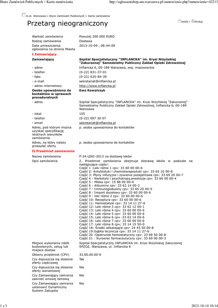 Biuro Zamówień Publicznych > Karta zamówienia 1z3 http://ogloszeniabzp.um.warszawa.pl/zamowienie.php?zamowienie=42213 m.st. Warszawa > Biuro Zamówień Publicznych > Karta zamówienia Przetarg nieograniczony Wartość zamówienia Powyżej 200 000 EURO Rodzaj zamówienia Dostawa Data umieszczenia ogłoszenia na stronie Miasta 2013-10-09 , 08:44:09 wyślij | drukuj I Zamawiający Zamawiający Szpital Specjalistyczny "INFLANCKA" im. Krysi Niżyńskiej "Zakurzonej" Samodzielny Publiczny Zakład Opieki Zdrowotnej - adres Inflancka 6, 00-189 Warszawa, woj. mazowieckie - telefon (0-22) 831-37-01 - faks (0-22) 635-84-39 - e-mail [email protected] - adres internetowy http://www.inflancka.pl Osoba upoważniona do kontaktów w sprawach proceduralnych Ewa Kowalczyk - adres Szpital Specjalistyczny "INFLANCKA" im. Krysi Niżyńskiej "Zakurzonej" Samodzielny Publiczny Zakład Opieki Zdrowotnej, Inflancka 6, 00-189 Warszawa - lokal 155 - telefon (0-22) 697 36 07 - email [email protected] Adres, pod którym można uzyskać specyfikację istotnych warunków zamówienia p. osoba upoważniona do kontaktów Adres, na który należy przesyłać oferty p. osoba upoważniona do kontaktów II Przedmiot zamówienia Nazwa zamówienia P-24-LEKI-2013 na dostawę leków Opis zamówienia 2. Przedmiot zamówienia obejmuje dostawę leków w podziale na następujące części: Część 1 :Leki różne 1 cpv: 33 60 00 00-6 Część 2: Antybiotyki i chemioterapeutyki cpv: 33 65 10 00-8 Część 3: Płyny infuzyjne i żywienie pozajelitowe cpv: 33 69 20 00-7 Część 4 : Narkotyki i psychotropy,anestezja cpv: 33 66 00 00-4 Część 5 : Mleka cpv: 15 88 00 00-0 Część 6 : Albuminy cpv: 33 62 14 00-3 Część 7 : Immunoglobuliny cpv: 33 65 20 00-5 Część 8 : Import docelowy cpv: 33 60 00 00-6 Część 9 : leki różne 2 cpv: 33 60 00 00-6 Część 10: Receptura cpv: 33 60 00 00-6 Część 11: Hemostatyki cpv: 33 14 11 27-6 Część 12: Leki różne 3 cpv: 33 62 12 00-1 Część 13: Leki różne 4 cpv: 33 60 00 00-6 Część 14: Leki różne 5 cpv: 33 60 00 00-6 Część 15: Leki różne 6 cpv :33 63 14 00-6 Część 16: Leki różne 7 cpv: 33 60 00 00-6 Część 17: Leki różne 8 cpv; 33 14 15 50-0 Część 18: Środki odkażające cpv: 24 45 50 00-8 Część 19:Gąbka lecznicza cpv: 33 14 11 27-6 Część 20 :Opatrunek hemostatyczny cpv: 33 69 50 00-8 Część 21 : Surowiec farmaceutyczny cpv: 33 69 00 00-3 Miejsce wykonania robót budowlanych, usług lub miejsce dostaw Szpital Specjalistyczny INFLANCKA im. Krysi Niżyńskiej Zakurzonej SPZOZ, Warszawa, ul. Inflancka 6 Główny przedmiot (CPV) 33.00.00.00-0 Czy dopuszcza się złożenie oferty częściowej Tak Czy dopuszcza się złożenie oferty wariantowej Nie Czy Zamawiający zamierza zawrzeć umowę ramową Nie Czy Zamawiający zamierza ustanowić Dynamiczny System Zakupów Nie 2013-10-14 10:14 Biuro Zamówień Publicznych > Karta zamówienia 2z3 Czy Zamawiający zamierza zastosować aukcję elektroniczną do wyboru najkorzystniejszej oferty Wartość lub zakres zamówienia (z uwzględnieniem wszystkich części i opcji, o ile dotyczy) http://ogloszeniabzp.um.warszawa.pl/zamowienie.php?zamowienie=42213 Nie Nr Nazwa części części Wadium części 1 Leki różne 1 11470,00 2 Antybiotyki i chemioterapeutyki 2270,00 3 Płyny infuzyjne i żywienie pozajelitowe 8380,00 4 Narkotyki i psychotropy,anestezja 3140,00 5 Mleka 330,00 6 Albuminy 170,00 7 Immunoglobuliny 40,00 8 Import docelowy 600,00 9 Leki różne 2 240,00 10 Receptura 390,00 11 Hemostatyki 150,00 12 Leki różne 3 1220,00 13 Leki różne 4 390,00 14 Leki różne 5 290,00 15 Leki różne 6 2460,00 16 Leki różne 7 570,00 17 Leki różne 8 590,00 18 Środki odkażające 17,00 19 Gąbka lecznicza 100,00 20 Opatrunek hemostatyczny 18,00 21 Surowiec farmaceutyczny 440,00 Razem Czas trwania zamówienia lub termin wykonania 33275,00 12 miesięcy/ące (licząc od daty udzielenia zamówienia) III Informacje o charakterze prawnym, ekonomicznym, finansowym, i technicznym Wymagane wadium 33275,00 zł. Informacje dotyczące sytuacji wykonawcy oraz informacje i formalności niezbędne do oceny, czy spełnia on minimalne wymogi ekonomiczne, finansowe i techniczne Oświadczenie o spełnianiu warunków określonych art. 22 ust. 1 ustawy Pzp (wg wzoru określonego w załączniku nr 3 do oferty); Dokument lub kserokopia koncesji, zezwolenia lub licencji jeżeli ustawy nakładają obowiązek posiadania koncesji, zezwolenia lub licencji na podjęcie działalności gospodarczej w zakresie objętym zamówieniem, Aktualne zezwolenie na obrót produktami leczniczymi. Należy przedstawić jeden z dokumentów: Kopię ważnego zezwolenia Głównego Inspektora Farmaceutycznego (GIF) w zakresie prowadzenia hurtowni farmaceutycznej, a w przypadku składania oferty na leki psychotropowe i środki odurzające - odpowiednio wymaganego zezwolenia; Kopię ważnego zezwolenia Głównego Inspektora Farmaceutycznego na wytwarzanie, jeżeli wykonawca jest wytwórcą; W przypadku wykonawcy prowadzącego skład konsygnacyjny - zezwolenia na prowadzenie składu zawierającego uprawnienia przyznane przez Głównego Inspektora Farmaceutycznego w zakresie obrotu produktami leczniczymi. Oświadczenie o braku podstaw do wykluczenia (według wzoru załącznik nr 4 do oferty); aktualny odpis z właściwego rejestru, jeżeli odrębne przepisy wymagają wpisu do rejestru, w celu wykazania braku podstaw do wykluczenia w oparciu o art.24 ust.1 pkt 2 ustawy Pzp, wystawiony nie wcześniej niż 6 miesięcy przed upływem terminu składania ofert, a w stosunku do osób fizycznych oświadczenie w zakresie art. 24 ust. 1 pkt. 2 ustawy – Pzp. aktualne zaświadczenie właściwego naczelnika urzędu skarbowego potwierdzające, że wykonawca nie zalega z opłacaniem podatków, lub zaświadczenie, że uzyskał przewidziane prawem zwolnienie, odroczenie lub rozłożenie na raty zaległych płatności lub wstrzymanie w całości wykonania decyzji właściwego organu 