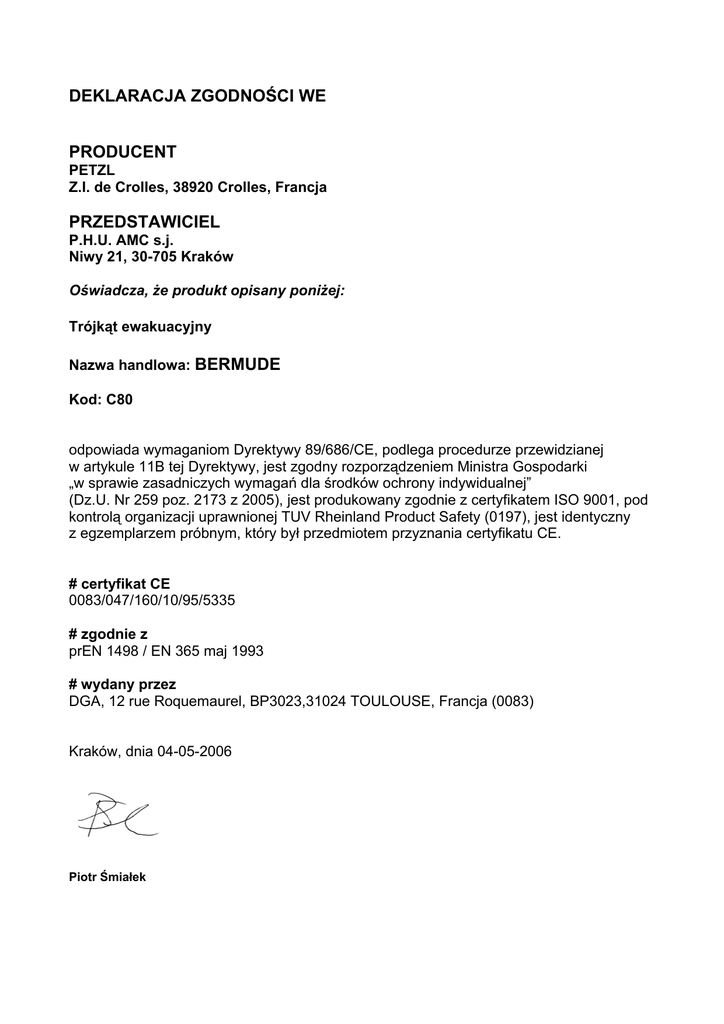 DEKLARACJA ZGODNOŚCI WE PRODUCENT PETZL Z.I. de Crolles, 38920 Crolles, Francja PRZEDSTAWICIEL P.H.U. AMC s.j. Niwy 21, 30-705 Kraków Oświadcza, że produkt opisany poniżej: Trójkąt ewakuacyjny Nazwa handlowa: BERMUDE Kod: C80 odpowiada wymaganiom Dyrektywy 89/686/CE, podlega procedurze przewidzianej w artykule 11B tej Dyrektywy, jest zgodny rozporządzeniem Ministra Gospodarki „w sprawie zasadniczych wymagań dla środków ochrony indywidualnej” (Dz.U. Nr 259 poz. 2173 z 2005), jest produkowany zgodnie z certyfikatem ISO 9001, pod kontrolą organizacji uprawnionej TUV Rheinland Product Safety (0197), jest identyczny z egzemplarzem próbnym, który był przedmiotem przyznania certyfikatu CE. # certyfikat CE 0083/047/160/10/95/5335 # zgodnie z prEN 1498 / EN 365 maj 1993 # wydany przez DGA, 12 rue Roquemaurel, BP3023,31024 TOULOUSE, Francja (0083) Kraków, dnia 04-05-2006 Piotr Śmiałek