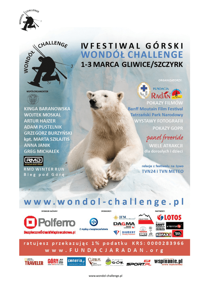 www.wondol-challenge.pl Piątek 1 marca 2013r: miejsce: CEK Politechniki Śląskiej Gliwice 10.00 – 12.00 blok filmów dla młodzieży 12.00 – 13.00 spotkanie z gościem festiwalu: Greg Michałek 17.00 – 19.30 19.30 – 20.30 20.30 – 21.30 21.30 – 22.30 22.30 – 23.15 blok filmów: z Banff Mountain Film Festival spotkanie z gościem festiwalu: Greg Michałek spotkanie z gościem festiwalu: Wojtek Moskal spotkanie z gościem festiwalu: Kinga Baranowska premiera filmu Darka Załuskiego "Two on K2" WSTĘP BEZPŁATNY! Sobota 2 marca 2013r miejsce: CKiR Orle Gniazdo Szczyrk SALA GŁÓWNA: 10.00 – 11.00 11.00 – 12.00 12.00 – 12.45 12.45- 13.05 13.05 – 13.30 13.30 – 16.00 16.00 – 17.00 17.00 – 18.00 18.00 – 19.00 19.00 – 20.00 20.00 – 21.00 21.00 – 22.00 22.00 - ____ pokaz filmu Marka Kamińskiego " White out – wyprawa poza cień" blok filmów: Tatrzański Park Narodowy PREMIERA filmu Darka Załuskiego "Two on K2" PREMIERA filmu "Pies Ratownik" wręczenie nagród RMD Winter Run blok filmów: Banff Mountain Film Festival spotkanie z gościem festiwalu: Grzegorz Burzyński spotkanie z gościem festiwalu: kpt. Marta Sziłajtis i Anna Janik spotkanie z gościem festiwalu: Adam Pustelnik spotkanie z gościem festiwalu: Artur Hajzer spotkanie z gościem festiwalu: Wojtek Moskal spotkanie z gościem festiwalu: Kinga Baranowska tańce, hulańce i swawole ;-) MAŁA SALA: 12.00 – 17.00 panel freeride/freeskiing SALA WYSTAWOWA: 10.00 – 21.00 wystawy fotografii m.in: Mateusza Moskalik, Agnieszki Rasińskiej, Jarosława Sobla oraz mulimedialne pokazy fotografii m.in. Krzysztofa Wojtery, Marka Szymochy 12.00-20.00 szkolenia z zakresu pierwszej pomocy prowadzone przez GOPR www.wondol-challenge.pl FESTIWALOWE PRZEDSZKOLE: 11.00 – 17.00 zabawy, konkursy i atrakcje dla dzieci Harmonogram Biegu RMD Winter Run 8.30 - otwarcie biura zawodów 9.30 - zamknięcie biura zawodów, zakończenie przyjmowania depozytów 9.45 - odprawa 10.00 START 13.00 zakończenie , wręczenie nagród, losowanie upominków (sala głowna) więcej o biegu na stronie http://www.alpinsport.pl/wondol/index.php W trakckie festiwalu na uczestników czekać będzie też wiele atrakcji i konkursów!!! niedziela 3 marca 2013r SALA GŁÓWNA 10.30 – 11.30 11.30 – 11.40 11.40– 14.10 14.10 – 15.00 pokaz filmu Marka Kamińskiego " White out – wyprawa poza cień" (powtórka) pokaz filmu "Pies Ratownik" (powtórka) blok filmów: Banff Mountain Film Festival (powtórka) blok filmów: Tatrzański Park Narodowy (powtórka) PLENER 10.00 - _____ otwarcie wiaty grillowej 11.00 – 14.00 atrakcje plenerowe -pokaz psich zaprzęgów -strzał z wondołowej armaty -pokazy technik ratowniczych GOPR -pokaz z użyciem śmigłowca (zależne od warunków pogodowych) W trakcie trwania atrakcji plenerwoych, oprocz zakupu pysznych grillowych potraw, będziec można ogrzać się przy ognisku i posłuchać kapeli góralskiej. WSTĘP: 20 PLN/ dzieci do lat 14: wstęp BEZPŁATNY www.wondol-challenge.pl