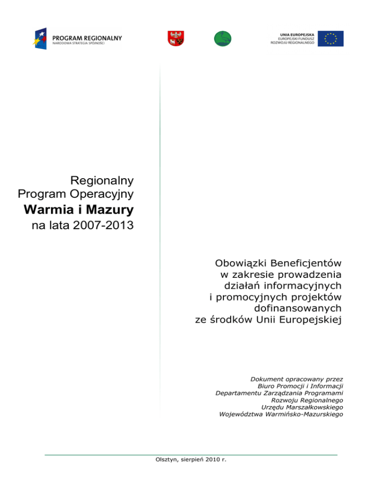 Regionalny Program Operacyjny Warmia i Mazury na lata 2007-2013 Obowiązki Beneficjentów w zakresie prowadzenia działań informacyjnych i promocyjnych projektów dofinansowanych ze środków Unii Europejskiej Dokument opracowany przez Biuro Promocji i Informacji Departamentu Zarządzania Programami Rozwoju Regionalnego Urzędu Marszałkowskiego Województwa Warmińsko-Mazurskiego Olsztyn, sierpień 2010 r. Obowiązki Beneficjentów w zakresie prowadzenia działań informacyjnych i promocyjnych projektów dofinansowanych ze środków Unii Europejskiej Spis treści Spis treści................................................................................... 2 1. Jak zaplanować działania informacyjne i promocyjne na etapie przygotowywania wniosku? ........................................ 3 2. W jaki sposób w praktyce promować i informować o projekcie? ........................................................................... 6 3. Wytyczne w sprawie obowiązkowych działań informacyjnych i promocyjnych .................................................................... 13 3.1. Tablica informacyjna ......................................................................................................13 3.2. Tablica pamiątkowa........................................................................................................14 3.3. Plakietka informacyjna....................................................................................................17 3.4. Serwis internetowy.........................................................................................................18 3.5. Spotkania informacyjne ..................................................................................................18 3.6. Publikacje i narzędzia komunikacji wizualnej i audiowizualnej ..............................................19 3.7. Zestawienia znaków graficznych/logotypów .......................................................................20 4. Stosowanie tablic informacyjnych, pamiątkowych oraz plakietek informacyjnych .................................................... 22 5. ZałoŜenia końcowe .............................................................. 23 6. Dobre i złe praktyki, przykłady ............................................ 25 2 Obowiązki Beneficjentów w zakresie prowadzenia działań informacyjnych i promocyjnych projektów dofinansowanych ze środków Unii Europejskiej 1. Jak zaplanować działania informacyjne i promocyjne na etapie przygotowywania wniosku? Podstawy prawne określające zakres działań informacyjnych i promocyjnych Podstawowe załoŜenia związane z prowadzeniem działań informacyjnych i promocyjnych określono w artykułach 60 oraz 69 Rozporządzenia Rady (WE) nr 1083/2006 z dnia 11 lipca 2006 roku ustanawiającego przepisy ogólne dotyczące Europejskiego Funduszu Rozwoju Regionalnego, Europejskiego Funduszu Społecznego oraz Funduszu Spójności i uchylającego rozporządzenie (WE) nr 1260/1999 (Dz. U. UE L Nr 210, str. 25 z późn. zm.). Artykuł 60 lit. j nakłada obowiązki w zakresie informacji i promocji na Instytucję Zarządzającą (IZ), natomiast Artykuł 69 określa podstawowe załoŜenia prowadzenia działań informacyjnych i promocyjnych dla wnioskodawców Funduszy Europejskich. Obowiązki Beneficjentów w zakresie działań informacyjnych i promocyjnych skierowanych do opinii publicznej wynikają z artykułów 8-9 Rozporządzenia Komisji (WE) nr 1828/2006 z dnia 8 grudnia 2006 r. oraz Rozporządzenia Komisji (WE) nr 846/2009 z dnia 1 września 2009 r., jak równieŜ obowiązków informacyjnych i promocyjnych stosowanych przez Państwa Członkowskie, wynikających z faktu dofinansowania projektów ze środków funduszy strukturalnych (Europejski Fundusz Rozwoju Regionalnego, Europejski Fundusz Społeczny) bądź z Funduszu Spójności. W myśl tych przepisów Beneficjenci są odpowiedzialni za informowanie opinii publicznej o pomocy otrzymanej z Funduszy Europejskich poprzez wykorzystanie określonych narzędzi i kanałów informacyjno-promocyjnych. Zgodnie z oficjalnym stanowiskiem Komisji Europejskiej z dnia 3 marca 2010 r. w sprawie kwalifikowalnych kosztów inwestycyjnych w rozumieniu Rozporządzenia Komisji (WE) nr 800/2008 z dnia 6 sierpnia 2008 r. uznającego niektóre rodzaje pomocy za zgodne ze wspólny rynkiem w zastosowaniu art. 87 i 88 Traktatu /ogólne rozporządzenie w sprawie wyłączeń blokowych/ (Dz. Urz. UE L 214 z 9.8.2008) oraz Wytycznych w sprawie krajowej pomocy regionalnej na lata 2007-2013 (Dz. Urz. EU C 54 z 4.3.2006), wydatki poniesione m.in. na informację i promocję w projektach objętych pomocą publiczną są niekwalifikowalne. Od dnia 13 maja 2010 r. koszty promocji projektu zaplanowane we wniosku o dofinansowanie nie mogą przekroczyć 2% wartości projektu brutto, z zastrzeŜeniem, Ŝe ta kwota nie moŜe być wyŜsza niŜ 100 000 złotych brutto. Ponadto w ramach przewidzianych na promocję kosztów obowiązuje zasada, iŜ koszt gadŜetów promocyjnych i organizacji konferencji nie moŜe przekroczyć 10% (oddzielnie na kaŜdą z wymienionych kategorii wydatków) całości środków zarezerwowanych na promocję danego projektu. Ogólne zasady prowadzenia działań informacyjnych i promocyjnych Beneficjent zobowiązuje się do przestrzegania zasad dotyczących informacji i promocji w momencie podpisania umowy o dofinansowanie projektu lub podjęcia uchwały o dofinansowaniu projektu. Beneficjent zobowiązuje się do: – informowania społeczeństwa o dofinansowaniu realizacji projektu przez Unię Europejską zgodnie z wymogami rozporządzenia Komisji nr 1828/2006 oraz wytycznymi i zaleceniami Instytucji Zarządzającej Regionalnym Programem Operacyjnym Warmia i Mazury na lata 2007-2013, – wypełniania obowiązków informacji i promocji w zakresie określonym we wniosku o dofinansowanie, 3 Obowiązki Beneficjentów w zakresie prowadzenia działań informacyjnych i promocyjnych proje