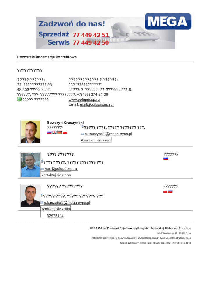 Pozostale informacje kontaktowe ??????????? ????? ??????: ????????????? ? ??????: ??. ??????????? 55, ??? "???????????" 48-303 ????? ???? ?????: ?. ??????, ??. ??????????, 8. ??????, ???- ???????? ????????. +7(495) 374-61-09 www.polupricep.ru ????? ??????? Email: [email protected] Seweryn Kruczynski ??????? ????? ????, ????? ??????? ???. [email protected] Skontaktuj sie z nami ???? ??????? ??????? ????? ????, ????? ??????? ???. [email protected] Skontaktuj sie z nami ?????? ????????? ??????? ????? ????, ????? ??????? ???. [email protected] Skontaktuj sie z nami 32973114 MEGA Zaklad Produkcji Pojazdow Uzytkowych i Konstrukcji Stalowych Sp. z o. o. | ul. Pilsudskiego 55 | 48-303 Nysa KRS:0000196021 - Sad Rejonowy w Opolu VIII Wydzial Gospodarczy Krajowego Rejestru Sadowego Kapital zakladowy - 60000 PLN | REGON 532431627 | NIP 754-276-24-31