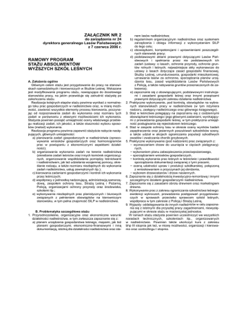 ZAŁĄCZNIK NR 2 do zarządzenia nr 24 dyrektora generalnego Lasów Państwowych z 7 czerwca 2006 r. RAMOWY PROGRAM STAŻU ABSOLWENTÓW WYŻSZYCH SZKÓŁ LEŚNYCH A. Założenia ogólne Głównym celem stażu jest przygotowanie do pracy na stanowiskach samodzielnych i kierowniczych w Służbie Leśnej. Wskazane jest modyfikowanie programu stażu, nawiązujące do docelowego stanowiska pracy, na jakim przewiduje się zatrudnić stażystę po zakończeniu stażu. Realizacja kolejnych etapów stażu powinna wynikać z normalnego toku prac gospodarczych w nadleśnictwie oraz, w miarę możliwości, zawierać wszystkie elementy procesu kierowania, poczynając od rozpoznawania zadań do wykonania oraz rozmiaru tych zadań w porównaniu z własnymi możliwościami ich wykonania. Stażysta powinien posiąść umiejętność oceny właściwego przebiegu realizacji zadań, ich jakości, a także słuszności wyboru sposobów (metod) wykonania. Realizacja programu powinna zapewnić stażyście nabycie następujących, głównych umiejętności: a) planowania zadań gospodarczych w nadleśnictwie (opracowywanie wniosków gospodarczych oraz harmonogramów prac w powiązaniu z ekonomicznymi aspektami działalności); b) organizowania wykonania zadań na terenie nadleśnictwa (określanie zadań leśnictw oraz innych komórek organizacyjnych, organizowanie współdziałania pomiędzy leśnictwami i nadleśnictwem, jak też udzielania wzajemnej pomocy, określanie rodzaju, a także rozmiaru niezbędnych do wykonania zadań nadleśnictwa, usług zewnętrznych itp.); c) kierowania zadaniami gospodarczymi i kontroli ich wykonania przez leśniczych; d) współpracy z jednostką nadzorującą, administracją samorządową, zespołem ochrony lasu, Strażą Leśną i Pożarną, Policją, organizacjami ochrony przyrody oraz środowiska, szkołami itp.; e) wykonywania niezbędnych prac planistycznych i biurowych związanych z pełnieniem obowiązków na kierowniczym stanowisku, w tym pełna znajomość SILP w nadleśnictwie. B. Problematyka szczegółowa stażu 1. Przyrodniczoleśne, organizacyjne oraz ekonomiczne warunki działalności nadleśnictwa, w tym zwłaszcza zapoznanie się z: a) planem urządzenia gospodarstwa leśnego, mapami, jak też planami gospodarczymi, ekonomiczno-finansowymi i inną dokumentacją, istotną dla działalności nadleśnictwa oraz sta- nem lasów nadleśnictwa; b) regulaminem organizacyjnym nadleśnictwa oraz systemem zarządzania i obiegu informacji z wykorzystaniem SILP do tego celu; c) obowiązkami, kompetencjami i uprawnieniami poszczególnych stanowisk pracy; d) podstawowymi aktami prawnymi dotyczącymi Lasów Państwowych i spełniania przez nie podstawowych ich zadań (ustawy: o lasach, ochronie przyrody, ochronie gruntów rolnych i leśnych; najważniejsze akty wykonawcze do ustawy o lasach dotyczące zasad gospodarki finansowej, Służby Leśnej, umundurowania, gospodarki mieszkaniowej, uznawania lasów za ochronne, sporządzania planów urządzenia lasu, zasad współdziałania Lasów Państwowych z Policją, a także nabywania gruntów przeznaczonych do zalesienia); e) zapoznanie się z obowiązującymi, podstawowymi instrukcjami i zasadami gospodarki leśnej oraz innymi przepisami prawnymi dotyczącymi zakresu działania nadleśnictwa. 2. Praktyczne wykonywanie, pod kontrolą, obowiązków na wybranych stanowiskach pracy w nadleśnictwie (w tym inżyniera nadzoru, zastępcy nadleśniczego oraz głównego księgowego). 3. Staż w leśnictwie polegający na zapoznaniu się z codziennymi obowiązkami leśniczego i jego głównymi zadaniami, wynikającymi z prowadzenia gospodarki leśnej, w tym praktyczna umiejętność posługiwania się rejestratorem leśniczego. 4. Staż w zespole ochrony lasu w okresie oceny wyników badań zapędraczenia oraz jesiennych poszukiwań szkodników sosny, a także udział w akcjach ograniczania populacji szkodliwych owadów i zwalczania chorób grzybowych. 5. Praktyczne wykonywanie (pod nadzorem) prac związanych z: − wyznaczaniem drzew do usunięcia w cięciach pielęgnacyjnych, − wykonaniem planu zabezpieczenia przeciwpożarowego, − sporządzaniem wniosków gospodarczych, − kontrolą wykonania prac leśnych w leśnictwie i prawidłowości sporządzania dokumentacji związanej z tymi pracami, − oceną udatności upraw i produkcji szkółkarskiej, połączoną z wnioskowaniem o przyczynach jej obniżenia, − wyborem drzewostanów i drzew nasiennych. 6. Zapoznanie się z działalnością inwestycyjno-remontową i innymi szczególnymi działami gospodarczymi nadleśnictwa. 7. Zapoznanie się z zasadami obrotu drewnem oraz marketingiem drewna. 8. Wykonywanie prac z zakresu ograniczania szkodnictwa leśnego: ewidencji wykroczeń, prowadzenia postępowań przygotowawczych w sprawach przeciwko sprawcom szkód leśnych, współpraca w tym zakresie z Policją i Strażą Leśną. 9. Wyjazdy: oddelegowania do innych nadleśnictw w celu zapoznania się z istotnymi dla przyszłej pracy zagadnieniami, niewystępującymi w okresie stażu w macierzystej jednostce. W ramach stażu stażysta powinien uczestniczyć we wszystkich naradach technicznych, szkoleniach itp., organizowanych w nadleśnictwie. Powinien także ukończyć kurs z zakresu bhp III stopnia jak też, w miarę możliwości, organizacji i kierowania oraz controllingu I stopnia.