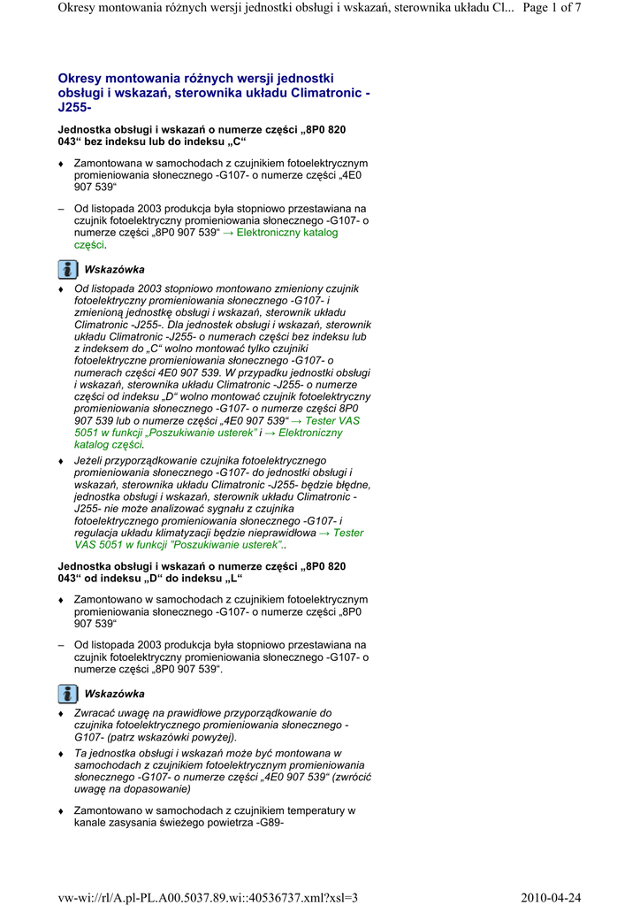 Okresy montowania różnych wersji jednostki obsługi i wskazań, sterownika układu Cl... Page 1 of 7 Okresy montowania różnych wersji jednostki obsługi i wskazań, sterownika układu Climatronic J255Jednostka obsługi i wskazań o numerze części „8P0 820 043“ bez indeksu lub do indeksu „C“ Zamontowana w samochodach z czujnikiem fotoelektrycznym promieniowania słonecznego -G107- o numerze części „4E0 907 539“ – Od listopada 2003 produkcja była stopniowo przestawiana na czujnik fotoelektryczny promieniowania słonecznego -G107- o numerze części „8P0 907 539“ → Elektroniczny katalog części. Wskazówka Od listopada 2003 stopniowo montowano zmieniony czujnik fotoelektryczny promieniowania słonecznego -G107- i zmienioną jednostkę obsługi i wskazań, sterownik układu Climatronic -J255-. Dla jednostek obsługi i wskazań, sterownik układu Climatronic -J255- o numerach części bez indeksu lub z indeksem do „C“ wolno montować tylko czujniki fotoelektryczne promieniowania słonecznego -G107- o numerach części 4E0 907 539. W przypadku jednostki obsługi i wskazań, sterownika układu Climatronic -J255- o numerze części od indeksu „D“ wolno montować czujnik fotoelektryczny promieniowania słonecznego -G107- o numerze części 8P0 907 539 lub o numerze części „4E0 907 539“ → Tester VAS 5051 w funkcji „Poszukiwanie usterek” i → Elektroniczny katalog części. Jeżeli przyporządkowanie czujnika fotoelektrycznego promieniowania słonecznego -G107- do jednostki obsługi i wskazań, sterownika układu Climatronic -J255- będzie błędne, jednostka obsługi i wskazań, sterownik układu Climatronic J255- nie może analizować sygnału z czujnika fotoelektrycznego promieniowania słonecznego -G107- i regulacja układu klimatyzacji będzie nieprawidłowa → Tester VAS 5051 w funkcji ”Poszukiwanie usterek”.. Jednostka obsługi i wskazań o numerze części „8P0 820 043“ od indeksu „D“ do indeksu „L“ Zamontowano w samochodach z czujnikiem fotoelektrycznym promieniowania słonecznego -G107- o numerze części „8P0 907 539“ – Od listopada 2003 produkcja była stopniowo przestawiana na czujnik fotoelektryczny promieniowania słonecznego -G107- o numerze części „8P0 907 539“. Wskazówka Zwracać uwagę na prawidłowe przyporządkowanie do czujnika fotoelektrycznego promieniowania słonecznego G107- (patrz wskazówki powyżej). Ta jednostka obsługi i wskazań może być montowana w samochodach z czujnikiem fotoelektrycznym promieniowania słonecznego -G107- o numerze części „4E0 907 539“ (zwrócić uwagę na dopasowanie) Zamontowano w samochodach z czujnikiem temperatury w kanale zasysania świeżego powietrza -G89- vw-wi://rl/A.pl-PL.A00.5037.89.wi::40536737.xml?xsl=3 2010-04-24 Okresy montowania różnych wersji jednostki obsługi i wskazań, sterownika układu Cl... Page 2 of 7 – Od roku modelowego 2006 stopniowo wycofywany jest czujnik temperatury w kanale zasysania świeżego powietrza -G89-. Wskazówka Od roku modelowego 2006 stopniowo wycofywany jest czujnik temperatury w kanale zasysania świeżego powietrza -G89-, w samochodach bez tego czujnika temperatury mogą być lub zostać zamontowane tylko jednostki obsługi i wskazań, sterownik układu Climatronic -J255- o numerze części od indeksu „M“. Jeśli w samochodach bez czujnika temperatury w kanale zasysania świeżego powietrza -G89- jest zamontowana jednostka obsługi i wskazań, sterownik układu Climatronic J255- o numerze części do indeksu „L“, w pamięci usterek zostaje zapisana usterka → Tester VAS 5051 w funkcji „Poszukiwanie usterek”. Jednostka obsługi i wskazań o numerze części „8P0 820 043“ od indeksu „M“ do indeksu „AD“ Zamontowana w samochodach bez i z czujnikiem temperatury w kanale zasysania świeżego powietrza -G89-. – Od roku modelowego 2006 stopniowo wycofywany jest czujnik temperatury w kanale zasysania świeżego powietrza -G89-. Wskazówka Te jednostki obsługi i wskazań mogą być również montowane w samochodach z czujnikiem temperatury w kanale zasysania świeżego powietrza -G89-. Zamontowano w samochodach z silnikiem nastawczym klapy dławienia -V71- – Do końca roku modelowego 2007 stopniowo wycofywany jest silnik nastawczy klapy dławienia -V71-. Wskazówka Do końca roku modelowego 2007 stopniowo wycofywany jest silnik nastawczy klapy dławienia -V71-, w samochodach bez silnika nastawczego klapy dławienia -V71- klapa dławienia (klapa świeżego powietrza) uruchamiana jest poprzez krzywkę tarczową i dźwignię silnika nastawczego klapy zamkniętego obiegu powietrza -V113- → Rozdział. Dlatego zwracać uwagę na prawidłowe przyporządkowanie jednostki obsługi i wskazań, sterownika układu Climatronic -J255-, jeśli przyporządkowanie jest nieprawidłowe, zostanie to rozpoznane podczas nastaw podstawowych i zapisane jako usterka → Tester VAS 5051 w funkcji „Poszukiwanie usterek” i → Elektroniczny katalog części. Jeśli w samochodach bez silnika nastawczego klapy dławienia -V71- zostanie zamontowana jednostka obsługi i wskazań, sterownik układu Climatronic -J255- o numerze części do indeksu „AD“, w pamięci usterek zostaje zapisana usterka. Zamontowano w samochodach z obudową rozdzielacza powietrza układu klimatyzacji z klapą na wylocie powietrza do dysz rozmrażania w tablicy przyrządów z bocznym wycięciem. – Od listopada 2007 wprowadzane są stopniowo obudowy rozdzielacza powietrza układu klimatyzacji z klapą na wylocie powietrza do dysz rozmrażania w tablicy przyrządów bez bocznego wycięcia → Rozdział vw-wi://rl/A.pl-PL.A00.5037.89.wi::40536737.xml?xsl=3 2010-04-24 Okresy montowania różnych wersji jednostki obsługi i wskazań, sterownika układu Cl... Page 3 of 7 Wskazówka Zwracać uwagę na prawidłowe przyporządkowanie, jednostka obsługi i wskazań o numerze części „8P0 820 043“ do indeksu „AD“ nie może zostać zamon