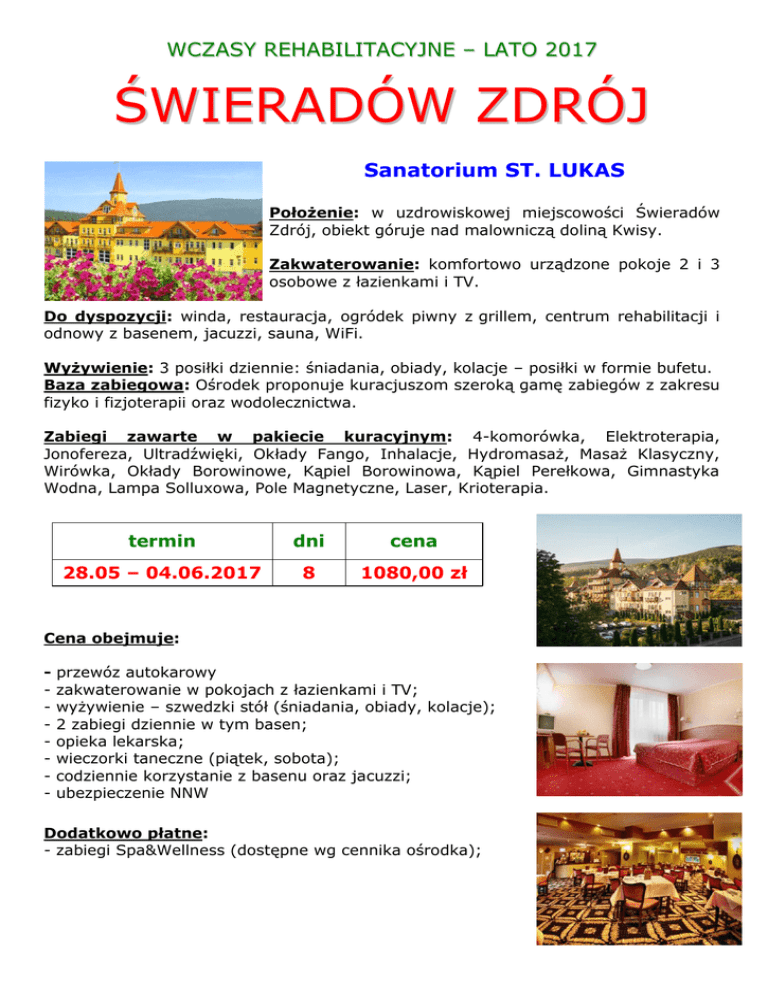 WCZASY REHABILITACYJNE – LATO 2017 ŚWIERADÓW ZDRÓJ Sanatorium ST. LUKAS Położenie: w uzdrowiskowej miejscowości Świeradów Zdrój, obiekt góruje nad malowniczą doliną Kwisy. Zakwaterowanie: komfortowo urządzone pokoje 2 i 3 osobowe z łazienkami i TV. Do dyspozycji: winda, restauracja, ogródek piwny z grillem, centrum rehabilitacji i odnowy z basenem, jacuzzi, sauna, WiFi. Wyżywienie: 3 posiłki dziennie: śniadania, obiady, kolacje – posiłki w formie bufetu. Baza zabiegowa: Ośrodek proponuje kuracjuszom szeroką gamę zabiegów z zakresu fizyko i fizjoterapii oraz wodolecznictwa. Zabiegi zawarte w pakiecie kuracyjnym: 4-komorówka, Elektroterapia, Jonofereza, Ultradźwięki, Okłady Fango, Inhalacje, Hydromasaż, Masaż Klasyczny, Wirówka, Okłady Borowinowe, Kąpiel Borowinowa, Kąpiel Perełkowa, Gimnastyka Wodna, Lampa Solluxowa, Pole Magnetyczne, Laser, Krioterapia. termin dni cena 28.05 – 04.06.2017 8 1080,00 zł Cena obejmuje: - przewóz autokarowy zakwaterowanie w pokojach z łazienkami i TV; wyżywienie – szwedzki stół (śniadania, obiady, kolacje); 2 zabiegi dziennie w tym basen; opieka lekarska; wieczorki taneczne (piątek, sobota); codziennie korzystanie z basenu oraz jacuzzi; ubezpieczenie NNW Dodatkowo płatne: - zabiegi Spa&Wellness (dostępne wg cennika ośrodka);