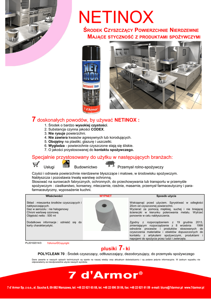 NETINOX ŚRODEK CZYSZCZĄCY POWIERZCHNIE NIERDZEWNE MAJĄCE STYCZNOŚĆ Z PRODUKTAMI SPOŻYWCZYMI 7 doskonałych powodów, by używać NETINOX : 1. Środek o bardzo wysokiej czystości. 2. Substancja czynna jakości CODEX. 3. Nie rysuje powierzchni. 4. Nie zawiera kwasów agresywnych lub korodujących. 5. Obojętny na plastiki, glazurę i uszczelki. 6. Wygładza - powierzchnie czyszczone stają się śliskie. 7. O jakości przystosowanej do kontaktu spożywczego. Specjalnie przystosowany do użytku w następujących branżach: Usługi Budownictwo Przemysł rolno-spożywczy Czyści i odnawia powierzchnie nierdzewne błyszczące i matowe, w środowisku spożywczym. Nabłyszcza i pozostawia trwałą warstwę ochronną. Stosować na surowcach fabrycznych, ochronnych, do przechowywania lub transportu w przemyśle spożywczym : ciastkarstwo, konserwy, mleczarnie, rzeźnie, masarnie, przemysł farmaceutyczny i parafarmaceutyczny, wyposażenie kuchni. Właściwości WYPNET Sposób użycia Skład : mieszanka środków czyszczących i nabłyszczających. Gaz w aerozolu : nie halogenowy Chroni wartswę ozonową Objętość netto : 500 ml Wstrząsnąć przed użyciem. Spryskiwać w odległości 20cm od czyszczonej powierzchni. Wycierać za pomocą miękkiej, suchej i nie liniejącej ściereczki w kierunku polerowania metalu. Wytrzeć ponownie w celu nabłyszczenia. Dodatkowe informacje : odnieść się do karty charakterystyki. Zgodny z rozporządzeniem z 19 grudnia 2013, zmieniającym rozporządzenie z 8 września 1999 odnośnie procesów i produktów stosowanych do czyszczenia materiałów i obiektów dopuszczonych do kontaktu z artykułami spożywczymi, produktami i napojami do spożycia przez ludzi i zwierzęta. PL20102014/3 7dArmor©Copyright plusiki 7- ki POLYCLEAN 70 : Środek czyszczący, odtłuszczający, dezodoryzujący, do przemysłu spożywczego Dane zawarte w naszych opisach technicznych są oparte na naszej wiedzy oraz aktualnym doświadczeniu i są podane jedynie informacyjnie. W żadnym wypadku nie odpowiadamy za nieodpowiednie użycie naszych wyrobów.