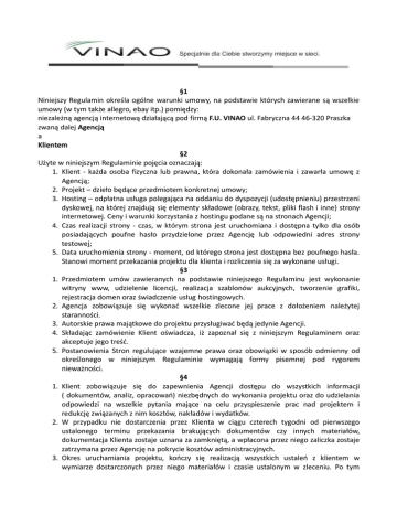 §1 Niniejszy Regulamin określa ogólne warunki umowy, na podstawie których zawierane są wszelkie umowy (w tym także allegro, ebay itp.) pomiędzy: niezależną agencją internetową działającą pod firmą F.U. VINAO ul. Fabryczna 44 46-320 Praszka zwaną dalej Agencją a Klientem §2 Użyte w niniejszym Regulaminie pojęcia oznaczają: 1. Klient - każda osoba fizyczna lub prawna, która dokonała zamówienia i zawarła umowę z Agencją; 2. Projekt – dzieło będące przedmiotem konkretnej umowy; 3. Hosting – odpłatna usługa polegająca na oddaniu do dyspozycji (udostępnieniu) przestrzeni dyskowej, na której znajdują się elementy składowe (obrazy, tekst, pliki flash i inne) strony internetowej. Ceny i warunki korzystania z hostingu podane są na stronach Agencji; 4. Czas realizacji strony - czas, w którym strona jest uruchomiana i dostępna tylko dla osób posiadających poufne hasło przydzielone przez Agencję lub odpowiedni adres strony testowej; 5. Data uruchomienia strony - moment, od którego strona jest dostępna bez poufnego hasła. Stanowi moment przekazania projektu dla klienta i rozliczenia się za wykonane usługi. §3 1. Przedmiotem umów zawieranych na podstawie niniejszego Regulaminu jest wykonanie witryny www, udzielenie licencji, realizacja szablonów aukcyjnych, tworzenie grafiki, rejestracja domen oraz świadczenie usług hostingowych. 2. Agencja zobowiązuje się wykonać wszelkie zlecone jej prace z dołożeniem należytej staranności. 3. Autorskie prawa majątkowe do projektu przysługiwać będą jedynie Agencji. 4. Składając zamówienie Klient oświadcza, iż zapoznał się z niniejszym Regulaminem oraz akceptuje jego treść. 5. Postanowienia Stron regulujące wzajemne prawa oraz obowiązki w sposób odmienny od określonego w niniejszym Regulaminie wymagają formy pisemnej pod rygorem nieważności. §4 1. Klient zobowiązuje się do zapewnienia Agencji dostępu do wszystkich informacji ( dokumentów, analiz, opracowań) niezbędnych do wykonania projektu oraz do udzielania odpowiedzi na wszelkie pytania mające na celu przyspieszenie prac nad projektem i redukcję związanych z nim kosztów, nakładów i wydatków. 2. W przypadku nie dostarczenia przez Klienta w ciągu czterech tygodni od pierwszego ustalonego terminu przekazania brakujących dokumentów czy innych materiałów, dokumentacja Klienta zostaje uznana za zamkniętą, a wpłacona przez niego zaliczka zostaje zatrzymana przez Agencję na pokrycie kosztów administracyjnych. 3. Okres uruchamiania projektu, kończy się realizacją wszystkich ustaleń z klientem w wymiarze dostarczonych przez niego materiałów i czasie ustalonym w zleceniu. Po tym 4. 1. 2. 3. 4. 1. 2. 3. • • • • 1. 2. 3. 4. 1. 2. 3. 4. 5. 6. terminie, projekt uważa się za zrealizowany i zakończony, co upoważnia Agencję do wystawienia rachunku końcowego, a klienta zobowiązuje do zapłacenia honorarium w ciągu siedmiu dni. Rachunki za usługi wystawiane są do 7 dni od zakupu. §5 Jeżeli Strony nie postanowią inaczej, umowa zawarta z Klientem nie przenosi prawa własności do projektu a jedynie uprawnia do jego użytkowania. Projekt może zostać użytkowany tylko w celu, wynikającym z umowy. Użytkowanie w zakresie odmiennym od określonego w umowie bądź przekazanie prawa użytkowania osobie trzeciej wymaga zawsze pisemnej zgody Agencji. Prawo użytkowania powstaje od momentu pełnej zapłaty wynagrodzenia. §6 Agencja udziela Klientowi licencji na wykonany projekt. Udzielona licencja jest licencją niewyłączną w związku z czym na podstawie art. 67 ust. 2 ustawy o prawie autorskim i prawach pokrewnych udzielenie licencji nie ogranicza udzielenia przez Agencję upoważnienia innym osobom do korzystania z projektu na tym samym polu eksploatacji. Klient uzyskuje prawo do korzystania z projektu na następujących polach eksploatacji: modyfikacji dzieła zgodnie z potrzebami Klienta, utrwalania każdą techniką, zwielokrotniania każdą techniką, wprowadzania do pamięci komputera w tym sieci Internet. Licencja uprawnia do korzystania z projektu, na terytorium Polski, na czas nieokreślony. Licencja udzielana jest pod warunkiem zapłaty przez Klienta wszystkich wynikających z umowy kwot należnych Agencji. Klient nie może upoważnić innej osoby do korzystania z projektu w zakresie uzyskanej licencji, chyba że Strony wyraźnie dopuszczą taką możliwość w umowie . Klient nie jest uprawniony do wykorzystywania w jakikolwiek sposób projektów lub pomysłów przedłożonych mu w fazie wstępnej (roboczej) przez Agencję. Dotyczy to także wykorzystywania ich części lub użytkowania ich w zmienionej formie bądź przez osoby trzecie. §7 Za wykonanie projektu oraz udzielenie licencji Agencji przysługuje wynagrodzenie. Klient w momencie udzielenia Agencji zlecenia, uznaje swój obowiązek uiszczenia ustalonego honorarium za wykonany przez Agencję projekt oraz wszelkie inne czynności pozostające z nimi w związku (doradztwo, koncepcja, grafika, teksty itd.). Także wtedy, gdy wykonanych projektów i wszelkich innych czynności nie wykorzysta. Agencja zachowuje prawo do wynagrodzenia także wtedy, gdy w drodze umowy nie zostało przekazane prawo użytkowania, a przedmiotem umowy jest jedynie dostarczenie projektów lub/i szkiców bądź wykonanie innych czynności. Propozycje Klienta oraz wszelka jego pomoc w wykonaniu projektu nie mają wpływu na wysokość wynagrodzenia i nie powodują powstania wspólnego prawa własności bądź praw autorskich. Agencja zachowuje prawo do pełnej wysokości wynagrodzenia także wtedy, gdy zlecenie nie dochodzi do skutku z przyczyn nie leżących po jej stronie. Agencja nie jest zobowiązana do wydania klientowi wszystkich danych i plików utworzonych za pomocą komputera i w nim zachowanych. Jeżeli Klient domaga się ich wydania, zobowiązuje się jednocześnie do stosownego wynagrodzenia za taką usługę. Wydane Klientowi dane i pliki mogą zos