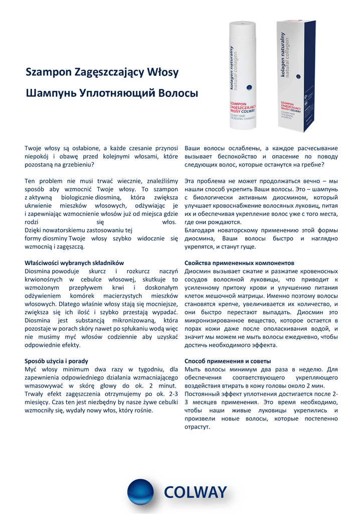 Szampon Zagęszczający Włosy Шампунь Уплотняющий Волосы Twoje włosy są osłabione, a każde czesanie przynosi Ваши волосы ослаблены, а каждое расчесывание niepokój i obawę przed kolejnymi włosami, które вызывает беспокойство и опасение по поводу pozostaną na grzebieniu? следующих волос, которые останутся на гребне? Ten problem nie musi trwać wiecznie, znaleźliśmy sposób aby wzmocnić Twoje włosy. To szampon z aktywną biologicznie diosminą, która zwiększa ukrwienie mieszków włosowych, odżywiając je i zapewniając wzmocnienie włosów już od miejsca gdzie rodzi się włos. Dzięki nowatorskiemu zastosowaniu tej formy diosminy Twoje włosy szybko widocznie się wzmocnią i zagęszczą. Эта проблема не может продолжаться вечно – мы нашли способ укрепить Ваши волосы. Это – шампунь с биологически активным диосмином, который улучшает кровоснабжение волосяных луковиц, питая их и обеспечивая укрепление волос уже с того места, где они рождаются. Благодаря новаторскому применению этой формы диосмина, Ваши волосы быстро и наглядно укрепятся, и станут гуще. Właściwości wybranych składników Diosmina powoduje skurcz i rozkurcz naczyń krwionośnych w cebulce włosowej, skutkuje to wzmożonym przepływem krwi i doskonałym odżywieniem komórek macierzystych mieszków włosowych. Dlatego właśnie włosy stają się mocniejsze, zwiększa się ich ilość i szybko przestają wypadać. Diosmina jest substancją mikronizowaną, która pozostaje w porach skóry nawet po spłukaniu wodą więc nie musimy myć włosów codziennie aby uzyskać odpowiednie efekty. Свойства примененных компонентов Диосмин вызывает сжатие и разжатие кровеносных сосудов волосяной луковицы, что приводит к усиленному притоку крови и улучшению питания клеток мешочной матрицы. Именно поэтому волосы становятся крепче, увеличивается их количество, и они быстро перестают выпадать. Диосмин это микронизированное вещество, которое остается в порах кожи даже после ополаскивания водой, и значит мы можем не мыть волосы ежедневно, чтобы достичь необходимого эффекта. Sposób użycia i porady Myć włosy minimum dwa razy w tygodniu, dla zapewnienia odpowiedniego działania wzmacniającego wmasowywać w skórę głowy do ok. 2 minut. Trwały efekt zagęszczenia otrzymujemy po ok. 2-3 miesięcy. Czas ten jest niezbędny by nasze żywe cebulki wzmocniły się, wydały nowy włos, który rośnie. Способ применения и советы Мыть волосы минимум два раза в неделю. Для обеспечения соответствующего укрепляющего воздействия втирать в кожу головы около 2 мин. Постоянный эффект уплотнения достигается после 23 месяцев применения. Это время необходимо, чтобы наши живые луковицы укрепились и произвели новые волосы, которые постепенно отрастут.