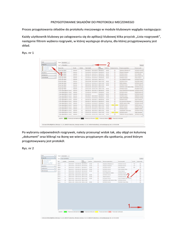 PRZYGOTOWANIE SKŁADÓW DO PROTOKOŁU MECZOWEGO Proces przygotowania składów do protokołu meczowego w module klubowym wygląda następująco: Każdy użytkownik klubowy po zalogowaniu się do aplikacji klubowej klika przycisk „Lista rozgrywek”, następnie filtrem wybiera rozgrywki, w której występuje drużyna, dla której przygotowywany jest skład. Rys. nr 1 Po wybraniu odpowiednich rozgrywek, należy przesunąć widok tak, aby objął on kolumnę „dokument” oraz kliknąć na ikonę we wierszu przypisanym dla spotkania, przed którym przygotowywany jest protokół. Rys. nr 2 Następnie należy kliknąć przycisk „edytuj” przy „sprawozdaniu sędziego – skład” Rys. nr 3 Następnie należy kliknąć w pierwsze wolne pole w kolumnie „Imię i Nazwisko” Rys. nr 4 W oknie „edycja zawodnika w składnie”, należy wybrać z dostępnej listy zawodnika. Jeśli jest on bramkarzem bądź kapitanem, trzeba zaznaczyć odpowiednie pole. Pole „numer” musi zostać wypełnione. Pola „Imię i Nazwisko”, „Data urodzenia” oraz „Młodzieżowiec” zostaną uzupełnione automatycznie po wybraniu zawodnika z listy. Po uzupełnieniu danych należy kliknąć przycisk „zapisz”. W przypadku, gdy zawodnik ma nałożoną karę zawieszenia, na przykład za zbyt dużą liczbę kartek, zostanie od podkreślony kolorem czerwonym, co jest jednoznaczne z informacją, że dany zawodnik nie jest uprawniony do wystąpienia w danym meczu. Proces należy powtórzyć dla wszystkich zawodników podstawowego składu. Rys. nr 5 Następnie, należy kliknąć zakładkę „rezerwowi”, kliknąć wolne pole w kolumnie „Imię i nazwisko” oraz powtórzyć proces uzupełnienia zawodników rezerwowych zgodnie z rysunkiem nr 5. Rys. nr 6 Następnie, trzeba kliknąć zakładkę „Osoby uprawnione do przebywania na ławce rezerwowych” i kliknąć wolne pole w kolumnie „Funkcja” Rys. nr 7 W oknie „Edycja danych osoby uprawnionej do przebywania na ławce rezerwowych” Należy wpisać imię i nazwisko danej osoby oraz wybrać z listy funkcję, jaką pełni podczas meczu. W przypadku, gdy jest to trener, w polu, które się pojawi, należy wpisać numer licencji oraz kliknąć przycisk „Dodaj”. Czynność należy powtórzyć dla wszystkich osób, które w danym meczu będę przebywały na ławce rezerwowych. Rys. nr 8 Po wpisaniu wszystkich zawodników podstawowego składu, rezerwowych oraz osób uprawnionych do przebywania na ławce rezerwowych, należy kliknąć przycisk „Zapisz”. Rys. nr 9 Protokół meczowy został zapisany w systemie extranet. Celem jego wydrukowania należy zgodnie z rysunkiem nr 2 kliknąć ikonę w kolumnie „dokument” dla odpowiedniego meczu, kliknąć przycisk „pobierz jak PDF” oraz zapisać plik na dysku twardym komputera. Wypełniony protokół ze składem jest gotowy do druku.