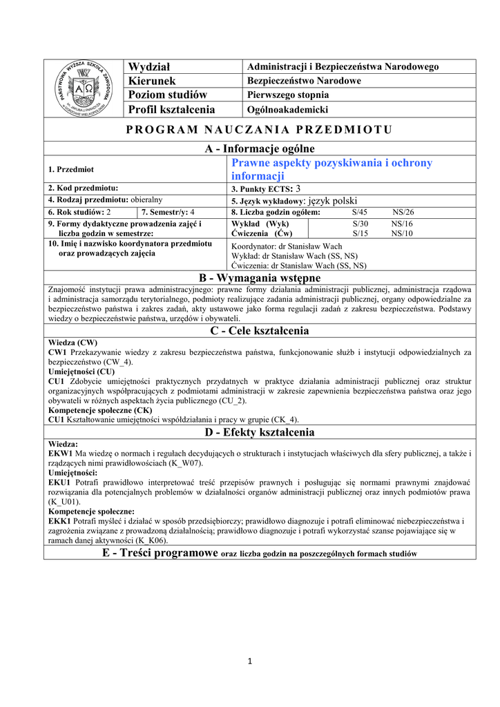 Wydział Kierunek Poziom studiów Profil kształcenia Administracji i Bezpieczeństwa Narodowego Bezpieczeństwo Narodowe Pierwszego stopnia Ogólnoakademicki PROGRAM NAUCZANIA PRZEDMIOTU 1. Przedmiot A - Informacje ogólne Prawne aspekty pozyskiwania i ochrony informacji 2. Kod przedmiotu: 4. Rodzaj przedmiotu: obieralny 6. Rok studiów: 2 7. Semestr/y: 4 9. Formy dydaktyczne prowadzenia zajęć i liczba godzin w semestrze: 10. Imię i nazwisko koordynatora przedmiotu oraz prowadzących zajęcia 3. Punkty ECTS: 3 5. Język wykładowy: język 8. Liczba godzin ogółem: Wykład (Wyk) Ćwiczenia (Ćw) polski S/45 S/30 S/15 NS/26 NS/16 NS/10 Koordynator: dr Stanisław Wach Wykład: dr Stanisław Wach (SS, NS) Ćwiczenia: dr Stanislaw Wach (SS, NS) B - Wymagania wstępne Znajomość instytucji prawa administracyjnego: prawne formy działania administracji publicznej, administracja rządowa i administracja samorządu terytorialnego, podmioty realizujące zadania administracji publicznej, organy odpowiedzialne za bezpieczeństwo państwa i zakres zadań, akty ustawowe jako forma regulacji zadań z zakresu bezpieczeństwa. Podstawy wiedzy o bezpieczeństwie państwa, urzędów i obywateli. C - Cele kształcenia Wiedza (CW) CW1 Przekazywanie wiedzy z zakresu bezpieczeństwa państwa, funkcjonowanie służb i instytucji odpowiedzialnych za bezpieczeństwo (CW_4). Umiejętności (CU) CU1 Zdobycie umiejętności praktycznych przydatnych w praktyce działania administracji publicznej oraz struktur organizacyjnych współpracujących z podmiotami administracji w zakresie zapewnienia bezpieczeństwa państwa oraz jego obywateli w różnych aspektach życia publicznego (CU_2). Kompetencje społeczne (CK) CU1 Kształtowanie umiejętności współdziałania i pracy w grupie (CK_4). D - Efekty kształcenia Wiedza: EKW1 Ma wiedzę o normach i regułach decydujących o strukturach i instytucjach właściwych dla sfery publicznej, a także i rządzących nimi prawidłowościach (K_W07). Umiejętności: EKU1 Potrafi prawidłowo interpretować treść przepisów prawnych i posługując się normami prawnymi znajdować rozwiązania dla potencjalnych problemów w działalności organów administracji publicznej oraz innych podmiotów prawa (K_U01). Kompetencje społeczne: EKK1 Potrafi myśleć i działać w sposób przedsiębiorczy; prawidłowo diagnozuje i potrafi eliminować niebezpieczeństwa i zagrożenia związane z prowadzoną działalnością; prawidłowo diagnozuje i potrafi wykorzystać szanse pojawiające się w ramach danej aktywności (K_K06). E - Treści programowe oraz liczba godzin na poszczególnych formach studiów 1 Wykład: Rodzaje informacji oraz ich znaczenie w funkcjonowaniu państwa. Ochrona informacji. Ochrona danych osobowych – charakterystyka ustawy. Przetwarzanie danych osobowych. Zasady przetwarzania danych osobowych. Podmioty zobowiązane do przestrzegania Ustawy o ochronie danych osobowych. Przesłanki przetwarzania danych osobowych: a. przetwarzanie danych zwykłych, b. przetwarzanie danych wrażliwych. Zabezpieczenie danych osobowych. Prawa osoby, której dane dotyczą Organy ochrony danych osobowych. Odpowiedzialność za naruszenie Ustawy o ochronie danych osobowych. Ochrona informacji niejawnych: Pojęcie i rodzaje informacji niejawnych. Organizacja ochrony informacji niejawnych. Dostęp do informacji niejawnych. Postępowanie sprawdzające względem podmiotów mających dostęp do informacji niejawnych. Zabezpieczenie informacji niejawnych. Bezpieczeństwo przemysłowe. Razem liczba godzin wykładów S 1 1 1 1 1 2 1 4 4 1 2 1 1 2 3 1 1 1 1 Ns 0,5 0,5 0,5 0,5 0,5 1 1,5 1 1 1 1 1 1 1 1 1 1 1 1 30 16 Razem liczba godzin ćwiczeń S 10 5 15 Ns 6 4 10 Ogółem liczba godzin przedmiotu: 45 26 Ćwiczenia: Studium przypadków. Praca w grupach. F – Metody nauczania oraz środki dydaktyczne Wykład problemowy. Środki dydaktyczne: sprzęt multimedialny, założenia (przykłady) do rozwiązywania problemów, teczki z przykładami spraw. F – formująca: sprawdzian ustny wiedzy G - Metody oceniania P– podsumowująca: zaliczenie pisemne ćwiczenia praktyczne Forma zaliczenia przedmiotu: zaliczenie na ocenę H - Literatura przedmiotu Literatura obowiązkowa: 1. 2. 3. T. Szewc: Publicznoprawna ochrona informacji, Warszawa 2007r., T.R. Aleksandrowicz: Komentarz do Ustawy o dostępie do informacji publicznej, Warszawa 2006r. I. Stankowska: Ustawa o ochronie informacji niejawnych., Warszawa 2010r. Literatura uzupełniająca 1. M. Polak: Ochrona informacji państwowej i służbowej w polskim systemie prawnym,, Warszawa 2006r. I – Informacje dodatkowe Imię i nazwisko sporządzającego Data sporządzenia / aktualizacji Dane kontaktowe (e-mail, telefon) Stanisław Wach 01.10.2013 tel. kom. 660 476 490 Podpis 2 Tabele sprawdzające program nauczania przedmiotu Prawne aspekty pozyskiwania i ochrony informacji na kierunku BEZPIECZEŃSTWO NARODOWE Tabela 1. Sprawdzenie, czy metody oceniania gwarantują określenie zakresu, w jakim uczący się osiągnął zakładane kompetencje – powiązanie efektów kształcenia, metod uczenia się i oceniania: Metoda oceniania 1 zaliczenie Studium Sprawdzian Efekty kształcenia Obserwacja Dyskusja Inne przypadku – pisemne/ wykład EKW1 EKU1 EKK1 x ustny – ćwiczenia ćwiczenia x x x x x ćwiczenia ćwiczenia x x x x x Tabela 2. Obciążenie pracą studenta: Forma aktywności studenta Godziny zajęć z nauczycielem/ami Czytanie literatury Przygotowanie do sprawdzianu Przygotowanie do egzaminu Liczba punktów ECTS dla przedmiotu Średnia liczba godzin na realizację studia stacjonarne studia niestacjonarne 45 26 10 19 10 15 10 15 75 pkt./25 pkt. = 3pkt. ECTS Sporządził: Stanisław Wach Data: 01.10.2013 Podpis………………………. 1 Liczba kolumn uzależniona od stosowanych metod oceniania wymienionych w punkcie G 3 …… Tabela 3. Powiązanie celów i efektów kształcenia przedmiotu Prawne aspekty pozyskiwania i ochrony informacji treści pro