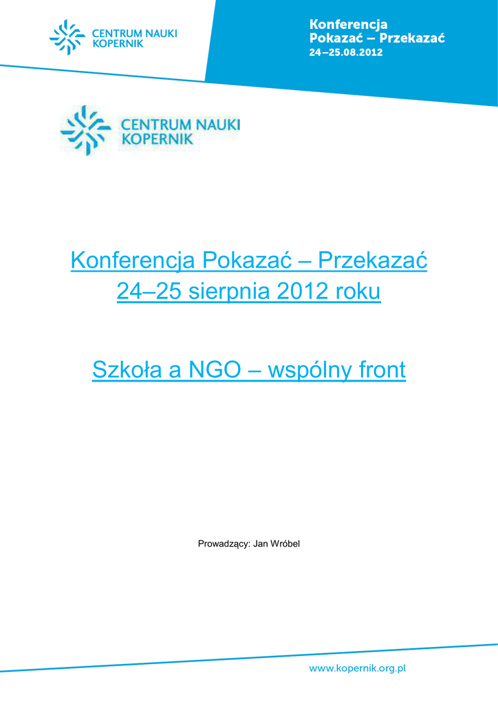 Konferencja Pokazać – Przekazać 24–25 sierpnia 2012 roku Szkoła a NGO – wspólny front Prowadzący: Jan Wróbel Czy organizacja pozarządowa – wielokrotnie mniejsza od Ministerstwa Edukacji Narodowej i rozporządzająca wielokrotnie mniejszymi możliwościami finansowymi, niż samorządy – jest w ogóle w stanie odegrać rolę, a nie tylko rólkę w reformach podejmowanych w polskiej oświacie? Jeżeli rozumieć reformy jako zarządzanie systemem oraz jako wprowadzanie zmian instytucjonalnych, „wielcy” mają przewagę. Jeżeli reformę zdefiniować jako wzbudzanie energii i zasobów, rola organizacji pozarządowej jest jedną z najgłówniejszych. MEN proponuje i wymaga (co tworzy, jak łatwo zauważyć, oksymoron). NGO – organizacja społeczna – proponuje… i to od niej wymagają ci, którzy dali jej się przekonać. Weryfikacja jest szybka, a powodzenie dzieła proponowanego przez NGO z zasady wymaga wsparcia, a raczej współdziałania tych, którzy propozycję „kupili”. Tym samym odbiorcy pewnego pomysłu kształtują jego ostateczny kształt. Ekipy wchodzące do ministerstwa po każdych wyborach podejmują dzieło kolejnych reform. Chcą dobrze, muszą szybko. Zważywszy, że ostatni rok przed wyborami jest dla reform na ogół stracony, horyzont czasowy ministerialnych reformatorów to trzy lata. Organizacja pozarządowa pracuje w innym przedziale – od początku do końca. W przypadku funduszu dzieci szczególnie uzdolnionych „od początku do końca” to znaczy od wyłowienia odpowiednich dla projektu kandydatów, a koniec projektu następuje wtedy, kiedy absolwenci programu stają się dla osób w swoich miastach i miasteczkach chodzącymi przykładami, że warto się starać. Dla fundacji wspomagających małe szkoły czy małe przedszkola, koniec programu następuje wtedy, kiedy taka szkoła staje mocno na nogach, co stanowi właściwy drugi początek. Równie trudno jest pokazać „koniec” projektu szkolnych kół naukowych, przecież rozpędzenie koła oznacza, że dalej jedzie już samo. Każda szkoła, która podejmuje współpracę z instytucją społeczną czuje się jej partnerem. Bywa, że mała skala projektu jest warunkiem powodzenia. Bywa też odwrotnie – skala musi być duża. W tym drugim przypadku państwo ma odpowiednie możliwości, w tym pierwszym lepiej odwołać się do doświadczeń organizacji pozarządowych. W życiu społecznych inicjatyw edukacyjnych znajdziemy i sukcesy i porażki. Paneliści i uczestnicy sesji w Centrum Nauki Kopernik zgodzili się, że jedne i drugie dają ogromne doświadczenie, do którego agendy państwa powinny sięgać odważniej traktując NGO jako naturalnego współwykonawcę edukacyjnych zadań państwa. Uczestnicy panelu: Marta Dobrzyńska (CEO), Andrzej Jabłoński (Fundacja Elementarz), Ewa Lubczyńska (Federacja Inicjatyw Oświatowych), Maria Mach (Krajowy Fundusz na rzecz Dzieci), Teresa Ogrodzińska (FRD im. J. A. Komeńskiego), Jacek Strzemieczny (CEO). Prowadzący: Jan Wróbel