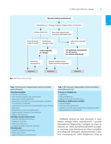 1.2 Bóle zamostkowe, zgaga 3 Wywiad, badanie podmiotowe endoskopia, ew. z biopsją, badanie rentgenowskie z kontrastem zmiany organiczne błony śluzowej/ wnętrze światła bez zmian organicznych przyczyna zidentyfikowana śródścienna zewnątrz ściany endosonografia, ew. z biopsją nowotwór wg przyczyny diagnoza zaburzenia motoryki (m.in.) (24-godzinna) manometria, ew. pH-metria, ew. pomiar impedancji badanie rentgenowskie (klatka piersiowa, kręgosłup) diagnoza diagnoza Ryc. 1-1 Diagnostyka dysfagii. Tab. 1-2 Przyczyny i diagnostyka różnicowa bólów zamostkowych Tab. 1-2 Przyczyny i diagnostyka różnicowa bólów zamostkowych (cd.) Choroby przełyku • choroba refluksowa • inne choroby zapalne (np. pleśniawki) • oparzenia, wrzody polekowe • zaburzenia motoryki (np. skurcze przełyku, zwiększenie ciśnienia w przełyku) • uszkodzenia mechaniczne (zespół Mallory‘ego-Weissa, pęknięcie) • przepuklina rozworu przełykowego • zajęcie gardła zmianami chorobowymi • zgaga czynnościowa Choroby naczyń wieńcowych • choroba niedokrwienna serca • zapalenie osierdzia • rozwarstwienie aorty • wypadanie płatka zastawki mitralnej Choroby płuc • zapalenia (zapalenie opłucnej) • odma opłucnowa • zajęcie zmianami chorobowymi Procesy w śródpiersiu • zapalenia • odma śródpiersia • zajęcie zmianami chorobowymi Choroby w nadbrzuszu (rzadko) • wrzód żołądka • choroby dróg żółciowych • zapalenie trzustki (przy podejrzeniu zlokalizowanych pseudotorbieli trzustkowych) Dokładny wywiad ma duże znaczenie w wyjaśnieniu etiologii bólów zamostkowych i pozwala ukierunkować diagnostykę i następne jej etapy na właściwy tor. Obok charakterystyki bólów szczególne znaczenie mają informacje na temat czynników wyzwalających, kierunków promieniowania i objawów towarzyszących. Takie dolegliwości, które są 1