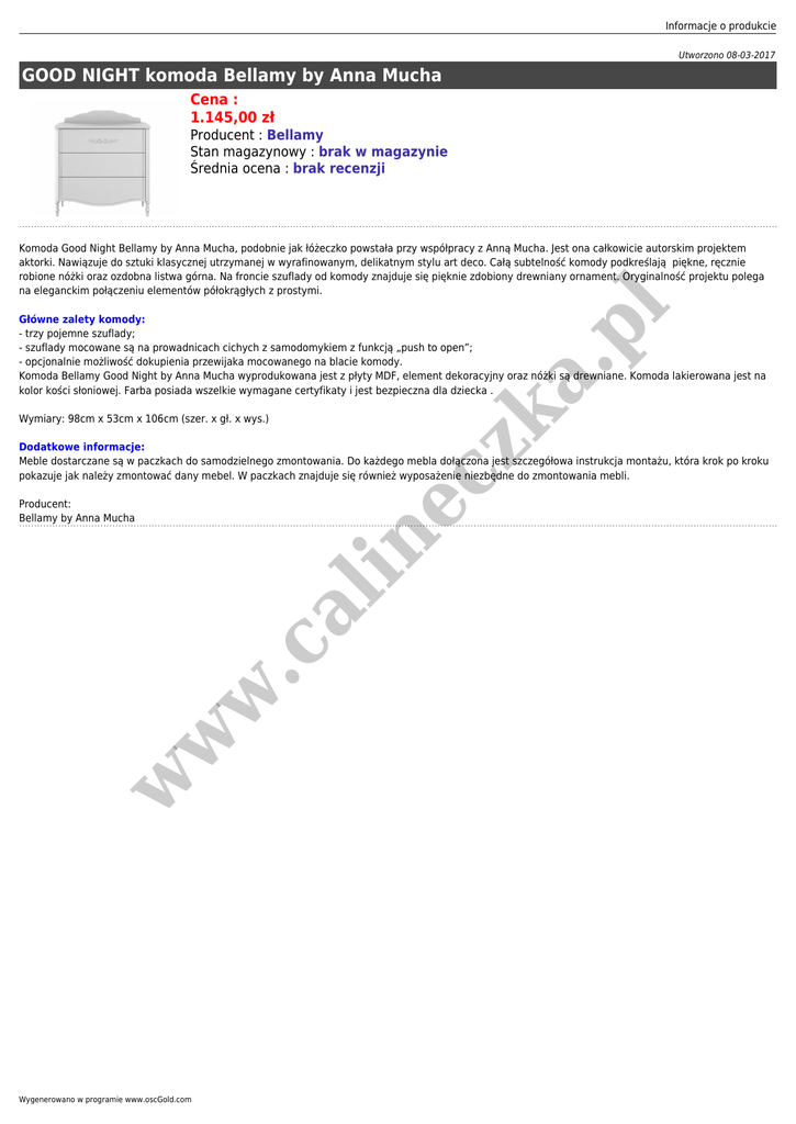 Informacje o produkcie Utworzono 08-03-2017 GOOD NIGHT komoda Bellamy by Anna Mucha Cena : 1.145,00 zł Producent : Bellamy Stan magazynowy : brak w magazynie Średnia ocena : brak recenzji pl Komoda Good Night Bellamy by Anna Mucha, podobnie jak łóżeczko powstała przy współpracy z Anną Mucha. Jest ona całkowicie autorskim projektem aktorki. Nawiązuje do sztuki klasycznej utrzymanej w wyrafinowanym, delikatnym stylu art deco. Całą subtelność komody podkreślają piękne, ręcznie robione nóżki oraz ozdobna listwa górna. Na froncie szuflady od komody znajduje się pięknie zdobiony drewniany ornament. Oryginalność projektu polega na eleganckim połączeniu elementów półokrągłych z prostymi. zk a. Główne zalety komody: - trzy pojemne szuflady; - szuflady mocowane są na prowadnicach cichych z samodomykiem z funkcją „push to open”; - opcjonalnie możliwość dokupienia przewijaka mocowanego na blacie komody. Komoda Bellamy Good Night by Anna Mucha wyprodukowana jest z płyty MDF, element dekoracyjny oraz nóżki są drewniane. Komoda lakierowana jest na kolor kości słoniowej. Farba posiada wszelkie wymagane certyfikaty i jest bezpieczna dla dziecka . Wymiary: 98cm x 53cm x 106cm (szer. x gł. x wys.) ec Dodatkowe informacje: Meble dostarczane są w paczkach do samodzielnego zmontowania. Do każdego mebla dołączona jest szczegółowa instrukcja montażu, która krok po kroku pokazuje jak należy zmontować dany mebel. W paczkach znajduje się również wyposażenie niezbędne do zmontowania mebli. w w w .c al in Producent: Bellamy by Anna Mucha Wygenerowano w programie www.oscGold.com