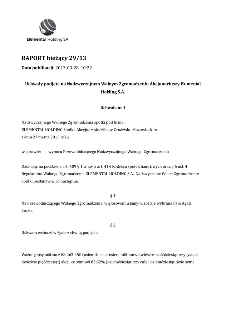 RAPORT bieżący 29/13 Data publikacji: 2013-03-28, 10:22 Uchwały podjęte na Nadzwyczajnym Walnym Zgromadzeniu Akcjonariuszy Elemental Holding S.A. Uchwała nr 1 Nadzwyczajnego Walnego Zgromadzenia spółki pod firmą: ELEMENTAL HOLDING Spółka Akcyjna z siedzibą w Grodzisku Mazowieckim z dnia 27 marca 2013 roku w sprawie: wyboru Przewodniczącego Nadzwyczajnego Walnego Zgromadzenia Działając na podstawie art. 409 § 1 w zw. z art. 414 Kodeksu spółek handlowych oraz § 6 ust. 4 Regulaminu Walnego Zgromadzenia ELEMENTAL HOLDING S.A., Nadzwyczajne Walne Zgromadzenie Spółki postanawia, co następuje: §1 Na Przewodniczącego Walnego Zgromadzenia, w głosowaniu tajnym, zostaje wybrana Pani Agata Jarska. §2 Uchwała wchodzi w życie z chwilą podjęcia. Ważne głosy oddano z 88 263 250 (osiemdziesiąt osiem milionów dwieście sześćdziesiąt trzy tysiące dwieście pięćdziesiąt) akcji, co stanowi 83,82% (osiemdziesiąt trzy całe i osiemdziesiąt dwie setne procenta) kapitału zakładowego Spółki, przy łącznej liczbie ważnych głosów 88 263 250 (osiemdziesiąt osiem milionów dwieście sześćdziesiąt trzy tysiące dwieście pięćdziesiąt). Uchwała została podjęta większością: 88 263 250 (osiemdziesiąt osiem milionów dwieście sześćdziesiąt trzy tysiące dwieście pięćdziesiąt) głosów "ZA", przy 0 (zero) głosach "WSTRZYMUJĄCYCH SIĘ" i 0 (zero) głosach "PRZECIW". Uchwała nr 2 Nadzwyczajnego Walnego Zgromadzenia spółki pod firmą: ELEMENTAL HOLDING Spółka Akcyjna z siedzibą w Grodzisku Mazowieckim z dnia 27 marca 2013 roku w sprawie: wyboru Komisji Skrutacyjnej Działając na podstawie art. 414 Kodeksu spółek handlowych oraz § 15 Regulaminu Walnego Zgromadzenia ELEMENTAL HOLDING S.A., Nadzwyczajne Walne Zgromadzenie Spółki postanawia, co następuje: §1 Powołuje się Komisję Skrutacyjną w następującym składzie: Pan Daniel Burian oraz Pan Tomasz Malinowski. §2 Uchwała wchodzi w życie z chwilą podjęcia. Ważne głosy oddano z 88 263 250 (osiemdziesiąt osiem milionów dwieście sześćdziesiąt trzy tysiące dwieście pięćdziesiąt) akcji, co stanowi 83,82% (osiemdziesiąt trzy całe i osiemdziesiąt dwie setne procenta) kapitału zakładowego Spółki, przy łącznej liczbie ważnych głosów 88 263 250 (osiemdziesiąt osiem milionów dwieście sześćdziesiąt trzy tysiące dwieście pięćdziesiąt). Uchwała została podjęta większością: 88 263 250 (osiemdziesiąt osiem milionów dwieście sześćdziesiąt trzy tysiące dwieście pięćdziesiąt) głosów "ZA", przy 0 (zero) głosach "WSTRZYMUJĄCYCH SIĘ" i 0 (zero) głosach "PRZECIW". Uchwała nr 3 Nadzwyczajnego Walnego Zgromadzenia spółki pod firmą: ELEMENTAL HOLDING Spółka Akcyjna z siedzibą w Grodzisku Mazowieckim z dnia 27 marca 2013 roku w sprawie: przyjęcia porządku obrad Nadzwyczajnego Walnego Zgromadzenia Działając na podstawie art. 414 Kodeksu spółek handlowych, Nadzwyczajne Walne Zgromadzenie Spółki postanawia, co następuje: §1 Nadzwyczajne Walne Zgromadzenie Spółki odbywające się w dniu 27 marca 2013 r. przyjmuje następujący porządek obrad: 1) Otwarcie Nadzwyczajnego Walnego Zgromadzenia. 2) Wybór Przewodniczącego Nadzwyczajnego Walnego Zgromadzenia. 3) Stwierdzenie prawidłowości zwołania Nadzwyczajnego Walnego Zgromadzenia i jego zdolności do podejmowania uchwał. 4) Wybór Komisji Skrutacyjnej. 5) Przyjęcie porządku obrad Nadzwyczajnego Walnego Zgromadzenia. 6) Podjęcie uchwały w sprawie podwyższenia kapitału zakładowego Spółki w drodze emisji akcji serii M z wyłączeniem prawa poboru dotychczasowych akcjonariuszy oraz zmiany Statutu Spółki. 7) Podjęcie uchwały w sprawie zmiany Statutu Spółki. 8) Podjęcie uchwały w sprawie ustalenia nowego tekstu jednolitego Statutu Spółki. 9) Podjęcie uchwały w sprawie uchwalenia nowego Regulaminu Walnego Zgromadzenia Spółki. 10) Podjęcie uchwały w sprawie zatwierdzenia i uchwalenia nowego Regulaminu Rady Nadzorczej Spółki. 11) Podjęcie uchwał w sprawie zmian w składzie Rady Nadzorczej Spółki. 12) Wolne głosy i wnioski. 13) Zamknięcie obrad Nadzwyczajnego Walnego Zgromadzenia. §2 Uchwała wchodzi w życie z chwilą podjęcia. Ważne głosy oddano z 88 263 250 (osiemdziesiąt osiem milionów dwieście sześćdziesiąt trzy tysiące dwieście pięćdziesiąt) akcji, co stanowi 83,82% (osiemdziesiąt trzy całe i osiemdziesiąt dwie setne procenta) kapitału zakładowego Spółki, przy łącznej liczbie ważnych głosów 88 263 250 (osiemdziesiąt osiem milionów dwieście sześćdziesiąt trzy tysiące dwieście pięćdziesiąt). Uchwała została podjęta większością: 88 263 250 (osiemdziesiąt osiem milionów dwieście sześćdziesiąt trzy tysiące dwieście pięćdziesiąt) głosów "ZA", przy 0 (zero) głosach "WSTRZYMUJĄCYCH SIĘ" i 0 (zero) głosach "PRZECIW". Uchwała nr 4 Nadzwyczajnego Walnego Zgromadzenia spółki pod firmą: ELEMENTAL HOLDING Spółka Akcyjna z siedzibą w Grodzisku Mazowieckim z dnia 27 marca 2013 roku w sprawie: zarządzenia przerwy w obradach §1 Nadzwyczajne Walne Zgromadzenie Spółki postanawia zarządzić przerwę w obradach do dnia 5 kwietnia 2013r. do godz. 10.00. Obrady zostaną wznowione w tym samym miejscu. §2 Uchwała wchodzi w życie z chwilą podjęcia. Ważne głosy oddano z 88 263 250 (osiemdziesiąt osiem milionów dwieście sześćdziesiąt trzy tysiące dwieście pięćdziesiąt) akcji, co stanowi 83,82% (osiemdziesiąt trzy całe i osiemdziesiąt dwie setne procenta) kapitału zakładowego Spółki, przy łącznej liczbie ważnych głosów 88 263 250 (osiemdziesiąt osiem milionów dwieście sześćdziesiąt trzy tysiące dwieście pięćdziesiąt). Uchwała została podjęta większością: 88 263 250 (osiemdziesiąt osiem milionów dwieście sześćdziesiąt trzy tysiące dwieście pięćdziesiąt) głosów "ZA", przy 0 (zero) głosach "WSTRZYMUJĄCYCH SIĘ" i 0 (zero) głosach "PRZECIW". Podstawa praw