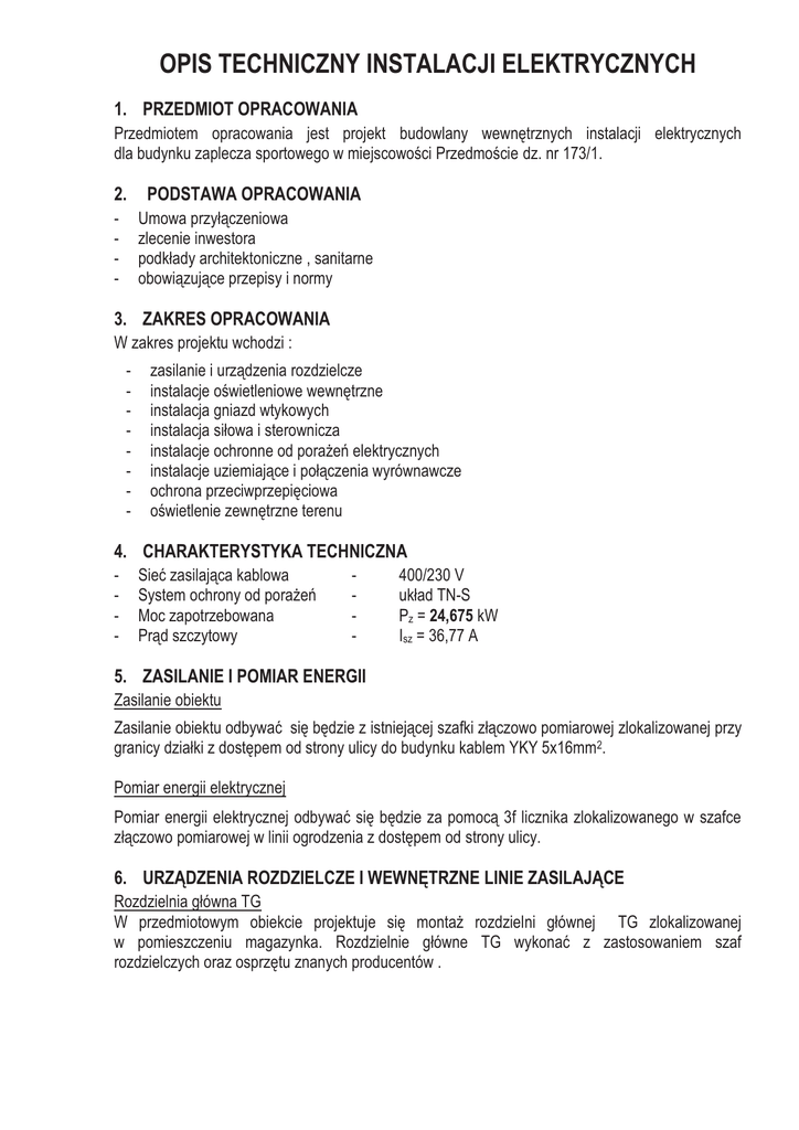 OPIS TECHNICZNY INSTALACJI ELEKTRYCZNYCH 1. PRZEDMIOT OPRACOWANIA Przedmiotem opracowania jest projekt budowlany wewnętrznych instalacji elektrycznych dla budynku zaplecza sportowego w miejscowości Przedmoście dz. nr 173/1. 2. PODSTAWA OPRACOWANIA - Umowa przyłączeniowa zlecenie inwestora podkłady architektoniczne , sanitarne obowiązujące przepisy i normy 3. ZAKRES OPRACOWANIA W zakres projektu wchodzi : - zasilanie i urządzenia rozdzielcze instalacje oświetleniowe wewnętrzne instalacja gniazd wtykowych instalacja siłowa i sterownicza instalacje ochronne od porażeń elektrycznych instalacje uziemiające i połączenia wyrównawcze ochrona przeciwprzepięciowa oświetlenie zewnętrzne terenu 4. CHARAKTERYSTYKA TECHNICZNA - Sieć zasilająca kablowa System ochrony od porażeń Moc zapotrzebowana Prąd szczytowy - 400/230 V układ TN-S Pz = 24,675 kW Isz = 36,77 A 5. ZASILANIE I POMIAR ENERGII Zasilanie obiektu Zasilanie obiektu odbywać się będzie z istniejącej szafki złączowo pomiarowej zlokalizowanej przy granicy działki z dostępem od strony ulicy do budynku kablem YKY 5x16mm2. Pomiar energii elektrycznej Pomiar energii elektrycznej odbywać się będzie za pomocą 3f licznika zlokalizowanego w szafce złączowo pomiarowej w linii ogrodzenia z dostępem od strony ulicy. 6. URZĄDZENIA ROZDZIELCZE I WEWNĘTRZNE LINIE ZASILAJĄCE Rozdzielnia główna TG W przedmiotowym obiekcie projektuje się montaż rozdzielni głównej TG zlokalizowanej w pomieszczeniu magazynka. Rozdzielnie główne TG wykonać z zastosowaniem szaf rozdzielczych oraz osprzętu znanych producentów . 7. INSTALACJE OŚWIETLENIOWE – WEWNĘTRZNE Na obiekcie projektuje się niżej wymienione oświetlenie : - oświetlenie podstawowe - oświetlenie awaryjne włączające się przy braku zasilania - oświetlenie ewakuacyjne włączające się przy braku zasilania Natężenie oświetlenia na obiekcie dobrano na podstawie normy PN-EN 12464-1 - pomieszczenia biurowe z kop. – 500 lx - pomieszczenia socjalne, szatnie– 200 lx - pomieszczenia magazynowe – 150 lx - komunikacja, – 100 lx - węzły sanitarne – 200 lx - oświetlenie awaryjne – 10 % oświetlenia podstawowego - oświetlenie ewakuacyjne – 0,5 lx w czasie 3 godzin Oświetlenie podstawowe - - w pomieszczeniach biurowych, socjalnych projektuje się oprawy rastrowe 4x18W ze świetlówkami LED, natomiast w pomieszczeniach sanitarnych projektuje się oprawy żarowe z świetlówkami LED, nad wejściami do budynków projektuje się oprawy typu kinkiet LED. zastosowane typy opraw pokazano na rzutach instalacji w obiekcie montować osprzęt instalacyjny produkcji znanych producentów. w pomieszczeniach technologicznych, technicznych i sanitariatach zastosować osprzęt hermetyczny min. IP44. Sterowanie oświetlenia podstawowego w budynku realizowane będzie następująco : - załączanie i wyłączanie oświetlenia odbywać się będzie ręcznie za pomocą włączników instalacyjnych. Oświetlenie ewakuacyjne i awaryjne - - montaż w wybranych oprawach oświetlenia podstawowego modułu awaryjnego wyposażonego w akumulator bezobsługowy włączający się z chwilą przerwy w dopływie prądu ( czas pracy akumulatora przewidziany jest na 3h świecenia ) – oprawy te należy zamówić jako „ sieciowe z modułem awaryjnym”. Wszystkie oprawy sieciowe z modułem awaryjnym należy oznakować poprzez naklejenie żółtego paska na drodze ewakuacji zamontować oprawę z modułem awaryjnym przewidzianym do pracy tylko przy zaniku napięcia ( czas świecenia 3h ) – na oprawie umieścić napis „Exit” w liniach świetlnych z oprawą awaryjną układać przewód 4-żyłowy kontroli sprawności działania oświetlenia awaryjnego i ewakuacyjnego należy dokonywać przynajmniej raz w miesiącu W rurkach instalacyjnych oraz na korytkach układać przewody okrągłe, natomiast w tynku przewody płaskie. W obiekcie montować osprzęt instalacyjny produkcji znanych producentów. W pomieszczeniach technologicznych, technicznych i sanitariatach zastosować osprzęt hermetyczny min. IP44. 8. OŚWIETLENIE TERENU 8.1. Linia kablowa. Linie oświetlenia wykonać zgodnie z wymogami normy PN – 76/E-05125 i N SEP-E-004. Ø o terminie rozpoczęcia robót powiadomić właścicieli terenów przez które przebiega trasa linii kablowej oraz użytkowników sieci i urządzeń znajdujących się w zasięgu prowadzonych prac, Ø linie kablowe układać w terenie ukształtowanym docelowo, Ø kable układać w ziemi na głębokości 70 cm stosując dla podsypki i nadsypki warstwę piasku grubości 10 cm, Ø kable układać w wykopach linią falistą z 3 % zapasem wystarczającym do skompensowania ewentualnych przesunięć gruntu, Ø przy wejściu do projektowanych słupów oświetlenia drogowego na kabel założyć oznaczniki kablowe , na oznacznikach powinien być wpisany typ i przekrój kabla , relacja linii oraz rok ułożenia, przy projektowanych słupach pozostawić odpowiedni zapas kabla, Ø projektowane odcinki linii kablowej należy zabezpieczyć głowiczkami termokurczliwymi typu np. AK 4 16-35, Ø przed przystąpieniem do robót , projektowane trasy linii kablowych oraz kolizje z istniejącym uzbrojeniem należy wytyczyć geodezyjnie, Ø przy wszelkich skrzyżowaniach z zbliżeniach projektowanej lini kablowej oświetlenia z innymi urządzeniami infrastruktury podziemnej projektowaną linię kablową należy chronić rurą osłonową DVK 50. 8.2. Słupy i oprawy oświetleniowe. Projektuje się oprawy oświetleniowe ze źródłem światła LED o mocy 35W. Projektuje się na słupkach piłko chwytów naświetlacze LED o mocy 50W. Jako zabezpieczenie przeciążeniowe zastosować wkładki bezpiecznikowe 2A montowane w gniazdach bezpiecznikowych tabliczek bezpiecznikowych. Do podłączenia opraw zastosować przewód YDY 3x2,5mm2 750V . Projektuje się słupy oświetlenia zewnętrznego o wysokości H=3,0m na fundamencie prefabrykowanym . Oprawy dla oświetlenia mocować 