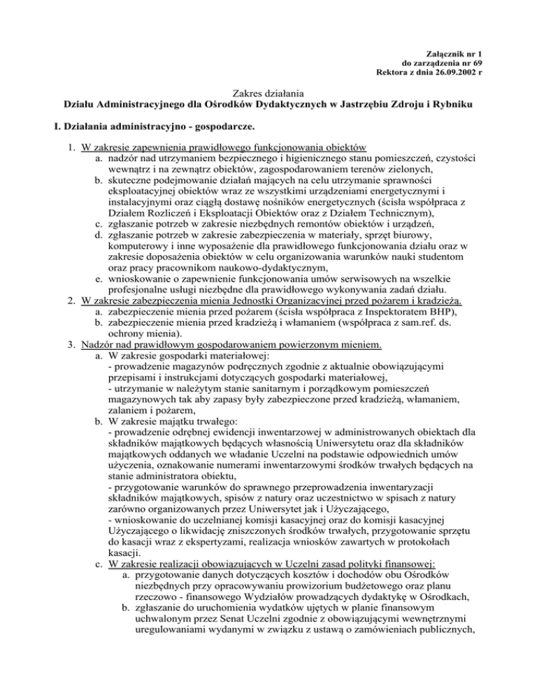 Załącznik nr 1 do zarządzenia nr 69 Rektora z dnia 26.09.2002 r Zakres działania Działu Administracyjnego dla Ośrodków Dydaktycznych w Jastrzębiu Zdroju i Rybniku I. Działania administracyjno - gospodarcze. 1. W zakresie zapewnienia prawidłowego funkcjonowania obiektów a. nadzór nad utrzymaniem bezpiecznego i higienicznego stanu pomieszczeń, czystości wewnątrz i na zewnątrz obiektów, zagospodarowaniem terenów zielonych, b. skuteczne podejmowanie działań mających na celu utrzymanie sprawności eksploatacyjnej obiektów wraz ze wszystkimi urządzeniami energetycznymi i instalacyjnymi oraz ciągłą dostawę nośników energetycznych (ścisła współpraca z Działem Rozliczeń i Eksploatacji Obiektów oraz z Działem Technicznym), c. zgłaszanie potrzeb w zakresie niezbędnych remontów obiektów i urządzeń, d. zgłaszanie potrzeb w zakresie zabezpieczenia w materiały, sprzęt biurowy, komputerowy i inne wyposażenie dla prawidłowego funkcjonowania działu oraz w zakresie doposażenia obiektów w celu organizowania warunków nauki studentom oraz pracy pracownikom naukowo-dydaktycznym, e. wnioskowanie o zapewnienie funkcjonowania umów serwisowych na wszelkie profesjonalne usługi niezbędne dla prawidłowego wykonywania zadań działu. 2. W zakresie zabezpieczenia mienia Jednostki Organizacyjnej przed pożarem i kradzieżą. a. zabezpieczenie mienia przed pożarem (ścisła współpraca z Inspektoratem BHP), b. zabezpieczenie mienia przed kradzieżą i włamaniem (współpraca z sam.ref. ds. ochrony mienia). 3. Nadzór nad prawidłowym gospodarowaniem powierzonym mieniem. a. W zakresie gospodarki materiałowej: - prowadzenie magazynów podręcznych zgodnie z aktualnie obowiązującymi przepisami i instrukcjami dotyczących gospodarki materiałowej, - utrzymanie w należytym stanie sanitarnym i porządkowym pomieszczeń magazynowych tak aby zapasy były zabezpieczone przed kradzieżą, włamaniem, zalaniem i pożarem, b. W zakresie majątku trwałego: - prowadzenie odrębnej ewidencji inwentarzowej w administrowanych obiektach dla składników majątkowych będących własnością Uniwersytetu oraz dla składników majątkowych oddanych we władanie Uczelni na podstawie odpowiednich umów użyczenia, oznakowanie numerami inwentarzowymi środków trwałych będących na stanie administratora obiektu, - przygotowanie warunków do sprawnego przeprowadzenia inwentaryzacji składników majątkowych, spisów z natury oraz uczestnictwo w spisach z natury zarówno organizowanych przez Uniwersytet jak i Użyczającego, - wnioskowanie do uczelnianej komisji kasacyjnej oraz do komisji kasacyjnej Użyczającego o likwidację zniszczonych środków trwałych, przygotowanie sprzętu do kasacji wraz z ekspertyzami, realizacja wniosków zawartych w protokołach kasacji. c. W zakresie realizacji obowiązujących w Uczelni zasad polityki finansowej: a. przygotowanie danych dotyczących kosztów i dochodów obu Ośrodków niezbędnych przy opracowywaniu prowizorium budżetowego oraz planu rzeczowo - finansowego Wydziałów prowadzących dydaktykę w Ośrodkach, b. zgłaszanie do uruchomienia wydatków ujętych w planie finansowym uchwalonym przez Senat Uczelni zgodnie z obowiązującymi wewnętrznymi uregulowaniami wydanymi w związku z ustawą o zamówieniach publicznych, c. kontrola wszystkich wydatków związanych z kosztami funkcjonowania obiektów - ścisłe przestrzeganie obowiązujących procedur kontroli funkcjonalnej pionowej, d. kontrola realizacji przychodów Ośrodków pochodzących z wynajmu pomieszczeń i wyposażenia z uwzględnieniem stosownych zapisów zawartych w umowach użyczenia z Gminami, e. kontrola rzetelności prowadzenia ewidencji wydatków i dochodów. d. W zakresie prowadzenia pokoi gościnnych w Ośrodku Działalności Dydaktycznej w Jastrzębiu Zdroju: a. prowadzenie administracji pokoi gościnnych oraz rozliczeń za korzystanie z tych pokoi wg obowiązujących zasad, b. zapewnianie odpowiednich warunków sanitarnych oraz stwarzanie optymalnych warunków życia i odpoczynku mieszkańców. e. Prowadzenie sprawozdawczości z zakresu pracy Działu. II. Administracyjna obsługa toku studiów oraz spraw bytowych studentów współpraca z dziekanatami Wydziałów, Działem Nauczania, Działem Spraw Studenckich. 1. Prowadzenie spraw administracyjnych studentów: a. zapewnianie drożności kanałów przepływu informacji między studentami a dziekanatami poszczególnych Wydziałów, b. przygotowanie indeksów, legitymacji studenckich i dokumentacji dla celów wojskowych, c. przygotowanie protokołów egzaminacyjnych i zaliczeniowych oraz indywidualnych kart egzaminacyjnych, d. pobieranie, ewidencjonowanie, wydawanie i rozliczanie druków ścisłego zarachowania, e. współpraca z Działem Współpracy z Zagranicą, Działem Spraw Studenckich i Kwesturą w sprawach dotyczących studentów cudzoziemców, f. prowadzenie ewidencji i wydawanie zaświadczeń do kredytów studenckich, zgodnie z obowiązującymi przepisami, g. zgłaszanie, na wniosek studenta spełniającego warunki, do ubezpieczenia zdrowotnego, h. wystawianie zaświadczeń dla studentów na ich pisemny, uzasadniony wniosek. 2. Uczestnictwo w przygotowaniu obsady zajęć (harmonogram wykorzystania sal dydaktycznych, umowy o wynajem sal itp.); optymalizacja wykorzystania infrastruktury dydaktycznej. 3. Ewidencjonowanie spraw związanych z tokiem studiów wg programu komputerowego "Dziekanat", 4. Przygotowanie dokumentów do obrony prac dyplomowych i wypisywanie dyplomów, 5. Prowadzenie wykazu prac dyplomowych obronionych w Ośrodkach Dydaktycznych. 6. Przekazywanie do archiwum teczek absolwentów zgodnie z obowiązującymi przepisami. 7. Administracyjna obsługa spraw związanych z pomocą materialną dla studentów oraz ewidencjonowanie spraw związanych z udzielaniem pomocy materialnej dla studentów w programie "Dziekanat". 8. Prowadzenie kroniki Ośrodków. III. Administracja i zarządzanie lokalnym
