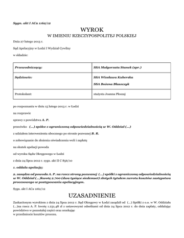 Sygn. akt I ACa 1162/12 WYROK W IMIENIU RZECZYPOSPOLITEJ POLSKIEJ Dnia 27 lutego 2013 r. Sąd Apelacyjny w Łodzi I Wydział Cywilny w składzie: Przewodniczący: SSA Małgorzata Stanek (spr.) Sędziowie: SSA Wiesława Kuberska SSA Bożena Błaszczyk Protokolant: stażysta Joanna Płoszaj po rozpoznaniu w dniu 15 lutego 2013 r. w Łodzi na rozprawie sprawy z powództwa A. P. przeciwko (...) spółce z ograniczoną odpowiedzialnością w W. Oddział (...) z udziałem interwenienta ubocznego po stronie pozwanej B. R. o zobowiązanie do złożenia oświadczenia woli i zapłatę na skutek apelacji powoda od wyroku Sądu Okręgowego w Łodzi z dnia 24 lipca 2012 r. sygn. akt II C 856/10 1. oddala apelację; 2. zasądza od powoda A. P. na rzecz strony pozwanej (...) spółki z ograniczoną odpowiedzialnością w W. Oddział (...)kwotę 2.700 (dwa tysiące siedemset) złotych tytułem zwrotu kosztów zastępstwa procesowego w postępowaniu apelacyjnym. Sygn. akt I ACa 1162/12 UZASADNIENIE Zaskarżonym wyrokiem z dnia 24 lipca 2012 r. Sąd Okręgowy w Łodzi zasądził od (...) Spółki z o.o. w W. Oddziału (...)na rzecz A. P. kwotę 1.231,48 zł z ustawowymi odsetkami od dnia 24 lipca 2012 r. do dnia zapłaty, oddalając powództwo w pozostałej części oraz orzekając w przedmiocie kosztów procesu. Powyższe rozstrzygnięcie zapadło na podstawie następujących ustaleń: W dniu 9 września 1983 r. Państwowe Biuro Notarialne po rozpoznaniu na posiedzeniu niejawnym wniosku A. D. (1) o założenie księgi wieczystej dla nieruchomości położonej w Ł. przy ul. (...), posiadającej urządzony zbiór dokumentów(...), postanowiło założyć dla przedmiotowej nieruchomości księgę wieczystą nr (...). Aktem notarialnym z dnia 23 września 1983 r. A. D. (1), A. D. (2) i S. D. sprzedali W. P. i J. P. - małżeństwu, w 2/3 częściach, i A. P. w 1/3 części - jako współwłaścicielom - niezabudowaną nieruchomość położoną w Ł. przy ulicy (...) oznaczoną jako działki nr (...) o powierzchni ogólnej 44 ary \ 4 metry kwadratowe pod warunkiem niewykonania przez Skarb Państwa prawa pierwokupu przysługującego Skarbowi Państwa na podstawie art. 29 i następnych ustawy z dnia 14 lipca 1961 r. o gospodarce terenami w miastach i osiedlach. Aktem notarialnym z dnia 22 grudnia 1983 r. Skarb Państwa złożył oświadczenie o wykonaniu prawa pierwokupu w stosunku do przedmiotowej nieruchomości. W dniu 22 grudnia 1983 r. Państwowe Biuro Notarialne zawiadomiło, że w dziale II księgi wieczystej w miejsce A. D. (1), A. D. (2) i S. D. wpisano Skarb Państwa. W dniu 30 stycznia 1984 r. Naczelnik Dzielnicy Ł. skierował do Państwowego Biura Notarialnego w Ł. oświadczenie, że odstępuje od wykonania prawa pierwokupu w odniesieniu do nieruchomości położonej w Ł. przy ul. (...), w stosunku do której skorzystał z prawa pierwokupu. Aktem notarialnym z dnia 1 marca 1984 r. doszło do rozwiązania umowy o wykonanie prawa pierwokupu oraz do przeniesienia własności na W. i J. małżonków P. w 2/3 częściach i na A. P. w 1/3 części własności przedmiotowej nieruchomości. W tym samym dniu Państwowe Biuro Notarialne zawiadomiło, że w dziale II księgi wieczystej w miejsce Skarbu Państwa wpisano jako współwłaścicieli małżonków J. i W. P. w 2/3 częściach i A. P. w 1/3 części. Do części przedmiotowej nieruchomości, oznaczonej jako działki nr (...) (poprzednio działki (...)) o powierzchni 3.724 m2 w dniu 23 sierpnia 1988 r., wszczęte zostało postępowanie wywłaszczeniowe. Aktem notarialnym z dnia 10 sierpnia 1993 r. W. P., J. P. i A. P. sprzedali działki (...) (oznaczone już wówczas jako (...)) o łącznej powierzchni 32 ary 74 metry kwadratowe Gminie Ł.. Prawomocnym postanowieniem z dnia 9 listopada 2005 r. Sąd Rejonowy dla Łodzi - Śródmieścia w Łodzi w sprawie o sygn. akt II Ns 1033/05 stwierdził, że spadek po J. P. zmarłej w dniu (...) nabył na podstawie ustawy jej mąż W. P. i jej syn A. P. po 1/2 części każdy z nich, a spadek po W. P. nabył na podstawie ustawy w całości A. P.. W dniu 5 czerwca 2006 r. A. P. złożył wniosek o wpis w księdze wieczystej siebie, jako jedynego właściciela przedmiotowej nieruchomości oraz wykreślenie ostrzeżenia o niezgodności ze stanem prawnym z uwagi na śmierć rodziców A. P.. W dniu 31 lipca 2006 r. wpis taki został dokonany. W dniu 4 grudnia 2003 r. B. R. – inwestor - rozpoczęła budowę inwestycji w postaci sieci gazowej z przyłączami gazu oraz wewnętrzną instalacją gazową w Ł. przy ul. (...) na podstawie pozwolenia na budowę z dnia 21 listopada 2003 r. Nr (...)wydanego przez Prezydenta Miasta Ł.. Projekt budowlany określał, jako przedmiot budowy, sieć gazową średniego ciśnienia przy ul. (...), odcinek (...) działka nr ew. (...). W uzasadnieniu decyzji Prezydenta Miasta Ł. z dnia 21 listopada 2003 r. Nr (...)o zatwierdzeniu projektu budowlanego i udzieleniu pozwolenia na wykonanie robót budowlanych, wskazano, że została ona wydana, po sprawdzeniu przedłożonej dokumentacji w trybie art. 35 Prawa budowlanego oraz stwierdzeniu, że inwestor złożył oświadczenie o prawie do dysponowania nieruchomością na cele budowlane. Proponowana lokalizacja gazociągu na działce nr (...) obręb(...)została pozytywnie zaopiniowana w dniu 17 listopada 2003 r. przez Urząd Miasta Ł. a w dniu 16 października 2003 r. przez Zarząd Dróg i (...). Z informacji uzyskanych przez projektanta G. B. z Urzędu Miasta Ł. wynikało, że działki nr (...) obręb (...)nie są przedmiotem umów dzierżaw na dzień 3 października 2003 r. W wypisie z ewidencji gruntów na dzień 23 maja 2003 r., jako właściciel figurował Skarb Państwa, a jako władający Urząd Miasta Ł. - dotyczącym działki nr (...) przy ul. (...). W dniu 2 marca 2004 r. pomiędzy (...) Spółką (...) a B. R. zawarta została umowa kupna - sprzedaży nr (...), na podstawie której strona pozwana zakupiła od inwestora, przy