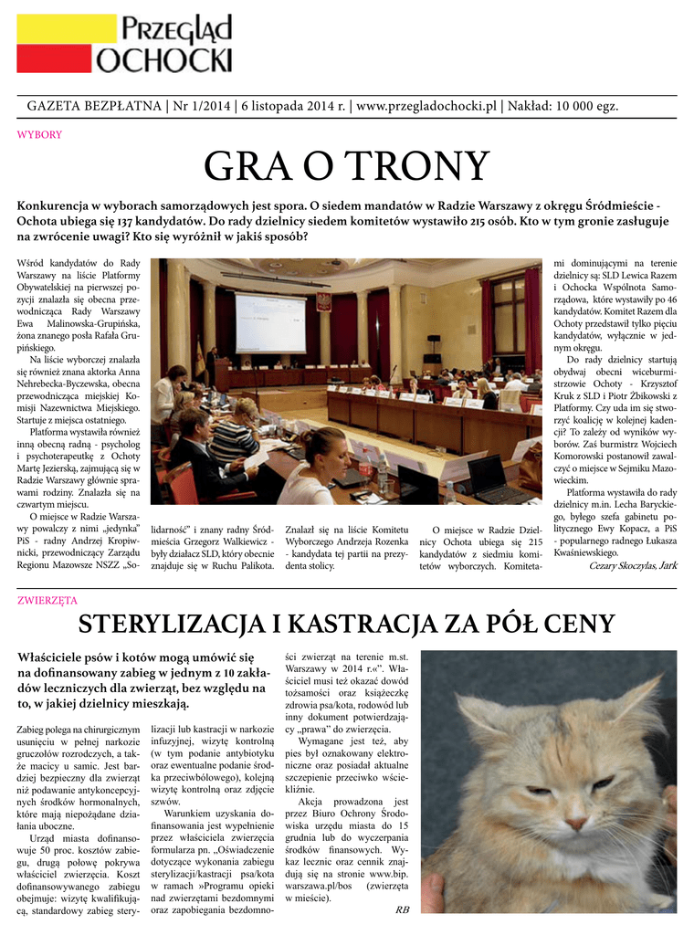 GAZETA BEZPŁATNA | Nr 1/2014 | 6 listopada 2014 r. | www.przegladochocki.pl | Nakład: 10 000 egz. WYBORY GRA O TRONY Konkurencja w wyborach samorządowych jest spora. O siedem mandatów w Radzie Warszawy z okręgu Śródmieście Ochota ubiega się 137 kandydatów. Do rady dzielnicy siedem komitetów wystawiło 215 osób. Kto w tym gronie zasługuje na zwrócenie uwagi? Kto się wyróżnił w jakiś sposób? Wśród kandydatów do Rady Warszawy na liście Platformy Obywatelskiej na pierwszej pozycji znalazła się obecna przewodnicząca Rady Warszawy Ewa Malinowska-Grupińska, żona znanego posła Rafała Grupińskiego. Na liście wyborczej znalazła się również znana aktorka Anna Nehrebecka-Byczewska, obecna przewodnicząca miejskiej Komisji Nazewnictwa Miejskiego. Startuje z miejsca ostatniego. Platforma wystawiła również inną obecną radną - psycholog i psychoterapeutkę z Ochoty Martę Jezierską, zajmującą się w Radzie Warszawy głównie sprawami rodziny. Znalazła się na czwartym miejscu. O miejsce w Radzie Warszawy powalczy z nimi „jedynka” PiS - radny Andrzej Kropiwnicki, przewodniczący Zarządu Regionu Mazowsze NSZZ „So- ZWIERZĘTA lidarność” i znany radny Śródmieścia Grzegorz Walkiewicz były działacz SLD, który obecnie znajduje się w Ruchu Palikota. Znalazł się na liście Komitetu Wyborczego Andrzeja Rozenka - kandydata tej partii na prezydenta stolicy. O miejsce w Radzie Dzielnicy Ochota ubiega się 215 kandydatów z siedmiu komitetów wyborczych. Komiteta- mi dominującymi na terenie dzielnicy są: SLD Lewica Razem i Ochocka Wspólnota Samorządowa, które wystawiły po 46 kandydatów. Komitet Razem dla Ochoty przedstawił tylko pięciu kandydatów, wyłącznie w jednym okręgu. Do rady dzielnicy startują obydwaj obecni wiceburmistrzowie Ochoty - Krzysztof Kruk z SLD i Piotr Żbikowski z Platformy. Czy uda im się stworzyć koalicję w kolejnej kadencji? To zależy od wyników wyborów. Zaś burmistrz Wojciech Komorowski postanowił zawalczyć o miejsce w Sejmiku Mazowieckim. Platforma wystawiła do rady dzielnicy m.in. Lecha Baryckiego, byłego szefa gabinetu politycznego Ewy Kopacz, a PiS - popularnego radnego Łukasza Kwaśniewskiego. Cezary Skoczylas, Jark STERYLIZACJA I KASTRACJA ZA PÓŁ CENY Właściciele psów i kotów mogą umówić się na dofinansowany zabieg w jednym z 10 zakładów leczniczych dla zwierząt, bez względu na to, w jakiej dzielnicy mieszkają. Zabieg polega na chirurgicznym usunięciu w pełnej narkozie gruczołów rozrodczych, a także macicy u samic. Jest bardziej bezpieczny dla zwierząt niż podawanie antykoncepcyjnych środków hormonalnych, które mają niepożądane działania uboczne. Urząd miasta dofinansowuje 50 proc. kosztów zabiegu, drugą połowę pokrywa właściciel zwierzęcia. Koszt dofinansowywanego zabiegu obejmuje: wizytę kwalifikującą, standardowy zabieg stery- lizacji lub kastracji w narkozie infuzyjnej, wizytę kontrolną (w tym podanie antybiotyku oraz ewentualne podanie środka przeciwbólowego), kolejną wizytę kontrolną oraz zdjęcie szwów. Warunkiem uzyskania dofinansowania jest wypełnienie przez właściciela zwierzęcia formularza pn. „Oświadczenie dotyczące wykonania zabiegu sterylizacji/kastracji psa/kota w ramach »Programu opieki nad zwierzętami bezdomnymi oraz zapobiegania bezdomno- ści zwierząt na terenie m.st. Warszawy w 2014 r.«”. Właściciel musi też okazać dowód tożsamości oraz książeczkę zdrowia psa/kota, rodowód lub inny dokument potwierdzający „prawa” do zwierzęcia. Wymagane jest też, aby pies był oznakowany elektroniczne oraz posiadał aktualne szczepienie przeciwko wściekliźnie. Akcja prowadzona jest przez Biuro Ochrony Środowiska urzędu miasta do 15 grudnia lub do wyczerpania środków finansowych. Wykaz lecznic oraz cennik znajdują się na stronie www.bip. warszawa.pl/bos (zwierzęta w mieście). RB 2 Przegląd Ochocki nr 1, 6 listopada 2014 r. KANDYDACI PRZYWRÓCIĆ ZAUFANIE DO LUDZI Walkę z urzędniczymi absurdami i działania na rzecz większej aktywności mieszkańców Ochoty zapowiada kandydatka na radną Anna Nehrebecka-Byczewska, znana aktorka, a w obecnej kadencji samorządu przewodnicząca Komisji Nazewnictwa Miejskiego. – Z absurdami spotykamy się na co dzień – mówi radna Nehrebecka-Byczewska. – Są to choćby chodniki wytyczone w taki sposób, by pasowało to urzędnikom, a nie mieszkańcom. Na Powiślu mieliśmy taką sytuację, że wytyczono wielki pas zieleni, a ludzie nie mieli miejsca na przystanku autobusowym. Jako radna monitoruję takie sprawy i interweniuję, choć wiem, że jeszcze dużo jest do zrobienia. W kolejnej kadencji radna chce zająć się nie tylko sprawami typowymi dla samorządu. – Chcę, by Ochota zaczęła 9 listopada wszystkie stacje nowej linii metra otworzą się dla warszawiaków. Zanim pociągi rozpoczną normalne kursy zobaczyć będzie można wnętrza wszystkich stacji. Wstęp będzie wolny, nie są konieczne zapisy. Wszystkie stacje są gotowe, więc zobaczyć będzie można podziemne budowle takie, jakie pasażerowie będą widzieli podczas codziennych podróży podziemną koleją. tętnić życiem, by ludzie się poznawali, byli dla siebie życzliwi i bardziej tolerancyjni – tłumaczy. Największym wyzwaniem będzie przekonanie ludzi do współpracy i zaufania drugiej osobie. – Mamy tu bardzo dobrych sąsiadów – uśmiecha się. – Być może nie wszyscy wiedzą, że budżet partycypacyjny w Warszawie zaczął się od pobliskiego Śródmieścia. To w lokalnym domu kultury po raz pierwszy mieszkańcy sami zdecydowali, jakie kwoty przeznaczyć na konkretne projekty. Zrobili to tak dobrze, że wkrótce budżet partycypacyjny objął całą Warszawę. Anna Nehrebecka-Byczewska – jako przedstawicielka świata kultury – zamierza również zająć się ofertą kulturalną i rozrywkową w naszej dzielnicy. – Te sprawy są mi szczególnie bliskie – mówi. – Wiele