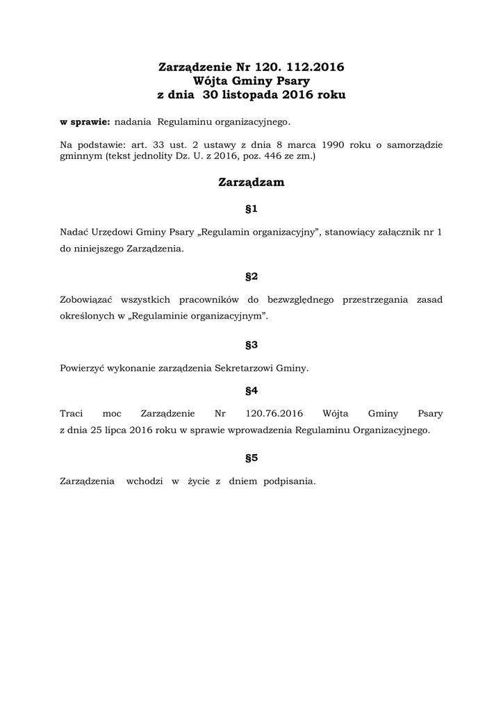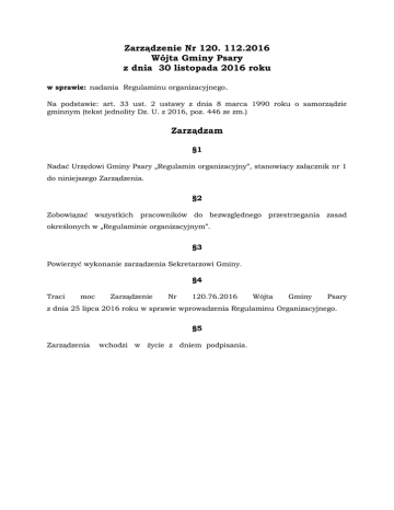 Zarządzenie Nr 120. 112.2016 Wójta Gminy Psary z dnia 30 listopada 2016 roku w sprawie: nadania Regulaminu organizacyjnego. Na podstawie: art. 33 ust. 2 ustawy z dnia 8 marca 1990 roku o samorządzie gminnym (tekst jednolity Dz. U. z 2016, poz. 446 ze zm.) Zarządzam §1 Nadać Urzędowi Gminy Psary „Regulamin organizacyjny”, stanowiący załącznik nr 1 do niniejszego Zarządzenia. §2 Zobowiązać wszystkich pracowników do bezwzględnego przestrzegania zasad określonych w „Regulaminie organizacyjnym”. §3 Powierzyć wykonanie zarządzenia Sekretarzowi Gminy. §4 Traci moc Zarządzenie Nr 120.76.2016 Wójta Gminy Psary z dnia 25 lipca 2016 roku w sprawie wprowadzenia Regulaminu Organizacyjnego. §5 Zarządzenia wchodzi w życie z dniem podpisania. Załącznik Nr 1 do Zarządzenia Nr 120 . 112.2016 Wójta Gminy Psary z dnia 30.11.2016 roku REGULAMIN ORGANIZACYJNY I. Postanowienia ogólne §1 Regulamin Organizacyjny Urzędu Gminy Psary, zwany dalej „Regulaminem”, określa organizację i zasady działania Urzędu Gminy Psary, zwanego dalej „Urzędem” oraz zakresy spraw załatwianych przez wewnętrzne komórki organizacyjne. §2 1. Siedzibą Urzędu jest sołectwo Psary. 2. Urząd mieści się w budynku, przy ul. Malinowickiej 4. 3. Sala ślubów Urzędu Stanu Cywilnego w budynku Gminnego przy Ośrodka Kultury Psarach mieści się w Gminy Psary w Gródkowie, ulicy Zwycięstwa 2. §3 1. Urząd działa na podstawie następujących aktów prawnych: a) Ustawy o samorządzie gminnym , b) Ustawy o zmianie niektórych ustaw określających kompetencje organów administracji publicznej – w związku z reformą ustrojową państwa , c) Ustawy Przepisy wprowadzające ustawy reformujące administrację publiczną d) Ustawy o pracownikach samorządowych , e) Ustawy – Kodeks postępowania administracyjnego , f) Rozporządzenia Prezesa Rady Ministrów w sprawie instrukcji kancelaryjnej , jednolitych rzeczowych wykazów akt oraz instrukcji w sprawie organizacji i zakresu działania archiwów zakładowych, g) Statutu Gminy Psary. h) Niniejszego regulaminu. i) Innych przepisów szczególnych. §4 1. Ilekroć w niniejszym regulaminie jest mowa o: a) Gminie – rozumie się przez to Gminę Psary; b) Urzędzie – rozumie się przez to Urząd Gminy Psary; c) Radzie – rozumie się przez to Radę Gminy Psary; d) Komisjach – rozumie się przez to Komisje Rady Gminy Psary; e) Wójcie – rozumie się przez to Wójta Gminy Psary; f) Zastępcy Wójta – rozumie się przez to Zastępcę Wójta Gminy Psary; g) Sekretarzu – rozumie się przez to Sekretarza Gminy Psary; h) Skarbniku – rozumie się przez to Skarbnika Gminy Psary; i) Kierowniku USC – rozumie się przez to Kierownika Urzędu Stanu Cywilnego w Psarach. §5 Urząd jest jednostką organizacyjną Gminy, przy pomocy której Wójt realizuje zadania własne określone ustawami, Statutem Gminy Psary, uchwałami Rady Gminy oraz zadania zlecone z zakresu administracji publicznej przekazane gminie z mocy przepisów powszechnie obowiązujących, a także na drodze porozumień z właściwymi organami administracji publicznej. §6 1. W Urzędzie obowiązuje instrukcja kancelaryjna i jednolity rzeczowy wykaz akt dla organów Gminy ustanowiona rozporządzeniem Prezesa Rady Ministrów z dnia 18 stycznia 2011 roku w sprawie instrukcji kancelaryjnej, jednolitych rzeczowych wykazów akt oraz instrukcji w sprawie organizacji i zakresu działania archiwów zakładowych. 2. Przy załatwianiu spraw stosuje się przepisy kodeksu postępowania administracyjnego, o ile przepisy szczególne nie stanowią inaczej. §7 Szczegółowy czas pracy Urzędu określa „Regulamin Pracy” Zarządzeniem Wójta. II. Kierownictwo Gminy §8 1. Kierownictwo Urzędu tworzą: a) Wójt, b) Zastępca Wójta, c) Sekretarz, d) Skarbnik. §9 Wójt 1. Do zadań Wójta, jako Kierownika Urzędu, w szczególności należy: a) organizowanie i kierowanie pracami Urzędu; wprowadzony b) reprezentowanie Urzędu na zewnątrz i kierowanie bieżącymi sprawami Gminy; c) kierowanie polityką kadrową i płacową Urzędu oraz nadzór nad prowadzeniem spraw wynikających ze stosunku pracy; d) wydawanie decyzji w sprawach indywidualnych z zakresu administracji publicznej; e) upoważnienie Zastępcy Wójta, Sekretarza, Skarbnika, Naczelnika Wydziału Inwestycji i Rozwoju, Kierownika Referatu Finansów i Podatków, Kierownika Referatu Przedsięwzięć Publicznych, Kierownika Urzędu Stanu Cywilnego oraz pracowników Urzędu do wydawania w swoim imieniu decyzji administracyjnych w sprawach indywidualnych z zakresu administracji publicznej; f) upoważnienie Zastępcy Wójta, Sekretarza, Skarbnika, Naczelnika Wydziału Inwestycji i Rozwoju, Kierownika Referatu Finansów i Podatków, Kierownika Referatu Przedsięwzięć Publicznych, Kierownika Referatu Inwestycji i Remontów, Kierownika Referatu Rozwoju i pozyskiwania środków zewnętrznych, Kierownika Urzędu Stanu Cywilnego oraz pracowników Urzędu do wykonywania w swoim imieniu innych czynności wynikających z przepisów prawa lub aktów wewnętrznych; g) przedkładanie organom nadzoru uchwał Rady Gminy; h) przedkładanie Radzie Gminy projektów uchwał; i) wydawanie wewnętrznych aktów normatywnych (zarządzeń, regulaminów, instrukcji, okólników itp.); j) wykonywanie uprawnień zwierzchnika służbowego w stosunku do pracowników Urzędu oraz kierowników i dyrektorów gminnych jednostek organizacyjnych, z wyłączeniem spraw przekazanych ustawami do kompetencji innych organów; k) zatwierdzanie zakresów czynności Zastępcy Wójta, Sekretarza, Skarbnika, Naczelnika Wydziału Inwestycji Podatków, Kierownika i Rozwoju, Kierownika Referatu Finansów i Referatu Przedsięwzięć Publicznych, Kierownika Urzędu Stanu Cywilnego oraz samodzielnych stanowisk będących pod bezpośrednim nadzorem Wójta; l) rozstrzyganie sporów kompetencyjnych między komórkami organizacyjnymi Urzędu; m) kierowanie Obroną Cywilną Gminy; n) składa