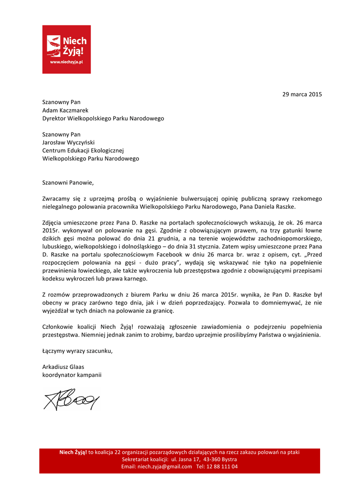 29 marca 2015 Szanowny Pan Adam Kaczmarek Dyrektor Wielkopolskiego Parku Narodowego Szanowny Pan Jarosław Wyczyński Centrum Edukacji Ekologicznej Wielkopolskiego Parku Narodowego Szanowni Panowie, Zwracamy się z uprzejmą prośbą o wyjaśnienie bulwersującej opinię publiczną sprawy rzekomego nielegalnego polowania pracownika Wielkopolskiego Parku Narodowego, Pana Daniela Raszke. Zdjęcia umieszczone przez Pana D. Raszke na portalach społecznościowych wskazują, że ok. 26 marca 2015r. wykonywał on polowanie na gęsi. Zgodnie z obowiązującym prawem, na trzy gatunki łowne dzikich gęsi można polować do dnia 21 grudnia, a na terenie województw zachodniopomorskiego, lubuskiego, wielkopolskiego i dolnośląskiego – do dnia 31 stycznia. Zatem wpisy umieszczone przez Pana D. Raszke na portalu społecznościowym Facebook w dniu 26 marca br. wraz z opisem, cyt. „Przed rozpoczęciem polowania na gęsi -‐ dużo pracy”, wydają się wskazywać nie tyko na popełnienie przewinienia łowieckiego, ale także wykroczenia lub przestępstwa zgodnie z obowiązującymi przepisami kodeksu wykroczeń lub prawa karnego. Z rozmów przeprowadzonych z biurem Parku w dniu 26 marca 2015r. wynika, że Pan D. Raszke był obecny w pracy zarówno tego dnia, jak i w dzień poprzedzający. Pozwala to domniemywać, że nie wyjeżdżał w tych dniach na polowanie za granicę. Członkowie koalicji Niech Żyją! rozważają zgłoszenie zawiadomienia o podejrzeniu popełnienia przestępstwa. Niemniej jednak zanim to zrobimy, bardzo uprzejmie prosilibyśmy Państwa o wyjaśnienia. Łączymy wyrazy szacunku, Arkadiusz Glaas koordynator kampanii Niech Żyją! to koalicja 22 organizacji pozarządowych działających na rzecz zakazu polowań na ptaki Sekretariat koalicji: ul. Jasna 17, 43-‐360 Bystra Email: [email protected] Tel: 12 88 111 04