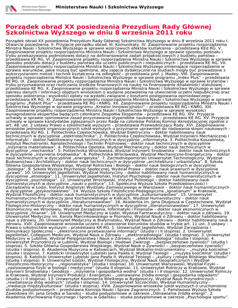 Ministerstwo Nauki i Szkolnictwa Wyższego Porządek obrad XX posiedzenia Prezydium Rady Głównej Szkolnictwa Wyższego w dniu 8 września 2011 roku Porządek obrad XX posiedzenia Prezydium Rady Głównej Szkolnictwa Wyższego w dniu 8 września 2011 roku I. Otwarcie posiedzenia. II. Przyjęcie porządku obrad. III. Komunikaty. IV. Zaopiniowanie projektu rozporządzenia Ministra Nauki i Szkolnictwa Wyższego w sprawie wzorcowych efektów kształcenia – przedstawia KEd RG. V. Zaopiniowanie projektu rozporządzenia Ministra Nauki i Szkolnictwa Wyższego w sprawie sposobu podziału i trybu przekazywania podmiotowej dotacji na dofinansowanie zadań projakościowych z budżetu państwa – przedstawia KE RG. VI. Zaopiniowanie projektu rozporządzenia Ministra Nauki i Szkolnictwa Wyższego w sprawie sposobu podziału dotacji z budżetu państwa dla uczelni publicznych i niepublicznych – przedstawia KE RG. VII. Zaopiniowanie projektu rozporządzenia Ministra Nauki i Szkolnictwa Wyższego zmieniające rozporządzenie w sprawie warunków, jakie muszą być spełnione, aby zajęcia dydaktyczne na studiach mogły być prowadzone z wykorzystaniem metod i technik kształcenia na odległość – przedstawia prof. J. Madey. VIII. Zaopiniowanie projektu rozporządzenia Ministra Nauki i Szkolnictwa Wyższego w sprawie programu „Index Plus” – przedstawia KE RG. IX. Zaopiniowanie projektu rozporządzenia Ministra Nauki i Szkolnictwa Wyższego w sprawie kryteriów i trybu przyznawania oraz rozliczania środków finansowych na naukę na finansowanie działalności statutowej – przedstawia KE RG. X. Zaopiniowanie projektu rozporządzenia Ministra Nauki i Szkolnictwa Wyższego w sprawie zakresu danych i informacji objętych wnioskiem o wydanie pozwolenia na utworzenie uczelni niepublicznej oraz sposobu pobierania i wysokości opłaty na wydatki związane z kosztami postępowania opiniodawczego – przedstawia KR RG. XI. Zaopiniowanie projektu rozporządzenia Ministra Nauki i Szkolnictwa Wyższego w sprawie programu „Patent Plus” – przedstawia KE RG i KNRG. XII. Zaopiniowanie projektu rozporządzenia Ministra Nauki i Szkolnictwa Wyższego w sprawie programu „Kreator Innowacyjności” – przedstawia KE RG i KNRG. XIII. Zaopiniowanie projektu rozporządzenia Ministra Nauki i Szkolnictwa Wyższego w sprawie wysokości wynagrodzenia ekspertów będących członkami Zespołów Ekspertów – przedstawia KE RG. XIV. Przyjęcie uchwały w sprawie opiniowania zasad przyznawania stypendiów naukowych – przedstawia KE RG. XV. Przyjęcie uchwały w sprawie kandydatów zgłaszanych przez Radę na członków Polskiej Komisji Akredytacyjnej zgodnie z art. 48. ust. 2 ustawy Prawo o szkolnictwie wyższym – przedstawia Przewodniczący Rady. XVI. Zaopiniowanie wniosków jednostek organizacyjnych szkół wyższych o przyznanie uprawnień do nadawania stopni naukowych – przedstawia KU RG. 1. Politechnika Częstochowska, Wydział Elektryczny – doktor habilitowany nauk technicznych w dyscyplinie „elektrotechnika”. 2. Politechnika Częstochowska, Wydział Inżynierii Mechanicznej i Informatyki – doktor habilitowany nauk technicznych w dyscyplinie „informatyka. 3. Politechnika Koszalińska, Instytut Mechatroniki, Nanotechnologii i Techniki Próżniowej – doktor nauk technicznych w dyscyplinie „inżynieria materiałowa”. 4. Politechnika Opolska, Wydział Mechaniczny – doktor nauk technicznych w dyscyplinie „mechanika”. 5. Politechnika Wrocławska, Wydział Inżynierii Środowiska – doktor nauk technicznych w dyscyplinie „inżynieria środowiska”. 6. Politechnika Wrocławska, Wydział Mechaniczno-Energetyczny – doktor nauk technicznych w dyscyplinie „energetyka”. 7. Zachodniopomorski Uniwersytet Technologiczny, Wydział Budownictwa i Architektury – doktor nauk technicznych w dyscyplinie „architektura i urbanistyka”. 8. Szkoła Główna Gospodarstwa Wiejskiego, Wydział Rolnictwa i Biologii – doktor nauk biologicznych w dyscyplinie „biologia”. 9. Szkoła Wyższa Psychologii Społecznej, Wydział Prawa – doktor nauk prawnych w dyscyplinie „prawo”. 10. Uniwersytet Jagielloński, Wydział Historyczny – doktor habilitowany nauk humanistycznych w dyscyplinie „etnologia”. 11. Uniwersytet Jagielloński, Instytut Psychologii – doktor nauk humanistycznych w dyscyplinie „psychologia”. 12. Uniwersytet Wrocławski, Instytut Politologii – doktor habilitowany nauk humanistycznych w dyscyplinie „nauki o polityce”. 13. Społeczna Wyższa Szkoła Przedsiębiorczości i Zarządzania w Łodzi, Instytut Anglistyki Wydziału Zamiejscowego w Warszawie – doktor nauk humanistycznych w dyscyplinie „językoznawstwo”. 14. Wyższa Szkoła Filozoficzno-Pedagogiczna „Ignatianum” w Krakowie, Wydział Filozoficzny – doktor nauk humanistycznych w dyscyplinie „kulturoznawstwo”. 15. Uniwersytet Humanistyczno-Przyrodniczy Jana Kochanowskiego w Kielcach, Wydział Humanistyczny – doktor nauk humanistycznych w dyscyplinie „literaturoznawstwo”. 16. Akademia im. Jana Długosza w Częstochowie, Wydział Filologiczno-Historyczny – doktor nauk humanistycznych w dyscyplinie „literaturoznawstwo”. 17. Uniwersytet Ekonomiczny we Wrocławiu, Wydział Zarządzania, Informatyki i Finansów – doktor nauk ekonomicznych w dyscyplinie „finanse”. 18. Uniwersytet Medyczny w Łodzi, Wydział Farmaceutyczny – doktor nauk o zdrowiu. 19. Uniwersytet Medyczny im. Karola Marcinkowskiego w Poznaniu, Wydział Nauk o Zdrowiu – doktor habilitowany nauk o zdrowiu. 20. Uniwersytet Medyczny w Białymstoku, Wydział Nauk o Zdrowiu – doktor habilitowany nauk o zdrowiu. XVII. Zaopiniowanie wniosków uczelni o utworzenie kierunków studiów w trybie art. 11 ust. 3 ustawy Prawo o szkolnictwie wyższym – przedstawia KR RG. 1. Uniwersytet Jagielloński, Wydział Zarządzania i Komunikacji Społecznej – „elektroniczne przetwarzanie informacji” (studia I i II stopnia). 